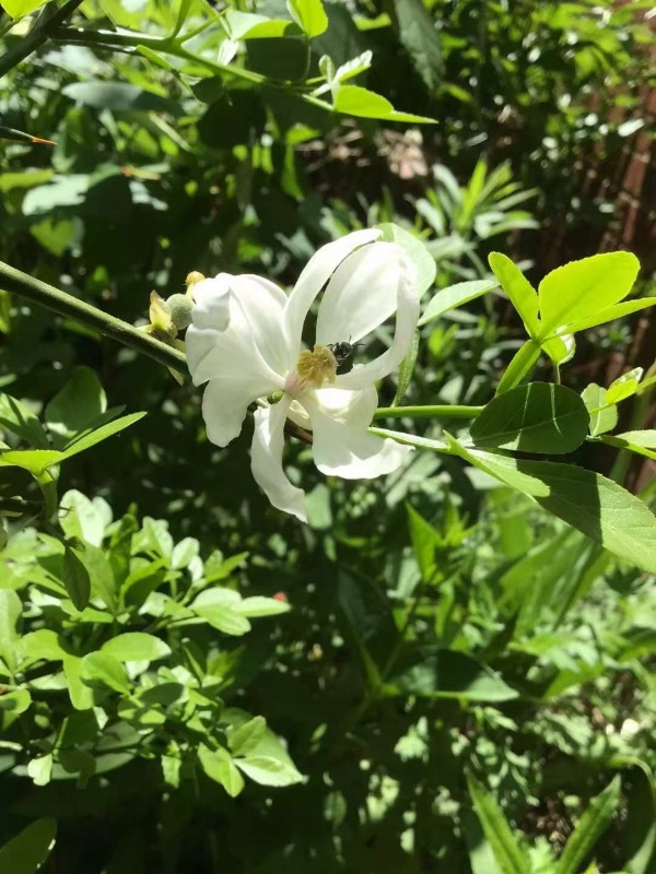 注:多伦多枳(Citrus trifoliata ‘Toronto’)此轮花开共计花蕾64,约60朵完全花竞相开放,雌雄同花7,结果实6,其余为雌蕊退化的雄花,其中花萼瓣化3,花萼完全瓣化成重瓣1。