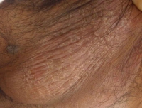 | nán xìng wài yīn bù xià chuí de pí fū náng dài , nèi yòu gāo wán、 fù gāo hé jīng suǒ děng qì guān , yòu shǎo liàng yīn máo jí míng xiǎn sè sù chén zhe |