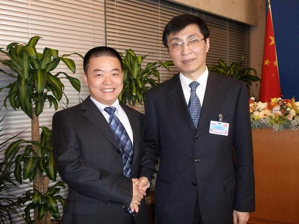 有望成为“三朝元老”的“中南海第一智囊”王沪宁(右)一贯低调,这样的照片很少见。