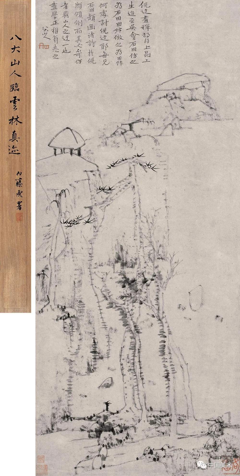 八大长于水墨写意,这是宋元以来兴起的一种画法。发展到明清时代,出现了许多文人水墨画写意大师,八大为其划时代的人物。 在水墨写意画中,又有专擅山水和专擅花鸟之别,八大则两者兼而善之。他的山水画,近师董其昌,远法董源、巨然、郭熙、米芾、黄公望、倪瓒诸家。其运笔的圆润则有着董、巨和黄公望的遗踪,墨法参照了米氏云山,而某些树石的组合形式,显然取自倪瓒。