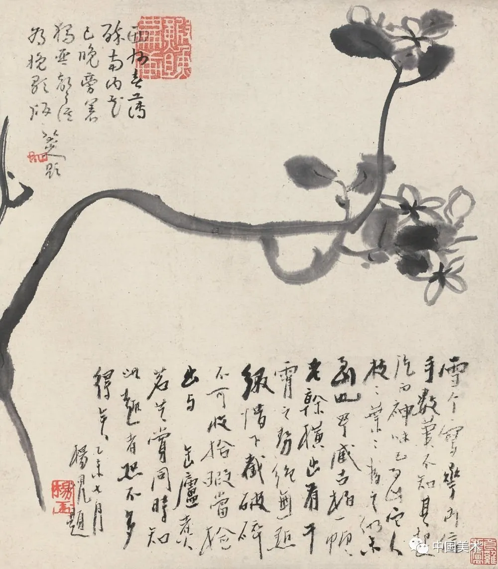 蔡受曾谈到八大为朋友所作的一幅画:“雪师为徂徕叶子作扇画:巨月一轮,月心兰一朵,其月角作梅花。题诗云:“西江秋正月轮弧,永夜焚香太极图。梦到云深又无极,如何相伴有情夫。”八大画的是月、梅等,却从太极、无极中着意,所循是传统画学中太极梅花的思路。宋理学家周敦颐《太极图 易说》云:“自无极而为太极,太极动而生阳,动极而静;静而生阴,静极复动。一动一静,互为其根。分阴分阳,两极立焉。”周氏以“无极而太极”为万物之源,这个“无极而太极”,就是一圆。朱熹云:“○者,无极而太极也。”宋代以来,很多画家从无极太极角度来谈梅的象征意义。在八大看来,他画的是梅花,是世界的―个点,在这点中可见―个“圆”(太极)。八大涛云:“大禅―粒粟,可吸四獬(海)水。”一即是一切,所谓恒河沙数,一尘观之;浩瀚大海,一沤见之。他在《河上花图》中也说:“实相无相一粒莲花子”,一粒莲花子就是一个世界,所谓“世界莲花里”,就是这个意思。