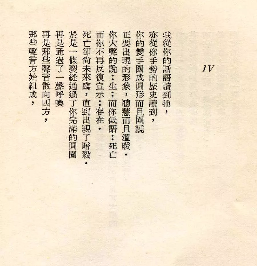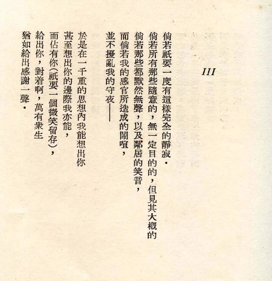 然而这种题材在中国诗中,似为新的对象。实则观念与信仰,皆与情感密不可分。一位真正的诗人的感性,必然如此。而诗为全人格的表现则观念、信仰与情感皆有所流露,自不足奇。再,我们亦常对观念或信仰有所动于情感。观念与信仰的字语又可作为譬喻之一种,有时与意象的运用实异曲而同工。诗的领域之推广,于此有甚大关系。