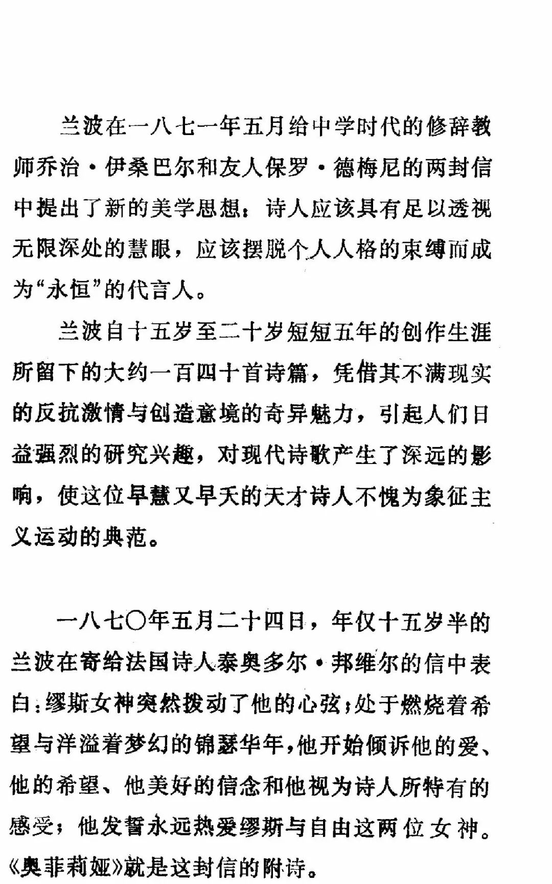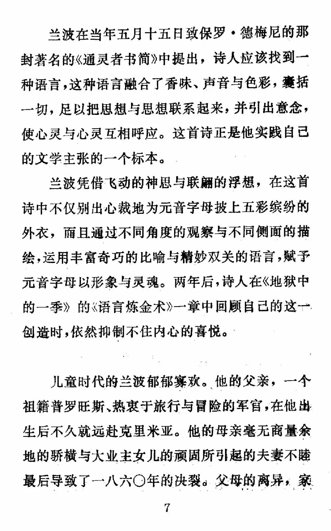 兰波出生于法国东北部沙勒维尔乡村的一个中产阶级家庭。少年时代的兰波是一个好动而才华横溢的学生。15岁那年,他就能以拉丁文写作各种诗歌并赢得了很多奖赏。