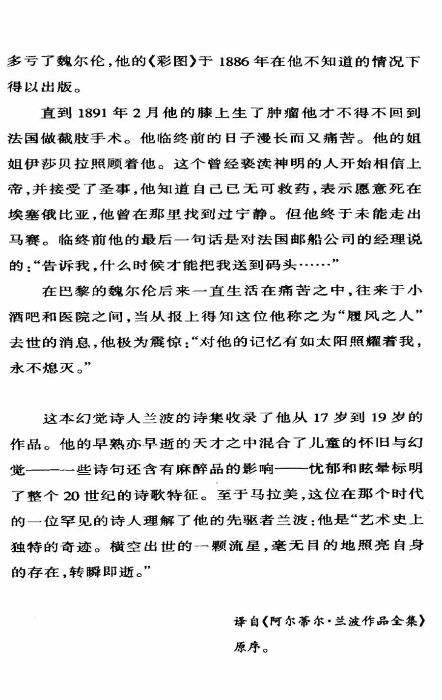 强·尼可拉·阿瑟·兰波(法语:Jean Nicolas Arthur Rimbaud,1854年10月20日-1891年11月10日),或译阿尔图尔·兰波、韩波、林包德,19世纪法国著名诗人,创作时期仅在14-19岁,之后便停笔不作。受法国象征主义诗歌影响,超现实主义诗歌的鼻祖。