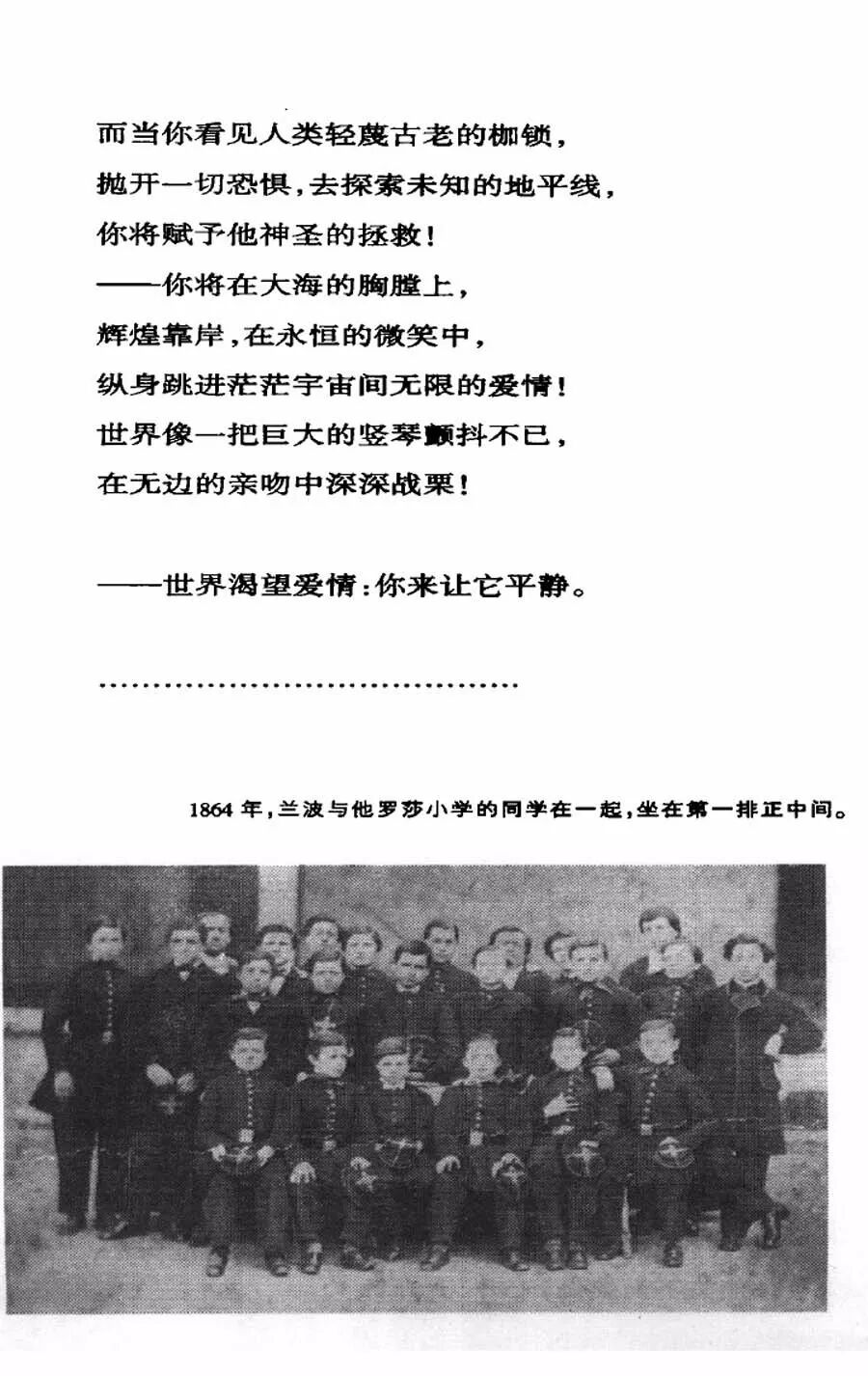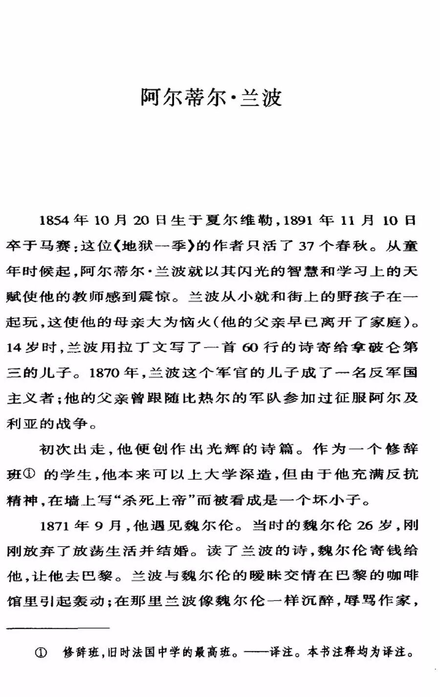 兰波出生于法国东北部沙勒维尔乡村的一个中产阶级家庭。少年时代的兰波是一个好动而才华横溢的学生。15岁那年,他就能以拉丁文写作各种诗歌并赢得了很多奖赏。