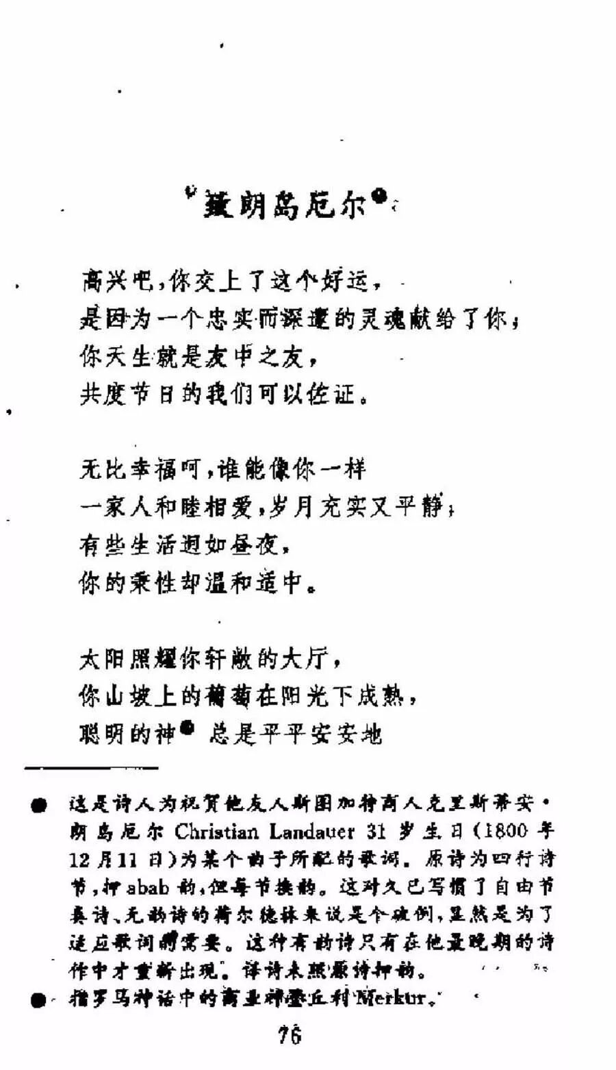 约翰·克里斯蒂安·弗里德里希·荷尔德林(Johann Christian Friedrich Hölderlin ,1770年3月20日-1843年3月7日),是一名德国浪漫派诗人。他将古典希腊诗文移植到德语中。其作品在20世纪才被重视。被认为是世界文学领域里最伟大的诗人之一。