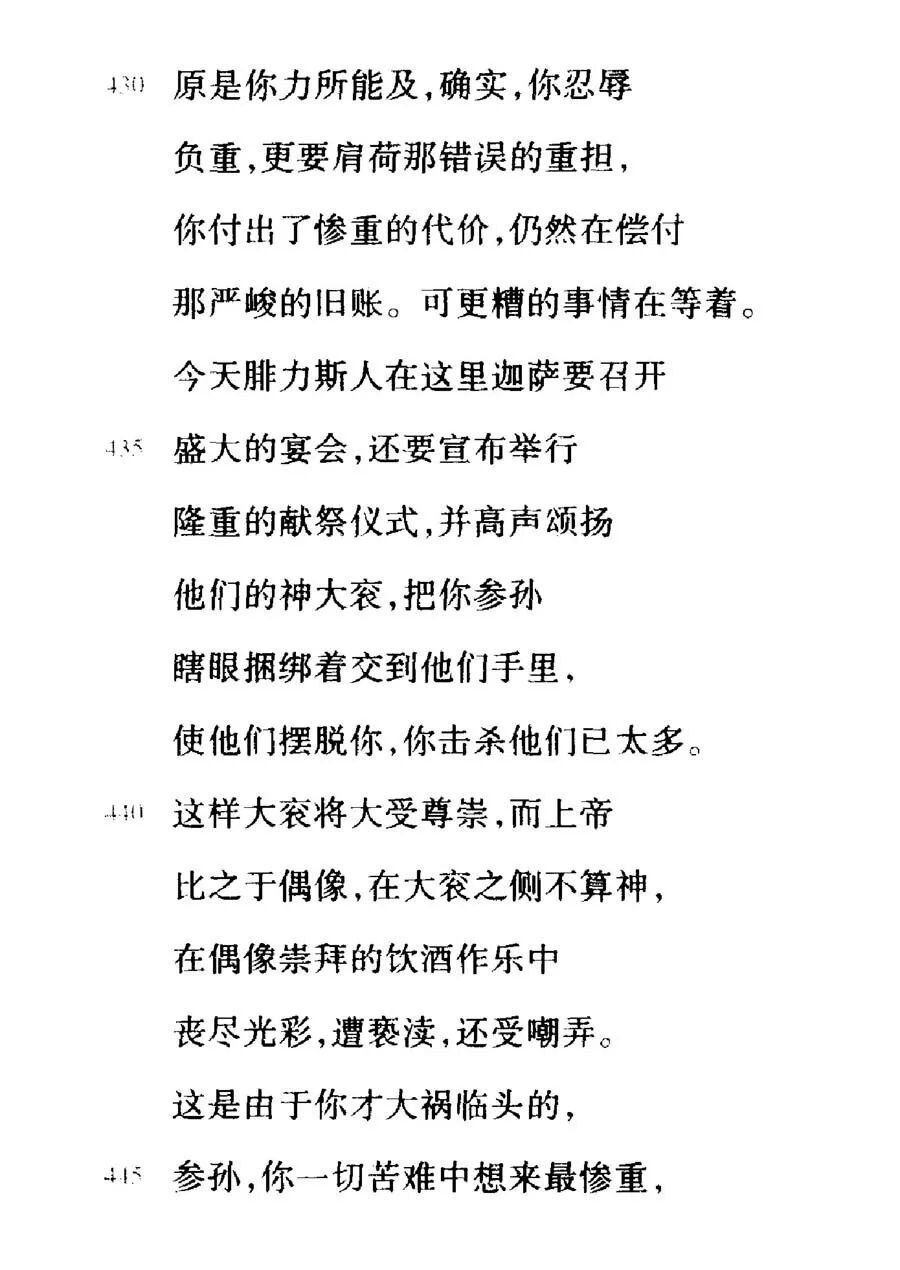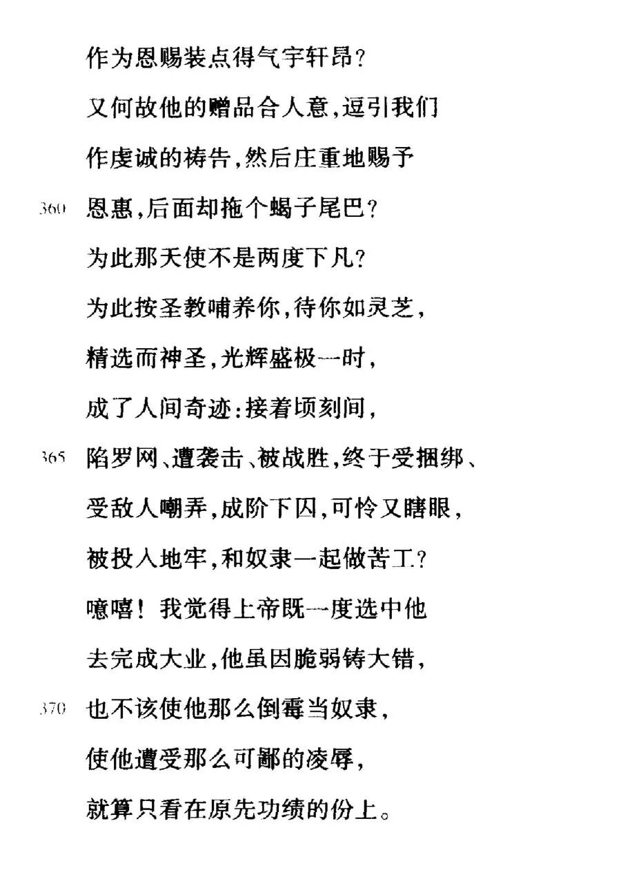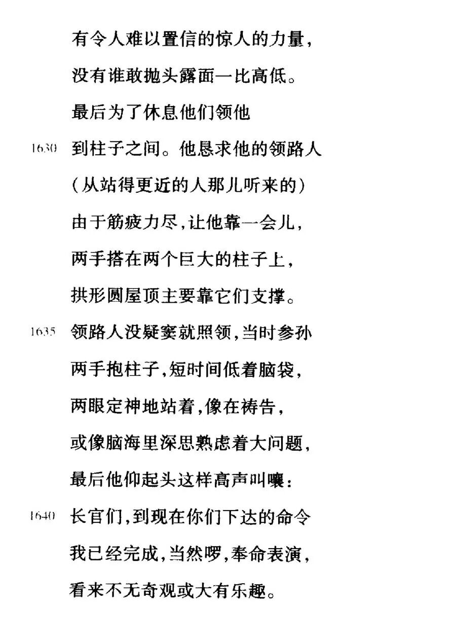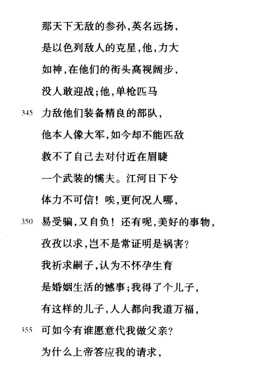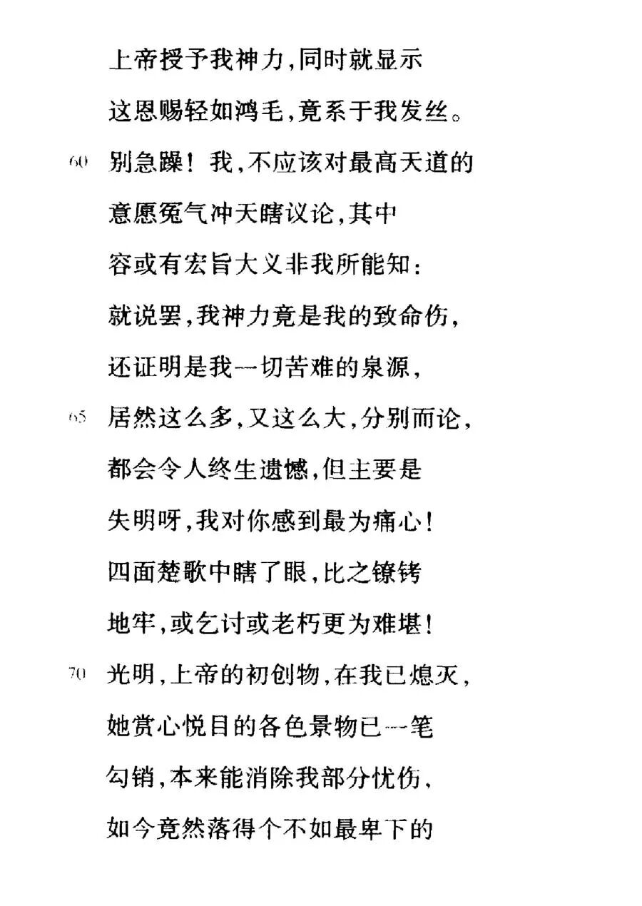 斗士参孙》是英国文学中最出色的希腊式古典悲剧。具有超人勇力的参孙遭妻子出卖失去了神力,且双目失明,身陷囹圄,但他仍力抗强暴,终与敌人同归于尽。一身正气,勇于牺牲的参孙的形象,正是作者悲壮经历的写照。晚年的弥尔顿虽目盲却依然壮怀激烈,他将炽热的情感倾注笔端,使这部无韵诗剧更具有庄严灿烂之美。本书译者金发燊为我国资深翻译家,对弥氏著作有独到的见解。译文信、达、雅三者咸备。诗的前半部分,不断地嗟叹命运于他的残酷。在诗的开篇,就是他的朋友们反复比较参孙被俘前后的落差之大。在被俘前,参孙能够用一块驴腮骨击杀一千人,还能够徒手撕碎一头狮子,他拥有上帝赐予的神力;但是现在却脚戴镣铐,双眼被剜,在牢里做着最卑下的苦力。而在参孙自己看来,他从过去一个伟大的英雄,落到这步田地,更比一般奴隶而不如。他哀叹道,他被赋予了伟大的力量,但却没有同时被赋予相匹配的智慧。这才使得他虽然拥有无限勇力,但却最终被从心灵的缺口击溃,导致了现在的惨境。但是,他也承认,一切都是咎由自取,上帝并没有过错。是因为他贪恋美色,自失分寸,把上帝赐予的秘密告诉了仇敌的女儿。可以说,被俘是他的认识的转折点。他能够认识到过错在于自己,而非上帝,也是他把握上帝的道的开端。在被俘之前,他如此的骄傲,以至于认为所有的荣誉都归于自己。他被巨大的荣誉蒙蔽了双眼,变成了一个轻率、盲目、鲁莽的人。在他被锁进监牢里之后,他才真正明白,自己之所以力大无穷,创造了伟大功绩,全是由于上帝的赐予,因此,所有的伟大的功绩都只能被看作是上帝的荣光。