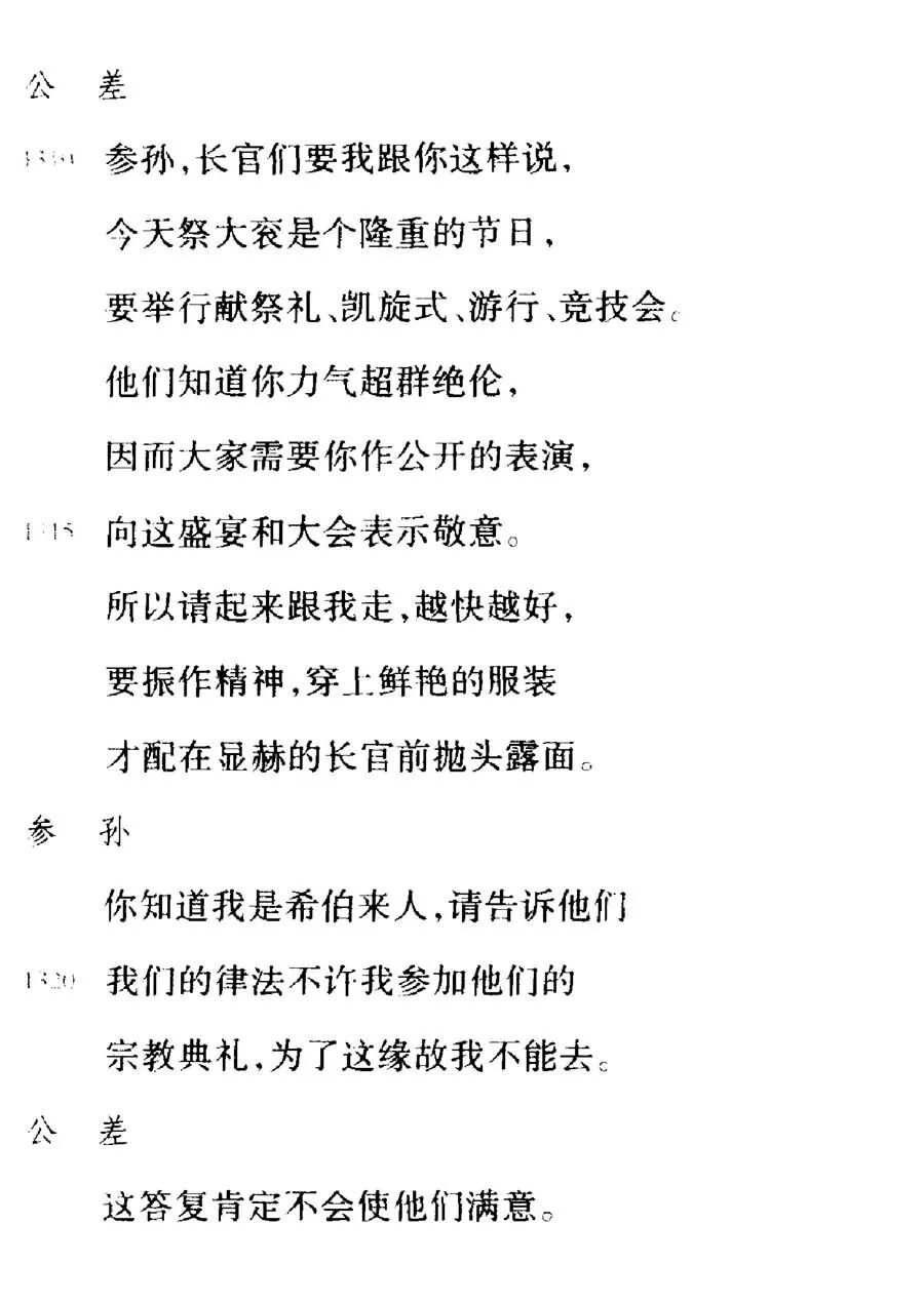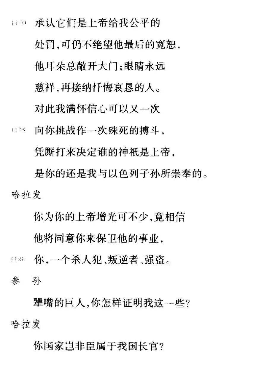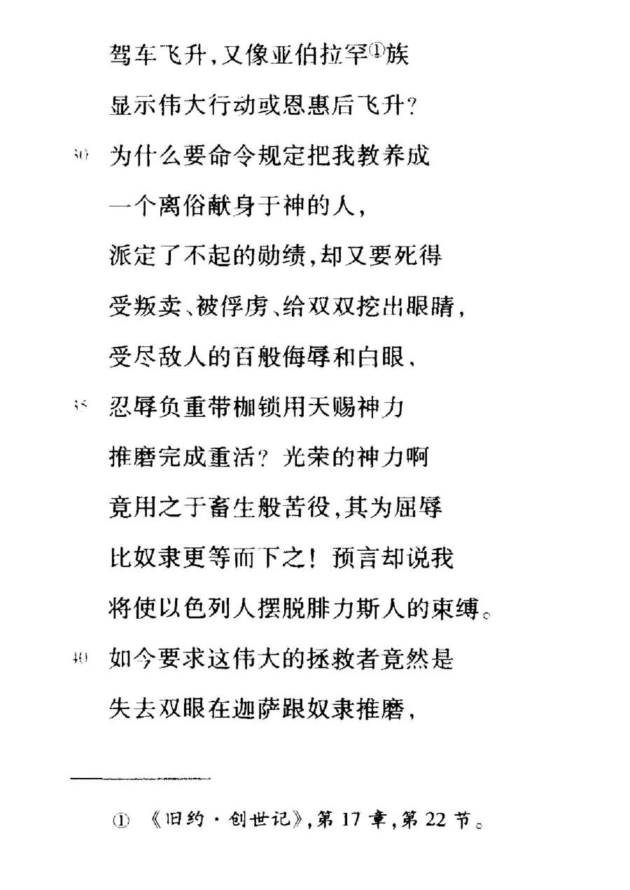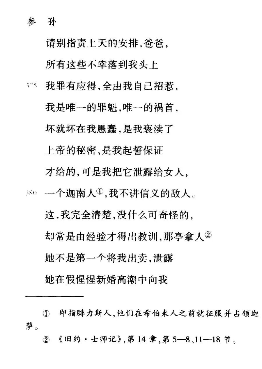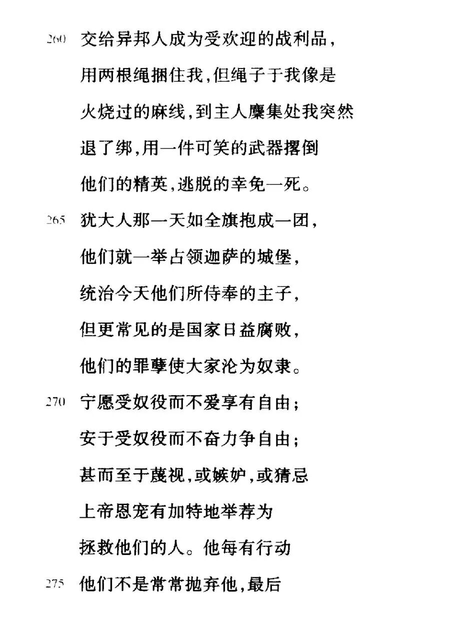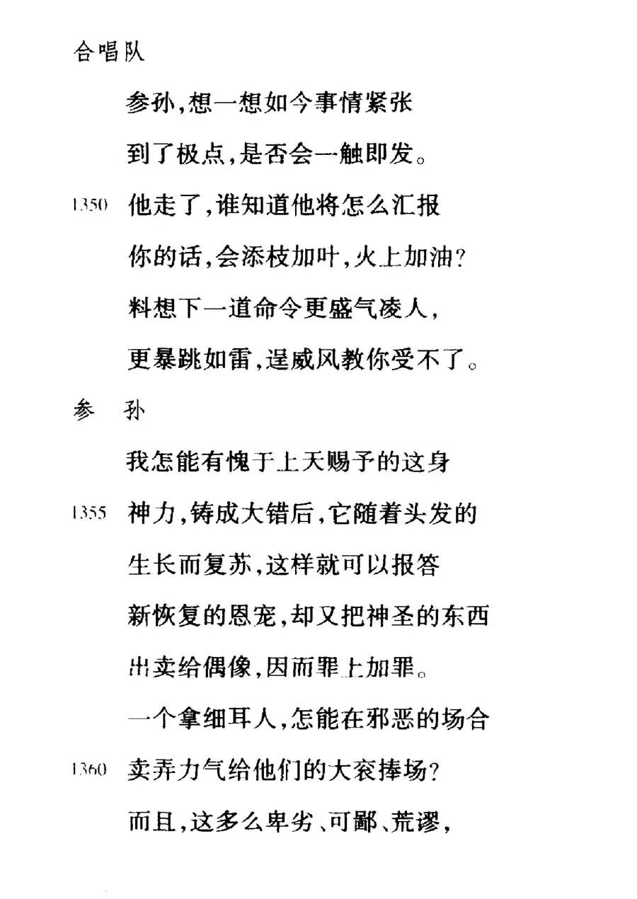 斗士参孙》是英国文学中最出色的希腊式古典悲剧。具有超人勇力的参孙遭妻子出卖失去了神力,且双目失明,身陷囹圄,但他仍力抗强暴,终与敌人同归于尽。一身正气,勇于牺牲的参孙的形象,正是作者悲壮经历的写照。晚年的弥尔顿虽目盲却依然壮怀激烈,他将炽热的情感倾注笔端,使这部无韵诗剧更具有庄严灿烂之美。本书译者金发燊为我国资深翻译家,对弥氏著作有独到的见解。译文信、达、雅三者咸备。诗的前半部分,不断地嗟叹命运于他的残酷。在诗的开篇,就是他的朋友们反复比较参孙被俘前后的落差之大。在被俘前,参孙能够用一块驴腮骨击杀一千人,还能够徒手撕碎一头狮子,他拥有上帝赐予的神力;但是现在却脚戴镣铐,双眼被剜,在牢里做着最卑下的苦力。而在参孙自己看来,他从过去一个伟大的英雄,落到这步田地,更比一般奴隶而不如。他哀叹道,他被赋予了伟大的力量,但却没有同时被赋予相匹配的智慧。这才使得他虽然拥有无限勇力,但却最终被从心灵的缺口击溃,导致了现在的惨境。但是,他也承认,一切都是咎由自取,上帝并没有过错。是因为他贪恋美色,自失分寸,把上帝赐予的秘密告诉了仇敌的女儿。可以说,被俘是他的认识的转折点。他能够认识到过错在于自己,而非上帝,也是他把握上帝的道的开端。在被俘之前,他如此的骄傲,以至于认为所有的荣誉都归于自己。他被巨大的荣誉蒙蔽了双眼,变成了一个轻率、盲目、鲁莽的人。在他被锁进监牢里之后,他才真正明白,自己之所以力大无穷,创造了伟大功绩,全是由于上帝的赐予,因此,所有的伟大的功绩都只能被看作是上帝的荣光。