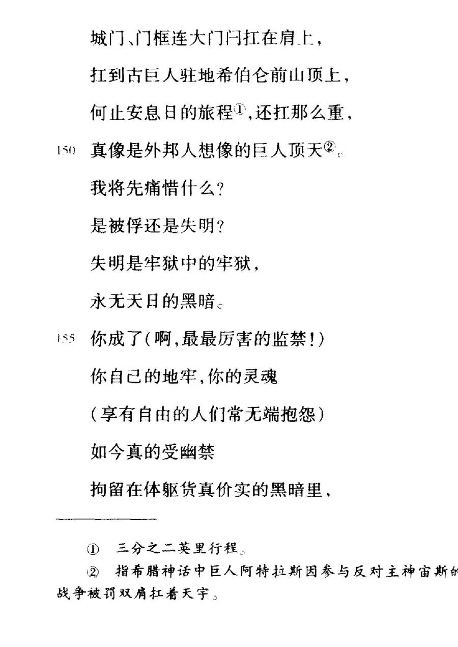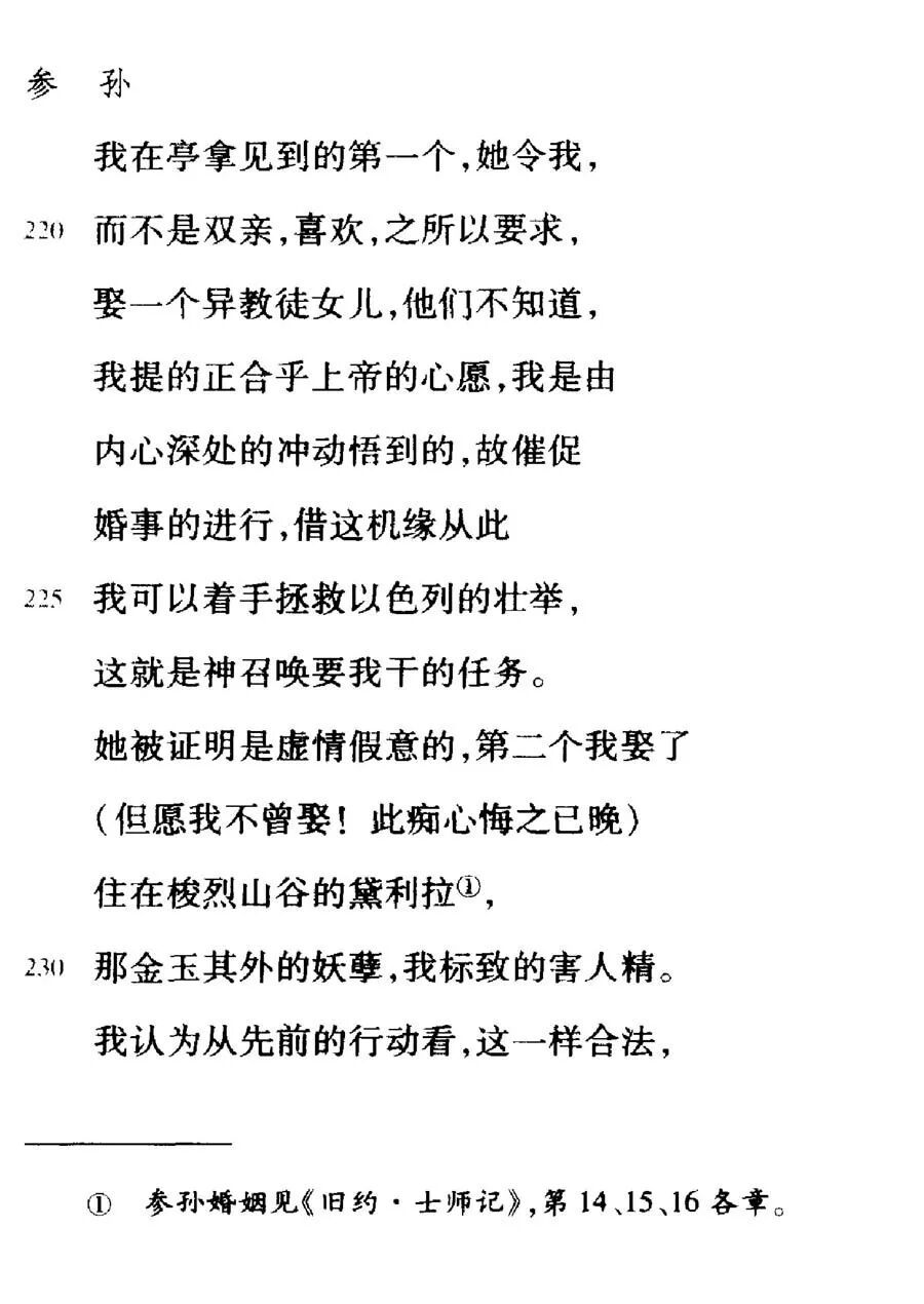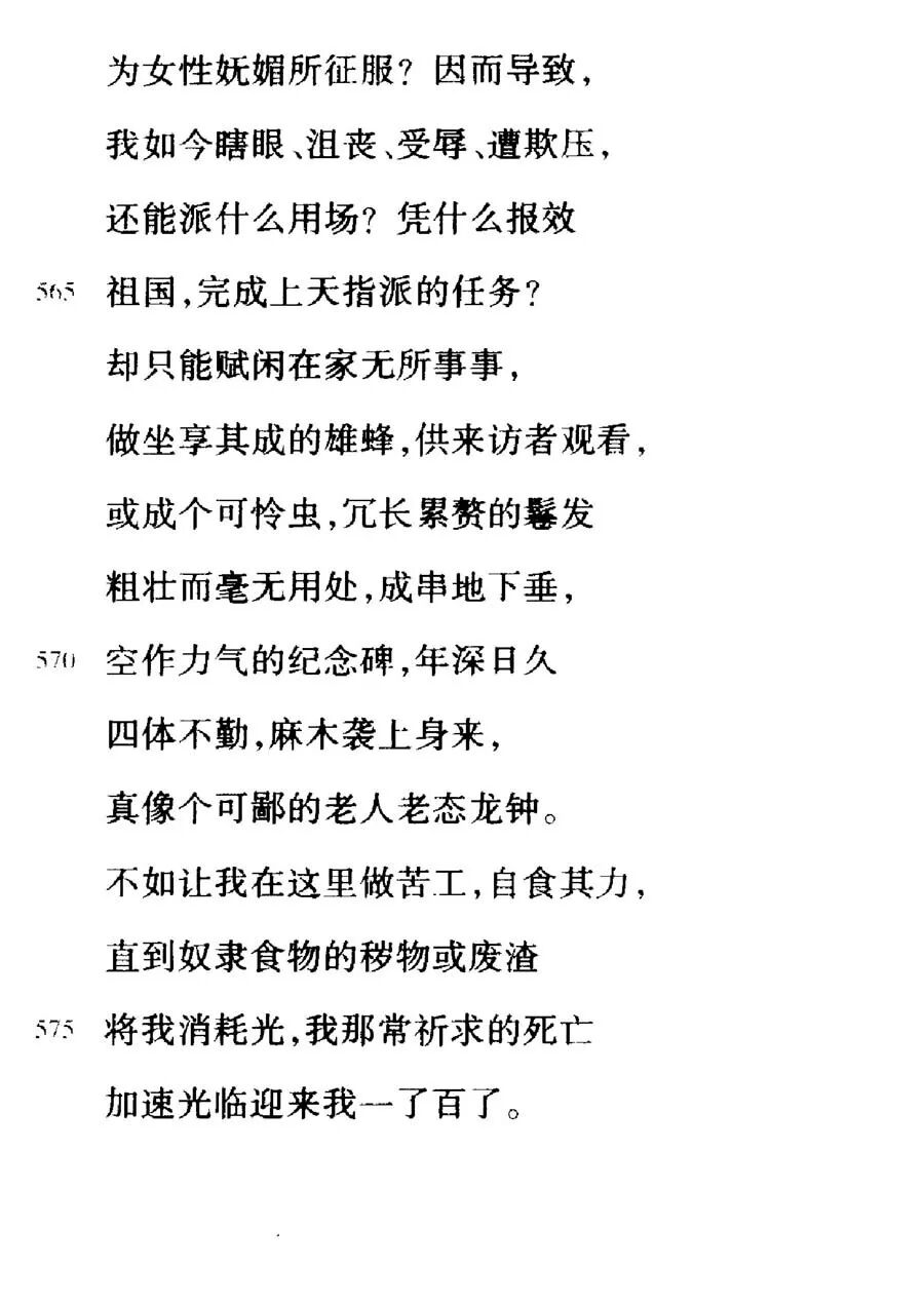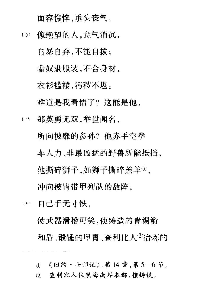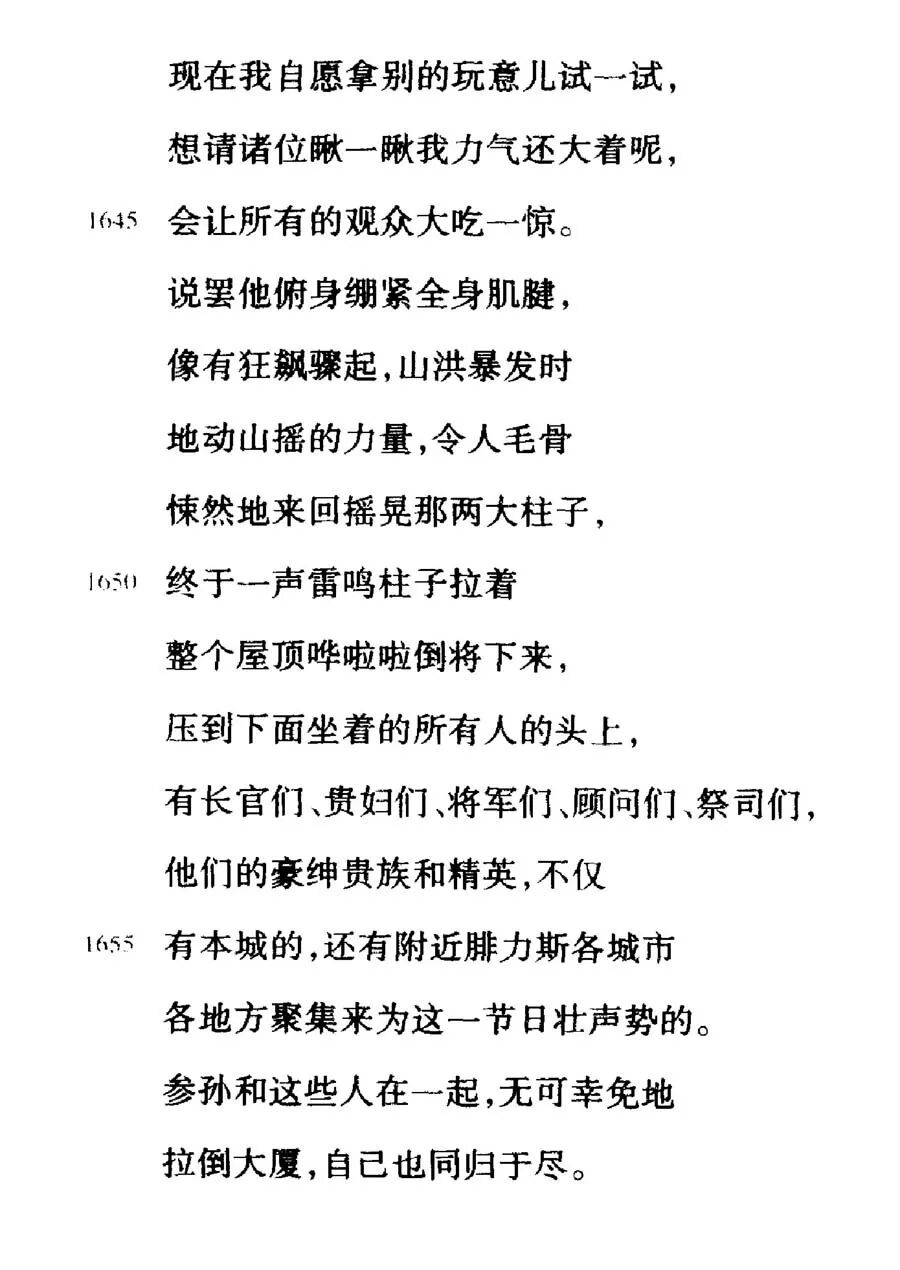斗士参孙》是英国文学中最出色的希腊式古典悲剧。具有超人勇力的参孙遭妻子出卖失去了神力,且双目失明,身陷囹圄,但他仍力抗强暴,终与敌人同归于尽。一身正气,勇于牺牲的参孙的形象,正是作者悲壮经历的写照。晚年的弥尔顿虽目盲却依然壮怀激烈,他将炽热的情感倾注笔端,使这部无韵诗剧更具有庄严灿烂之美。本书译者金发燊为我国资深翻译家,对弥氏著作有独到的见解。译文信、达、雅三者咸备。诗的前半部分,不断地嗟叹命运于他的残酷。在诗的开篇,就是他的朋友们反复比较参孙被俘前后的落差之大。在被俘前,参孙能够用一块驴腮骨击杀一千人,还能够徒手撕碎一头狮子,他拥有上帝赐予的神力;但是现在却脚戴镣铐,双眼被剜,在牢里做着最卑下的苦力。而在参孙自己看来,他从过去一个伟大的英雄,落到这步田地,更比一般奴隶而不如。他哀叹道,他被赋予了伟大的力量,但却没有同时被赋予相匹配的智慧。这才使得他虽然拥有无限勇力,但却最终被从心灵的缺口击溃,导致了现在的惨境。但是,他也承认,一切都是咎由自取,上帝并没有过错。是因为他贪恋美色,自失分寸,把上帝赐予的秘密告诉了仇敌的女儿。可以说,被俘是他的认识的转折点。他能够认识到过错在于自己,而非上帝,也是他把握上帝的道的开端。在被俘之前,他如此的骄傲,以至于认为所有的荣誉都归于自己。他被巨大的荣誉蒙蔽了双眼,变成了一个轻率、盲目、鲁莽的人。在他被锁进监牢里之后,他才真正明白,自己之所以力大无穷,创造了伟大功绩,全是由于上帝的赐予,因此,所有的伟大的功绩都只能被看作是上帝的荣光。