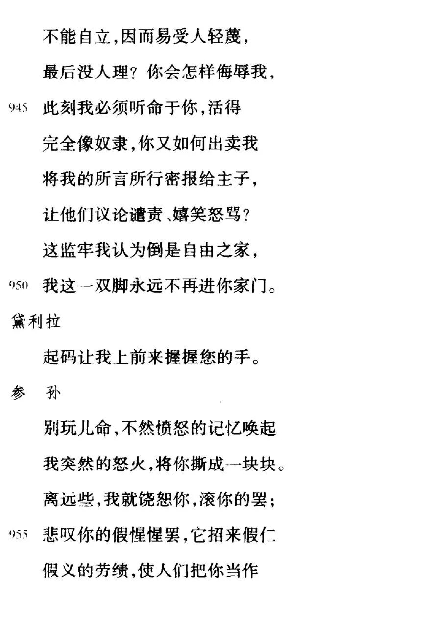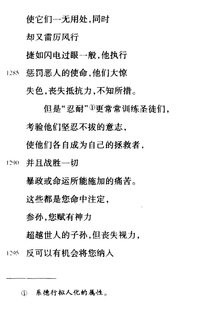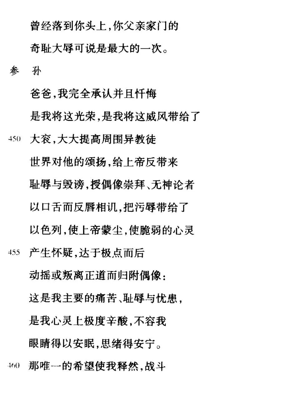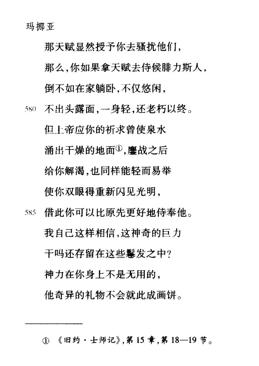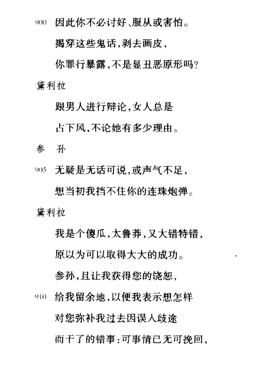 斗士参孙》是英国文学中最出色的希腊式古典悲剧。具有超人勇力的参孙遭妻子出卖失去了神力,且双目失明,身陷囹圄,但他仍力抗强暴,终与敌人同归于尽。一身正气,勇于牺牲的参孙的形象,正是作者悲壮经历的写照。晚年的弥尔顿虽目盲却依然壮怀激烈,他将炽热的情感倾注笔端,使这部无韵诗剧更具有庄严灿烂之美。本书译者金发燊为我国资深翻译家,对弥氏著作有独到的见解。译文信、达、雅三者咸备。诗的前半部分,不断地嗟叹命运于他的残酷。在诗的开篇,就是他的朋友们反复比较参孙被俘前后的落差之大。在被俘前,参孙能够用一块驴腮骨击杀一千人,还能够徒手撕碎一头狮子,他拥有上帝赐予的神力;但是现在却脚戴镣铐,双眼被剜,在牢里做着最卑下的苦力。而在参孙自己看来,他从过去一个伟大的英雄,落到这步田地,更比一般奴隶而不如。他哀叹道,他被赋予了伟大的力量,但却没有同时被赋予相匹配的智慧。这才使得他虽然拥有无限勇力,但却最终被从心灵的缺口击溃,导致了现在的惨境。但是,他也承认,一切都是咎由自取,上帝并没有过错。是因为他贪恋美色,自失分寸,把上帝赐予的秘密告诉了仇敌的女儿。可以说,被俘是他的认识的转折点。他能够认识到过错在于自己,而非上帝,也是他把握上帝的道的开端。在被俘之前,他如此的骄傲,以至于认为所有的荣誉都归于自己。他被巨大的荣誉蒙蔽了双眼,变成了一个轻率、盲目、鲁莽的人。在他被锁进监牢里之后,他才真正明白,自己之所以力大无穷,创造了伟大功绩,全是由于上帝的赐予,因此,所有的伟大的功绩都只能被看作是上帝的荣光。