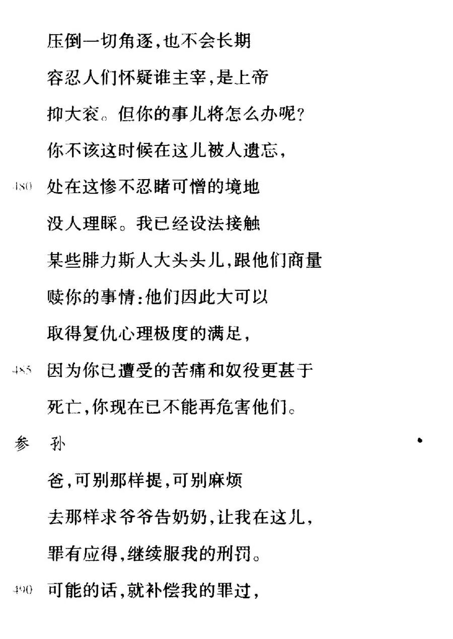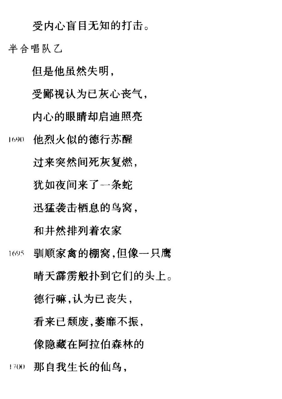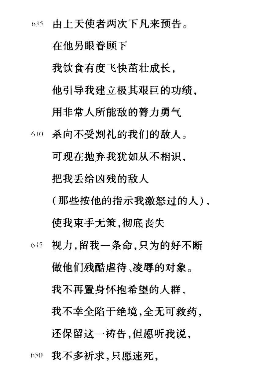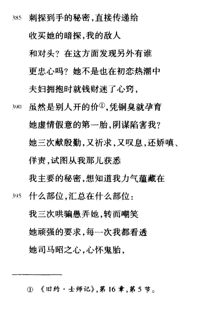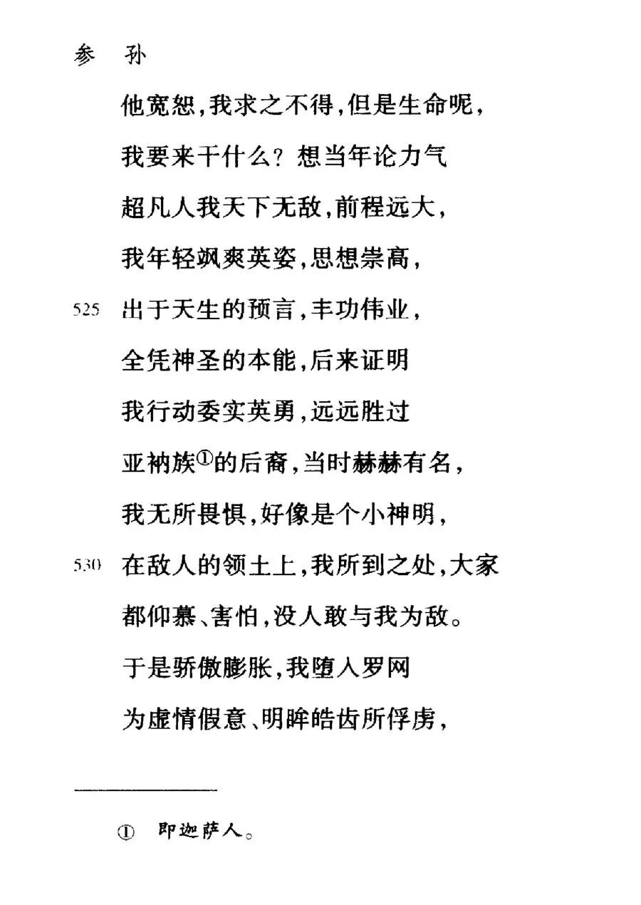 斗士参孙》是英国文学中最出色的希腊式古典悲剧。具有超人勇力的参孙遭妻子出卖失去了神力,且双目失明,身陷囹圄,但他仍力抗强暴,终与敌人同归于尽。一身正气,勇于牺牲的参孙的形象,正是作者悲壮经历的写照。晚年的弥尔顿虽目盲却依然壮怀激烈,他将炽热的情感倾注笔端,使这部无韵诗剧更具有庄严灿烂之美。本书译者金发燊为我国资深翻译家,对弥氏著作有独到的见解。译文信、达、雅三者咸备。诗的前半部分,不断地嗟叹命运于他的残酷。在诗的开篇,就是他的朋友们反复比较参孙被俘前后的落差之大。在被俘前,参孙能够用一块驴腮骨击杀一千人,还能够徒手撕碎一头狮子,他拥有上帝赐予的神力;但是现在却脚戴镣铐,双眼被剜,在牢里做着最卑下的苦力。而在参孙自己看来,他从过去一个伟大的英雄,落到这步田地,更比一般奴隶而不如。他哀叹道,他被赋予了伟大的力量,但却没有同时被赋予相匹配的智慧。这才使得他虽然拥有无限勇力,但却最终被从心灵的缺口击溃,导致了现在的惨境。但是,他也承认,一切都是咎由自取,上帝并没有过错。是因为他贪恋美色,自失分寸,把上帝赐予的秘密告诉了仇敌的女儿。可以说,被俘是他的认识的转折点。他能够认识到过错在于自己,而非上帝,也是他把握上帝的道的开端。在被俘之前,他如此的骄傲,以至于认为所有的荣誉都归于自己。他被巨大的荣誉蒙蔽了双眼,变成了一个轻率、盲目、鲁莽的人。在他被锁进监牢里之后,他才真正明白,自己之所以力大无穷,创造了伟大功绩,全是由于上帝的赐予,因此,所有的伟大的功绩都只能被看作是上帝的荣光。