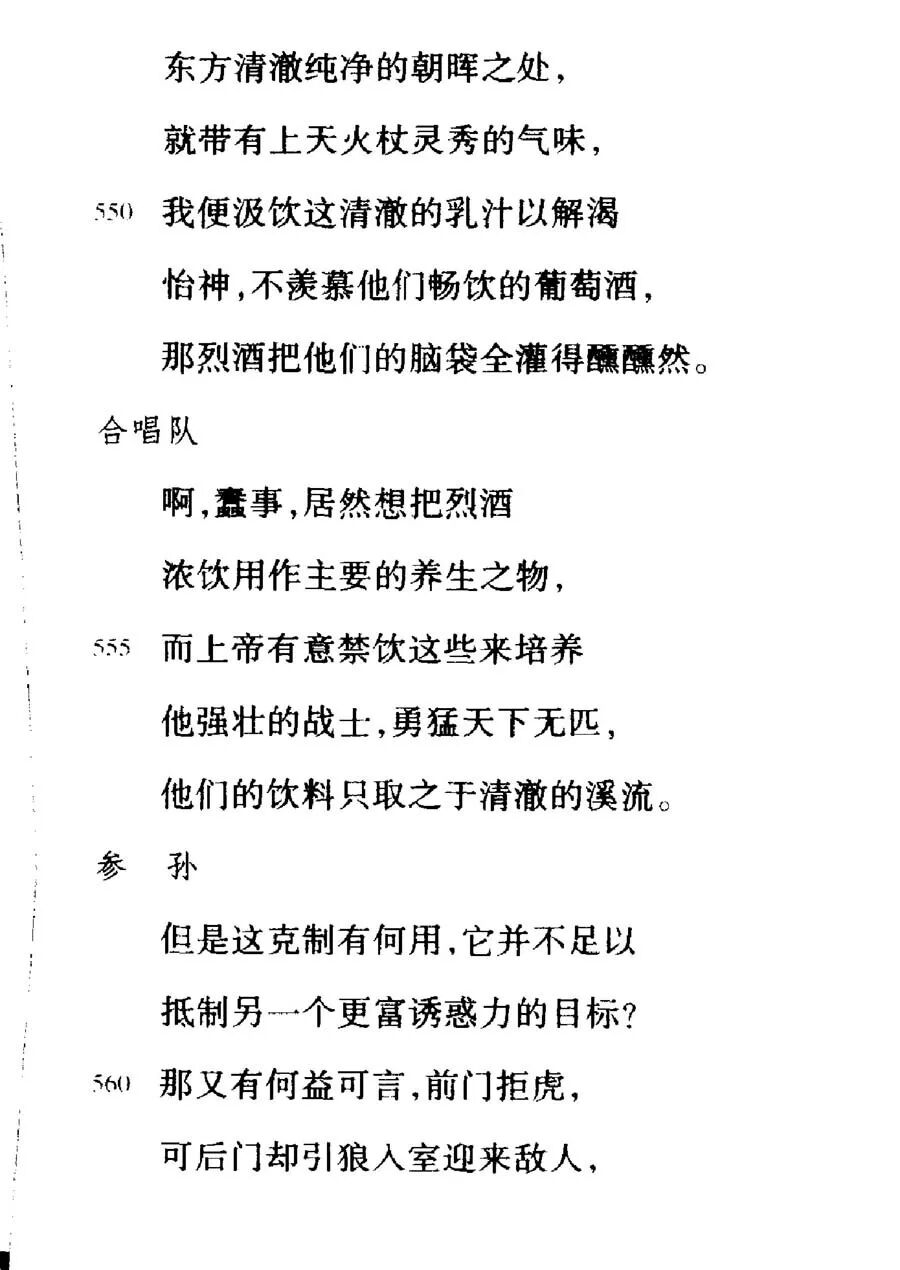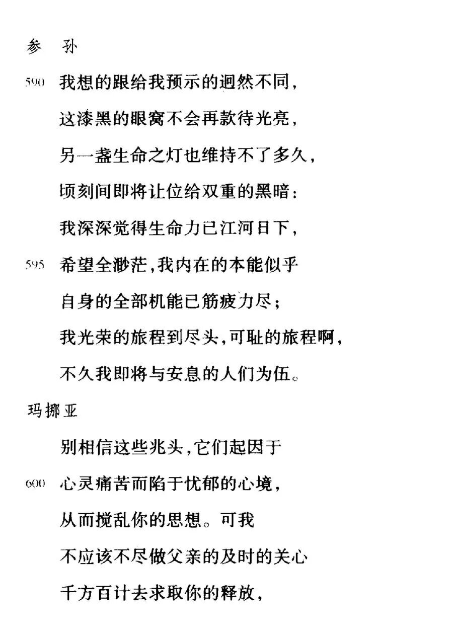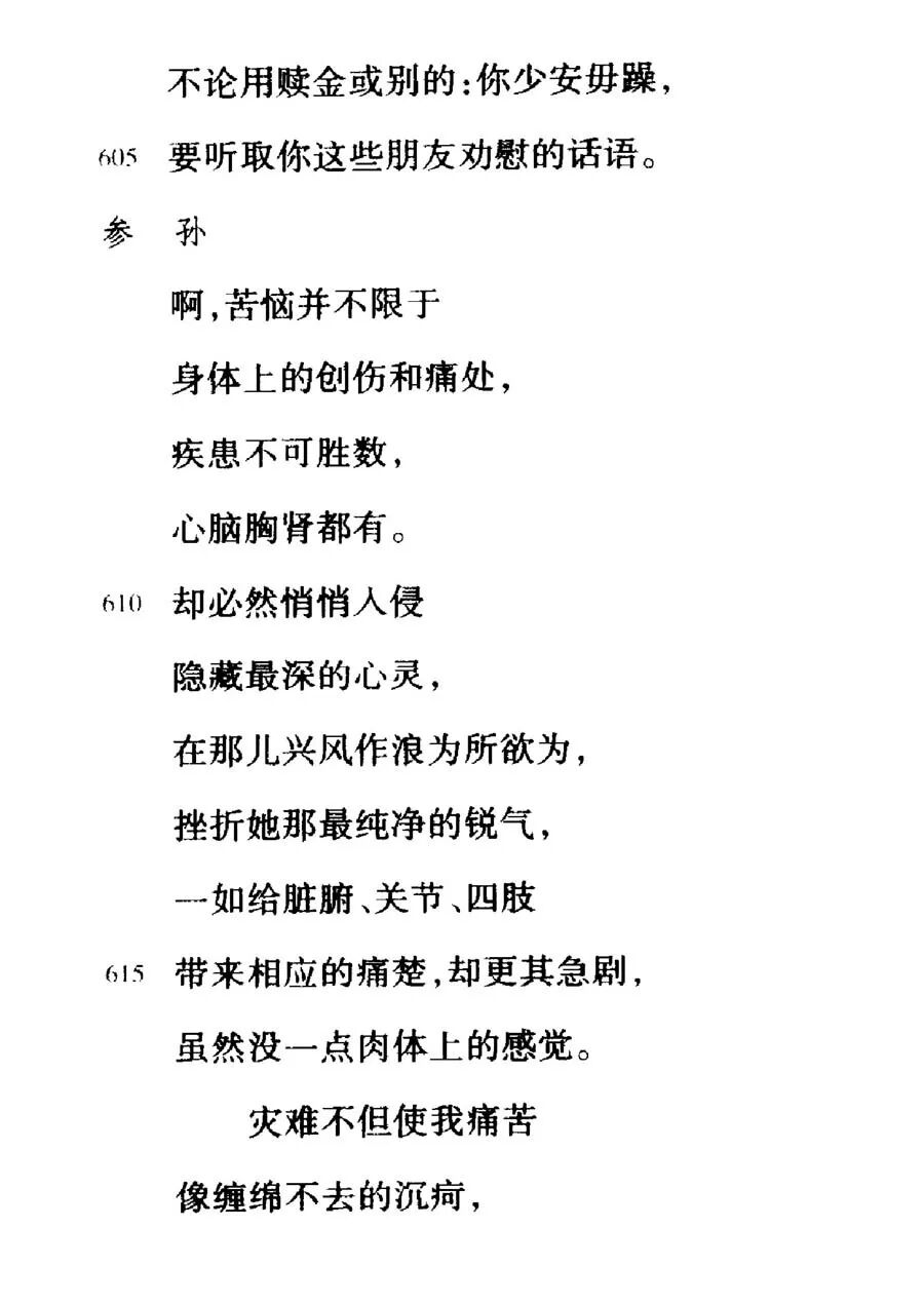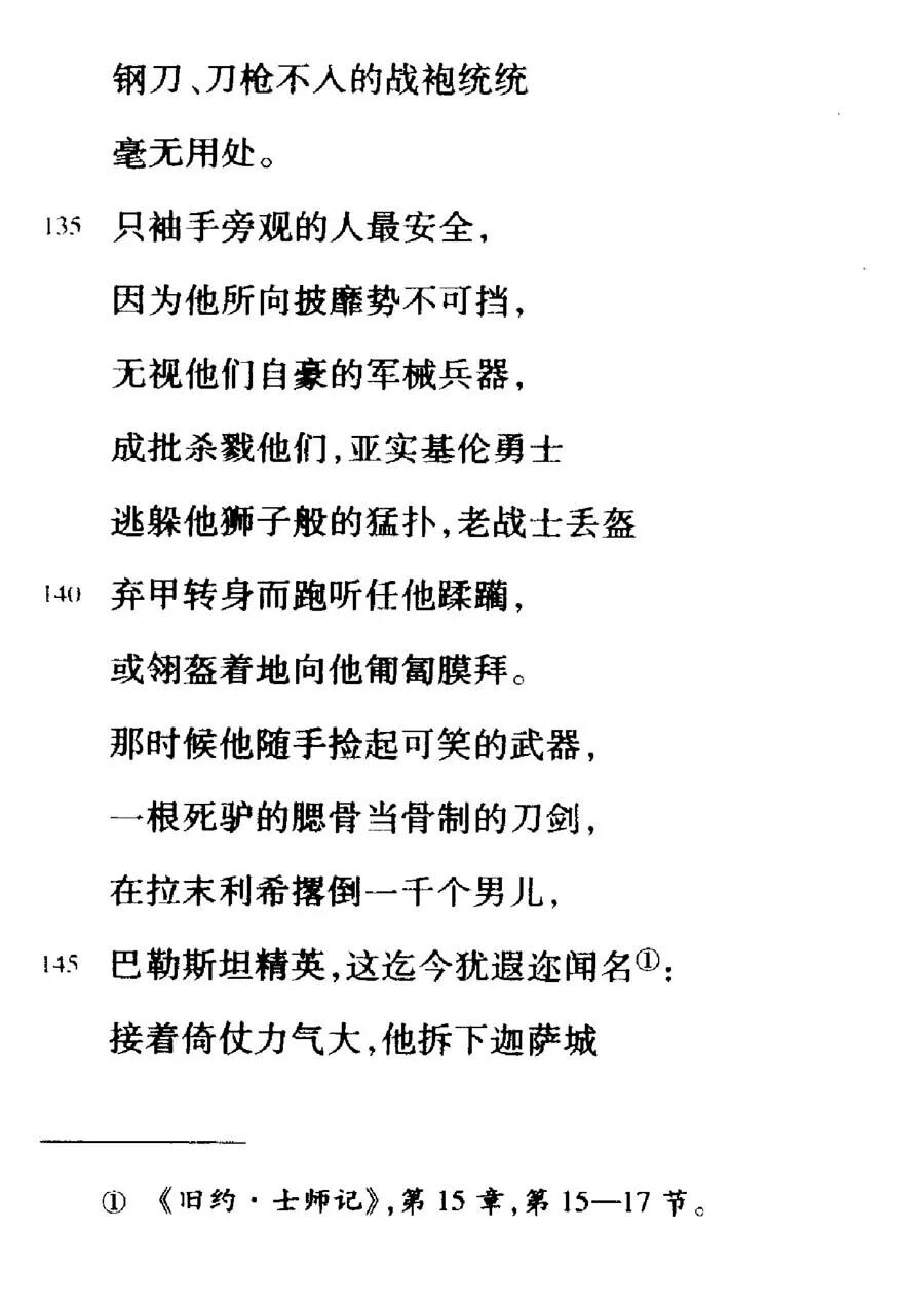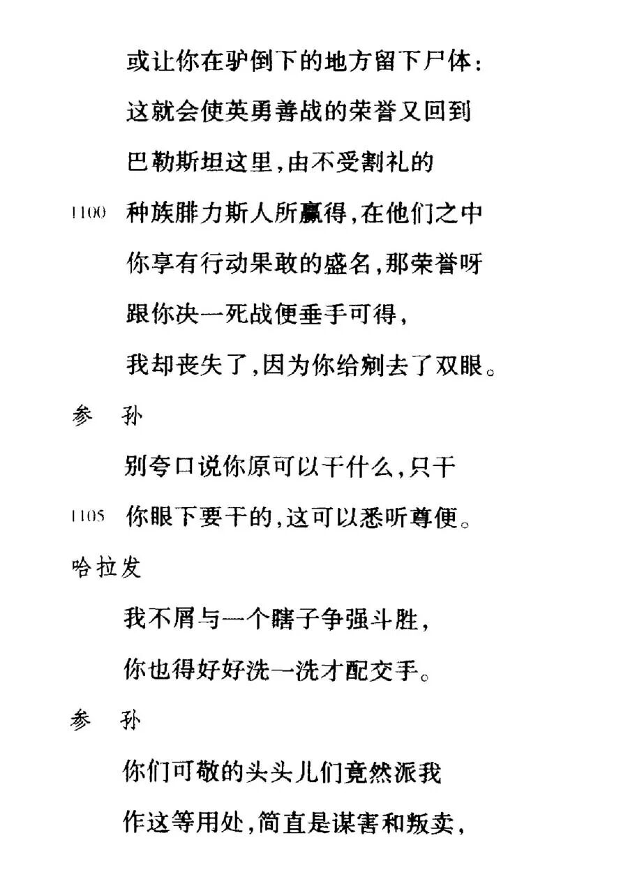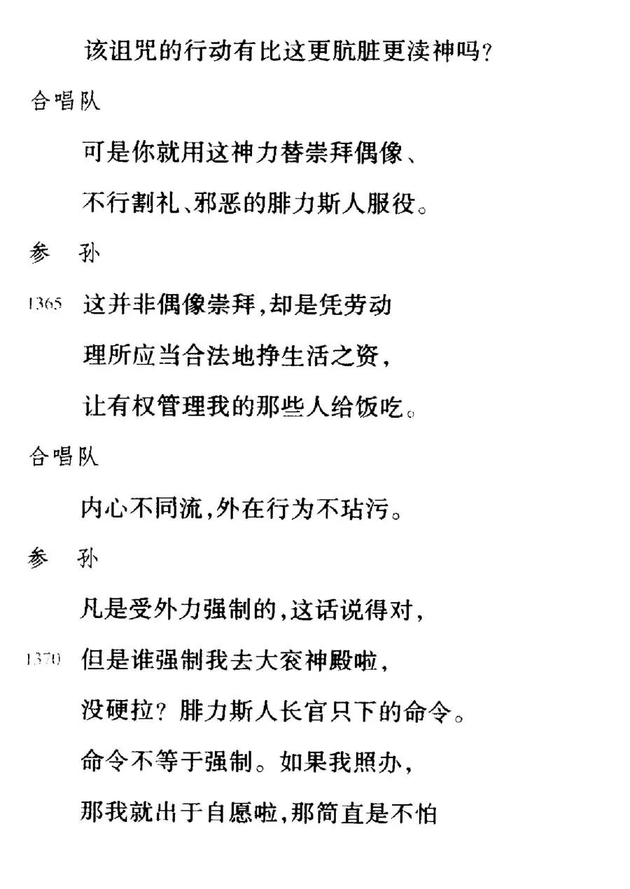斗士参孙》是英国文学中最出色的希腊式古典悲剧。具有超人勇力的参孙遭妻子出卖失去了神力,且双目失明,身陷囹圄,但他仍力抗强暴,终与敌人同归于尽。一身正气,勇于牺牲的参孙的形象,正是作者悲壮经历的写照。晚年的弥尔顿虽目盲却依然壮怀激烈,他将炽热的情感倾注笔端,使这部无韵诗剧更具有庄严灿烂之美。本书译者金发燊为我国资深翻译家,对弥氏著作有独到的见解。译文信、达、雅三者咸备。诗的前半部分,不断地嗟叹命运于他的残酷。在诗的开篇,就是他的朋友们反复比较参孙被俘前后的落差之大。在被俘前,参孙能够用一块驴腮骨击杀一千人,还能够徒手撕碎一头狮子,他拥有上帝赐予的神力;但是现在却脚戴镣铐,双眼被剜,在牢里做着最卑下的苦力。而在参孙自己看来,他从过去一个伟大的英雄,落到这步田地,更比一般奴隶而不如。他哀叹道,他被赋予了伟大的力量,但却没有同时被赋予相匹配的智慧。这才使得他虽然拥有无限勇力,但却最终被从心灵的缺口击溃,导致了现在的惨境。但是,他也承认,一切都是咎由自取,上帝并没有过错。是因为他贪恋美色,自失分寸,把上帝赐予的秘密告诉了仇敌的女儿。可以说,被俘是他的认识的转折点。他能够认识到过错在于自己,而非上帝,也是他把握上帝的道的开端。在被俘之前,他如此的骄傲,以至于认为所有的荣誉都归于自己。他被巨大的荣誉蒙蔽了双眼,变成了一个轻率、盲目、鲁莽的人。在他被锁进监牢里之后,他才真正明白,自己之所以力大无穷,创造了伟大功绩,全是由于上帝的赐予,因此,所有的伟大的功绩都只能被看作是上帝的荣光。