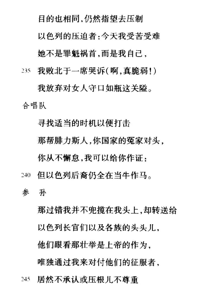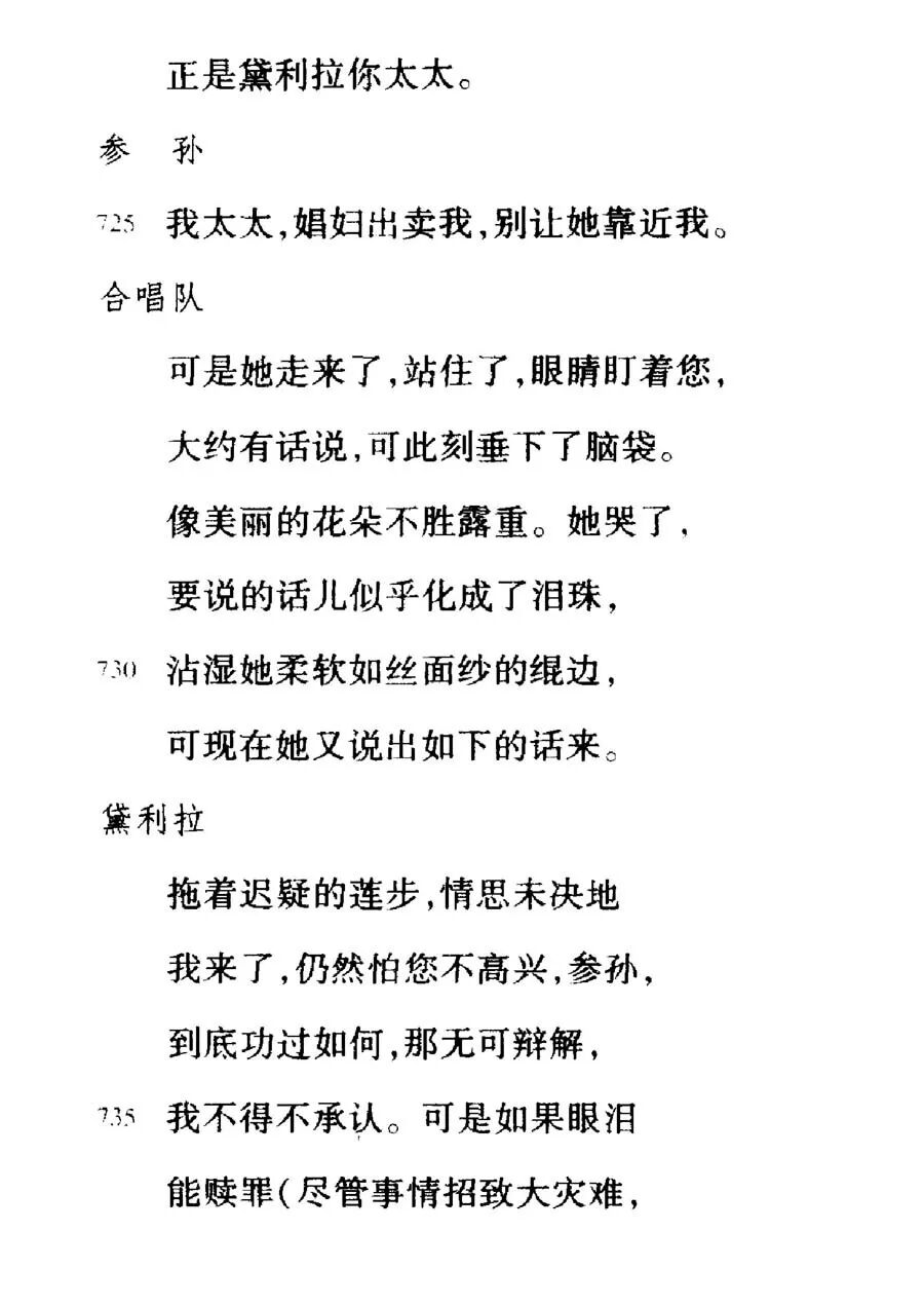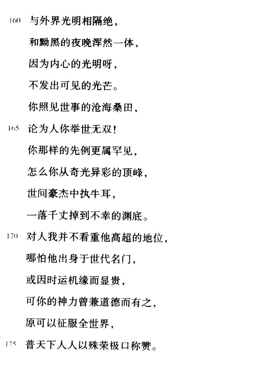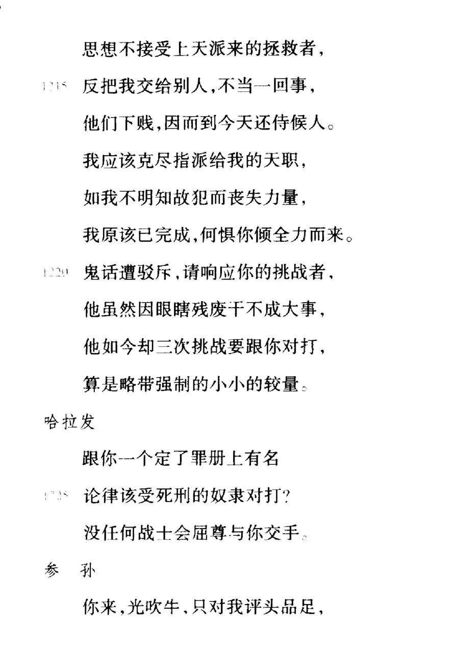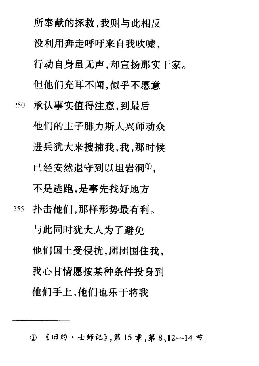 斗士参孙》是英国文学中最出色的希腊式古典悲剧。具有超人勇力的参孙遭妻子出卖失去了神力,且双目失明,身陷囹圄,但他仍力抗强暴,终与敌人同归于尽。一身正气,勇于牺牲的参孙的形象,正是作者悲壮经历的写照。晚年的弥尔顿虽目盲却依然壮怀激烈,他将炽热的情感倾注笔端,使这部无韵诗剧更具有庄严灿烂之美。本书译者金发燊为我国资深翻译家,对弥氏著作有独到的见解。译文信、达、雅三者咸备。诗的前半部分,不断地嗟叹命运于他的残酷。在诗的开篇,就是他的朋友们反复比较参孙被俘前后的落差之大。在被俘前,参孙能够用一块驴腮骨击杀一千人,还能够徒手撕碎一头狮子,他拥有上帝赐予的神力;但是现在却脚戴镣铐,双眼被剜,在牢里做着最卑下的苦力。而在参孙自己看来,他从过去一个伟大的英雄,落到这步田地,更比一般奴隶而不如。他哀叹道,他被赋予了伟大的力量,但却没有同时被赋予相匹配的智慧。这才使得他虽然拥有无限勇力,但却最终被从心灵的缺口击溃,导致了现在的惨境。但是,他也承认,一切都是咎由自取,上帝并没有过错。是因为他贪恋美色,自失分寸,把上帝赐予的秘密告诉了仇敌的女儿。可以说,被俘是他的认识的转折点。他能够认识到过错在于自己,而非上帝,也是他把握上帝的道的开端。在被俘之前,他如此的骄傲,以至于认为所有的荣誉都归于自己。他被巨大的荣誉蒙蔽了双眼,变成了一个轻率、盲目、鲁莽的人。在他被锁进监牢里之后,他才真正明白,自己之所以力大无穷,创造了伟大功绩,全是由于上帝的赐予,因此,所有的伟大的功绩都只能被看作是上帝的荣光。