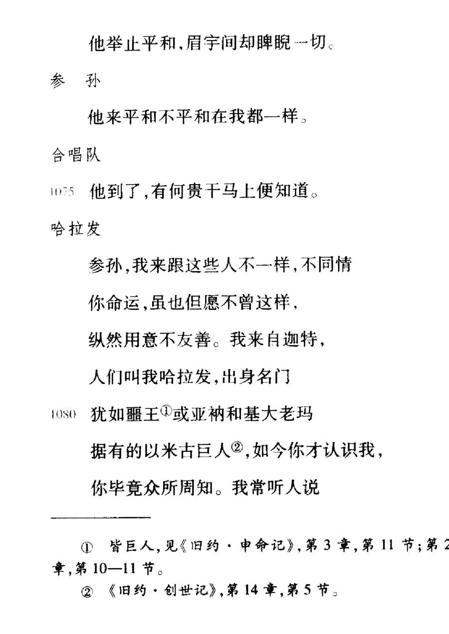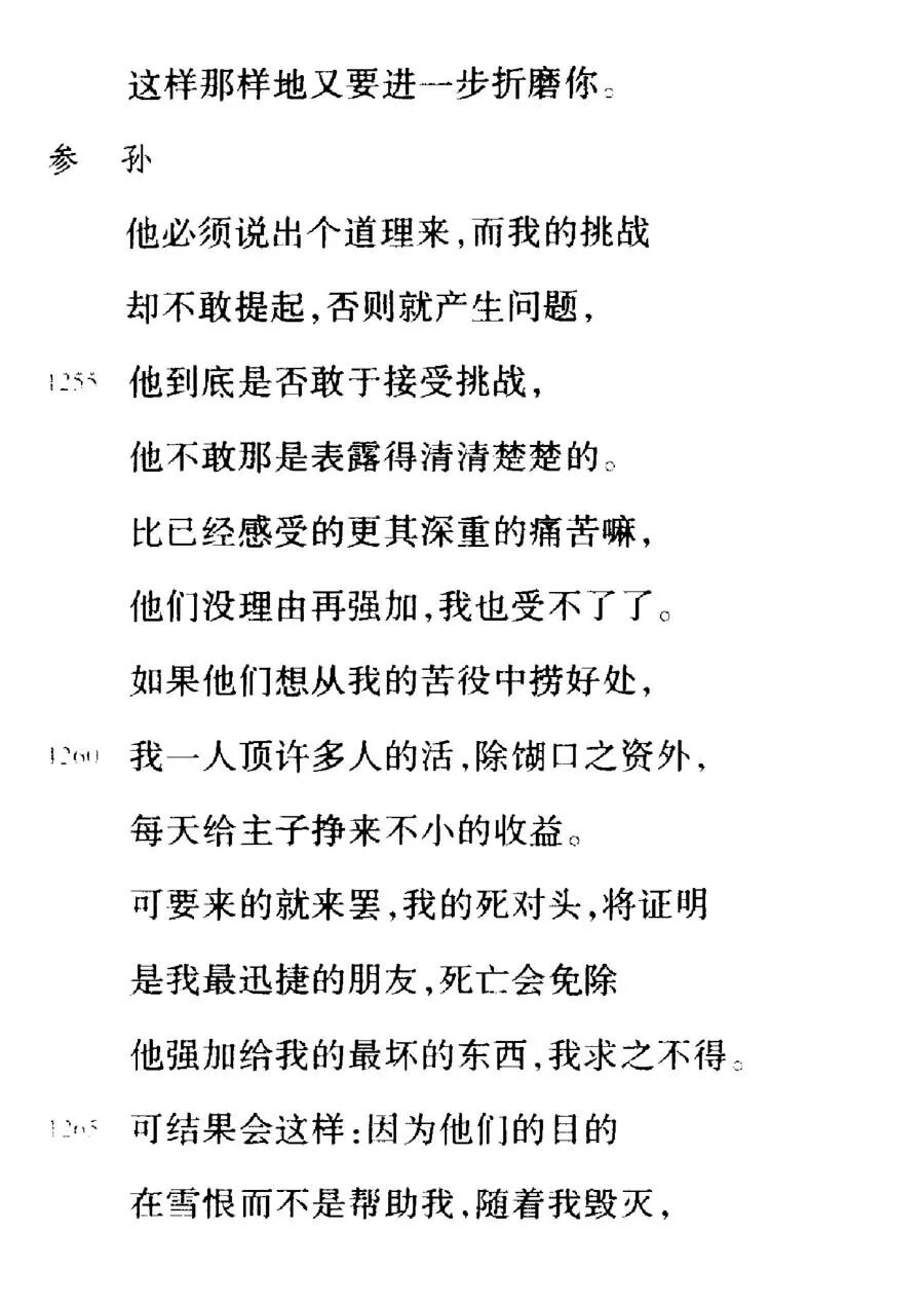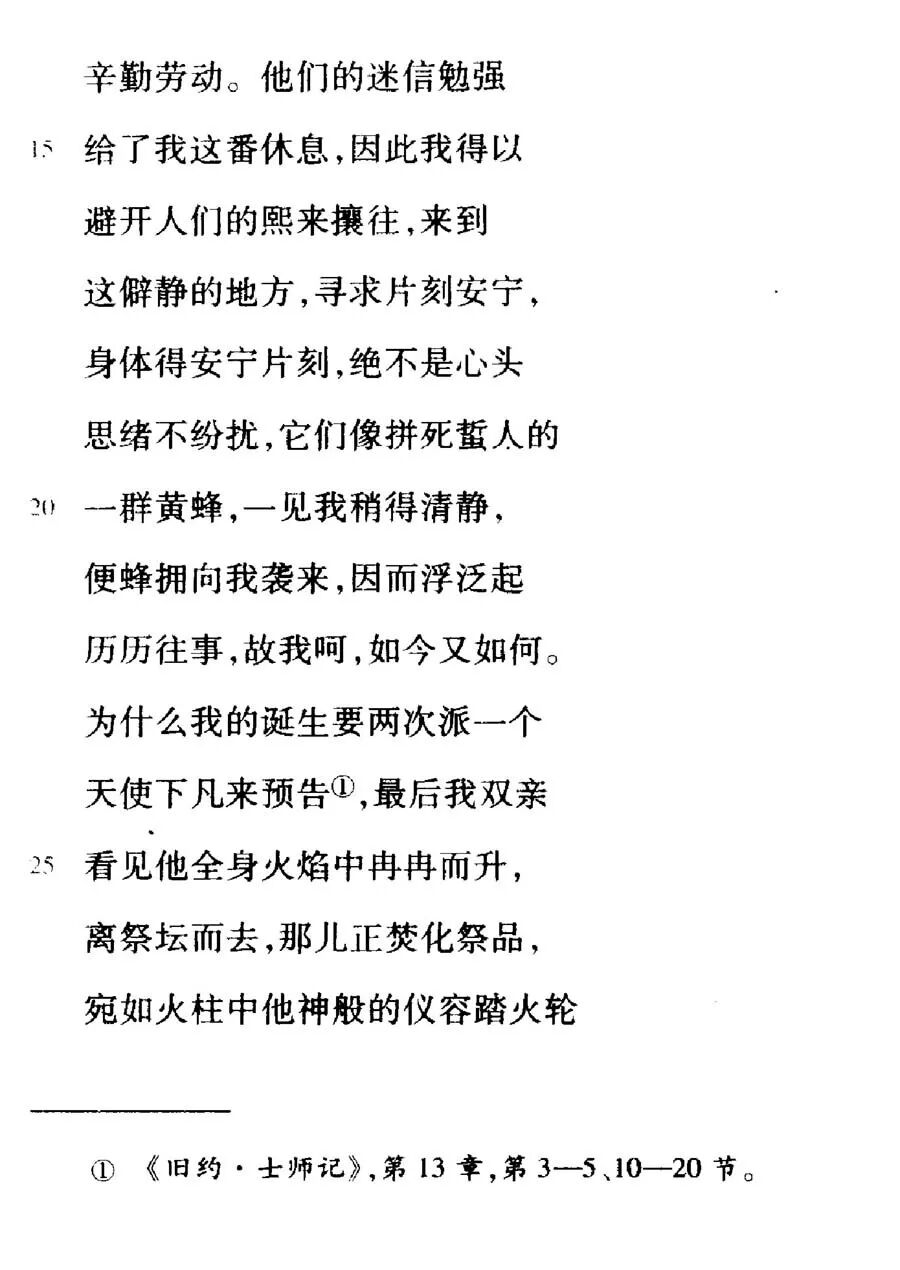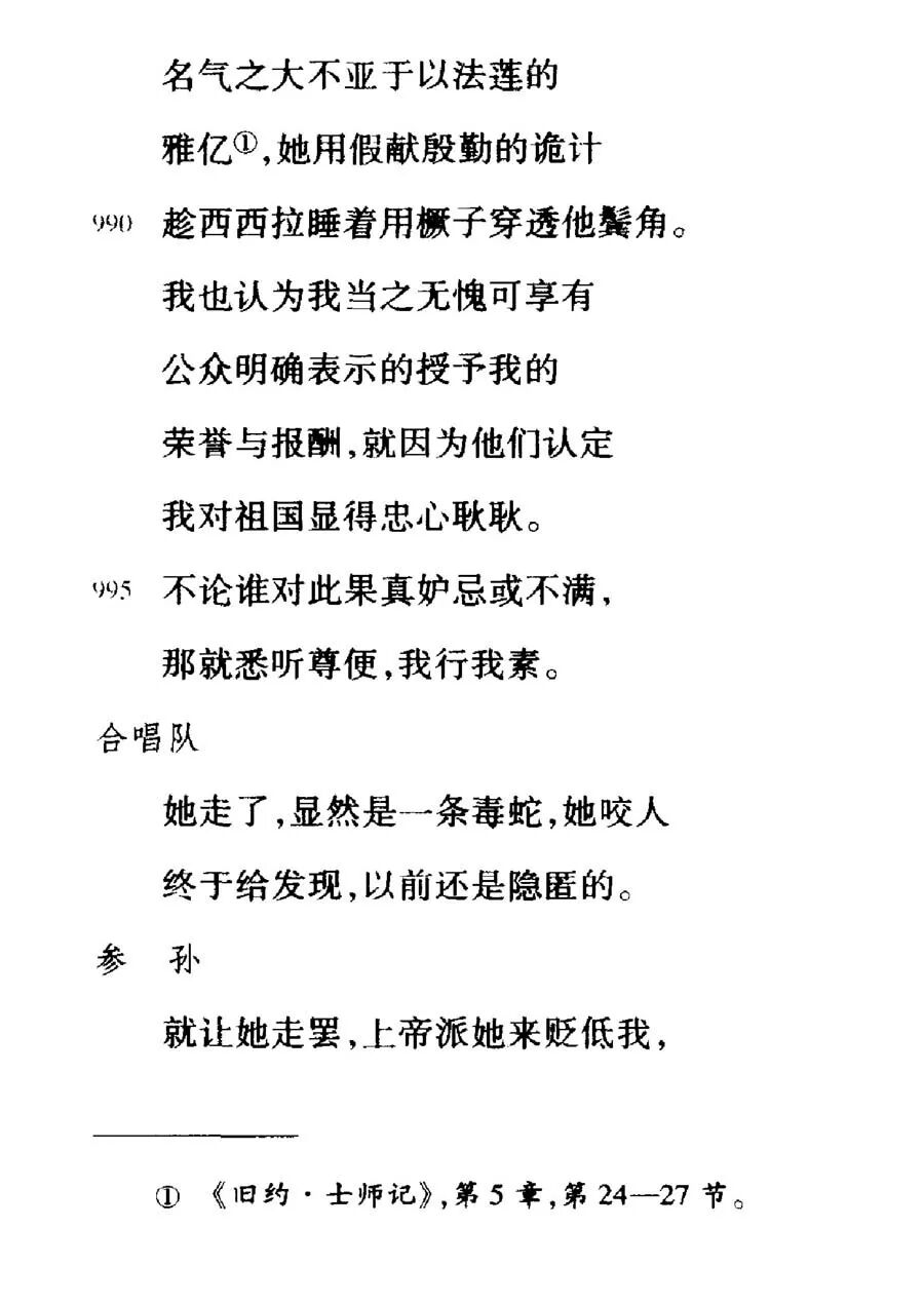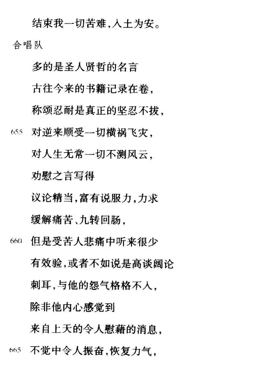 斗士参孙》是英国文学中最出色的希腊式古典悲剧。具有超人勇力的参孙遭妻子出卖失去了神力,且双目失明,身陷囹圄,但他仍力抗强暴,终与敌人同归于尽。一身正气,勇于牺牲的参孙的形象,正是作者悲壮经历的写照。晚年的弥尔顿虽目盲却依然壮怀激烈,他将炽热的情感倾注笔端,使这部无韵诗剧更具有庄严灿烂之美。本书译者金发燊为我国资深翻译家,对弥氏著作有独到的见解。译文信、达、雅三者咸备。诗的前半部分,不断地嗟叹命运于他的残酷。在诗的开篇,就是他的朋友们反复比较参孙被俘前后的落差之大。在被俘前,参孙能够用一块驴腮骨击杀一千人,还能够徒手撕碎一头狮子,他拥有上帝赐予的神力;但是现在却脚戴镣铐,双眼被剜,在牢里做着最卑下的苦力。而在参孙自己看来,他从过去一个伟大的英雄,落到这步田地,更比一般奴隶而不如。他哀叹道,他被赋予了伟大的力量,但却没有同时被赋予相匹配的智慧。这才使得他虽然拥有无限勇力,但却最终被从心灵的缺口击溃,导致了现在的惨境。但是,他也承认,一切都是咎由自取,上帝并没有过错。是因为他贪恋美色,自失分寸,把上帝赐予的秘密告诉了仇敌的女儿。可以说,被俘是他的认识的转折点。他能够认识到过错在于自己,而非上帝,也是他把握上帝的道的开端。在被俘之前,他如此的骄傲,以至于认为所有的荣誉都归于自己。他被巨大的荣誉蒙蔽了双眼,变成了一个轻率、盲目、鲁莽的人。在他被锁进监牢里之后,他才真正明白,自己之所以力大无穷,创造了伟大功绩,全是由于上帝的赐予,因此,所有的伟大的功绩都只能被看作是上帝的荣光。