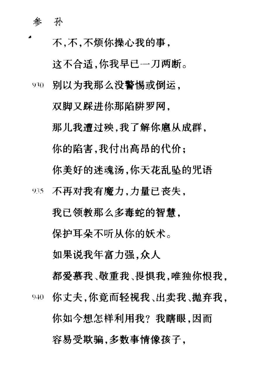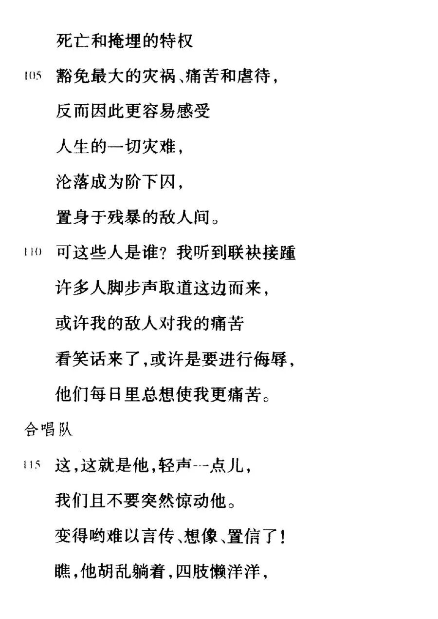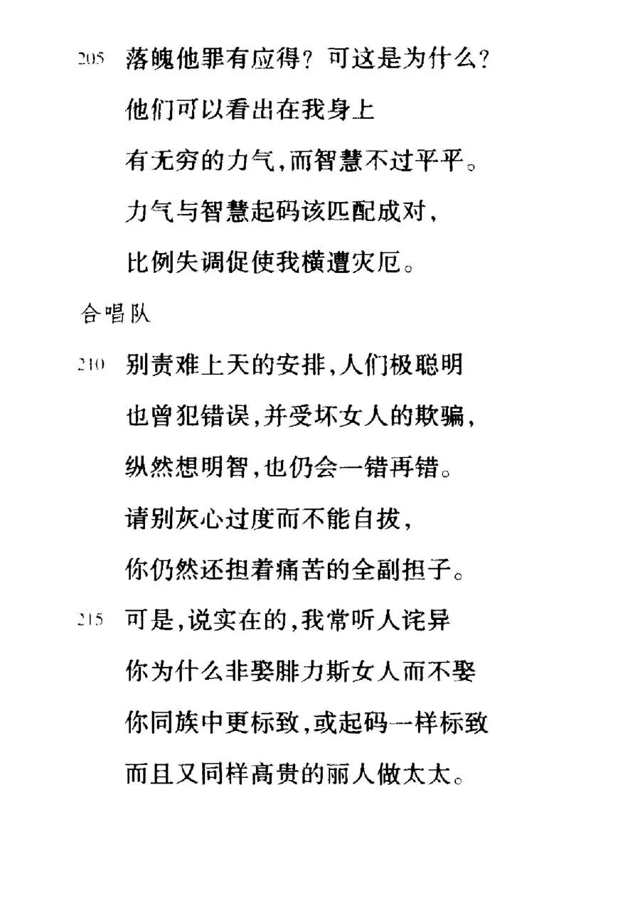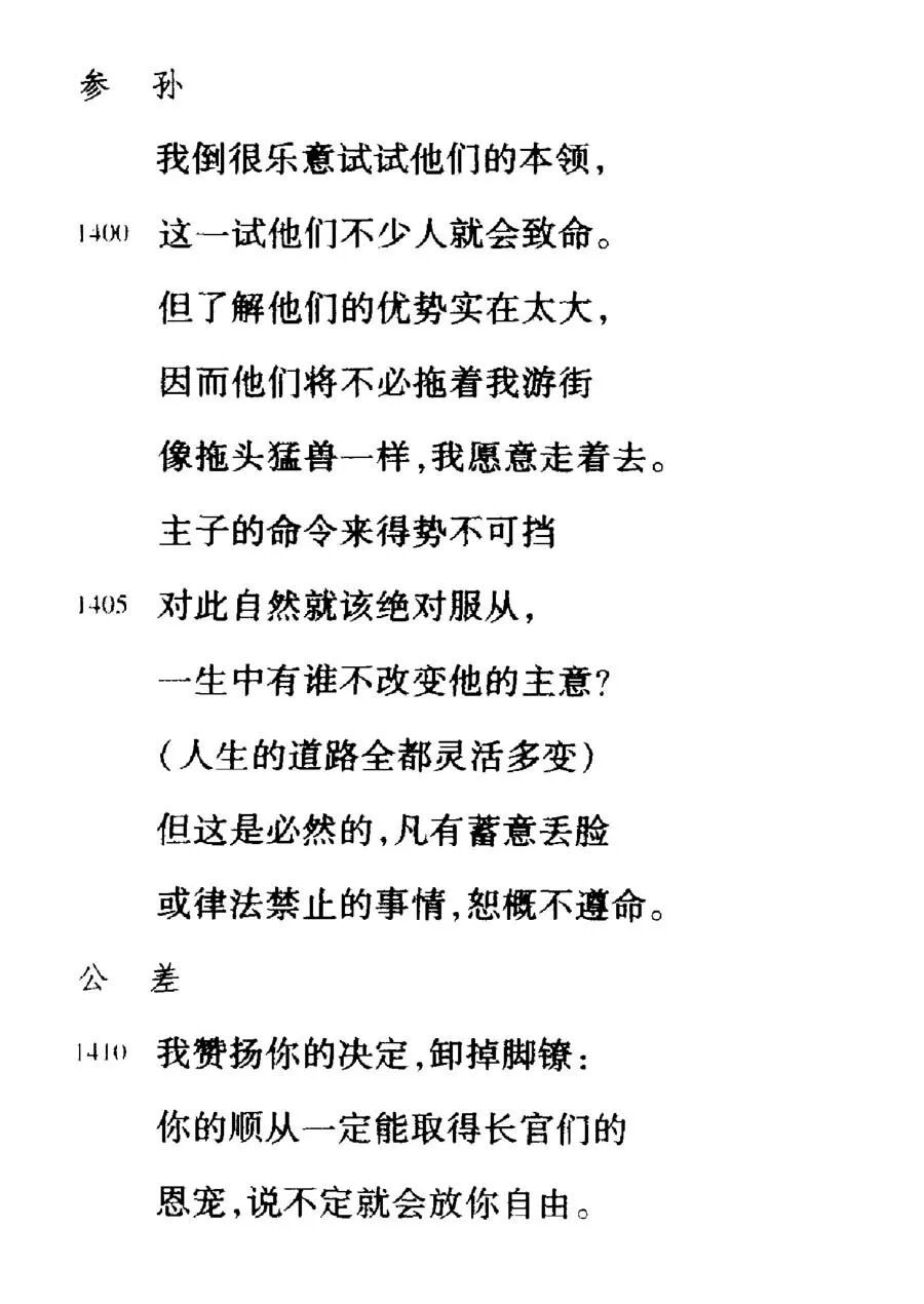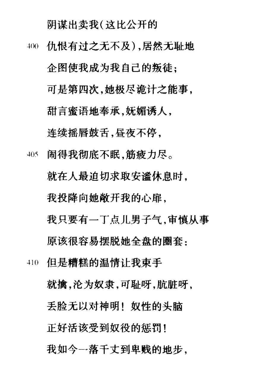 斗士参孙》是英国文学中最出色的希腊式古典悲剧。具有超人勇力的参孙遭妻子出卖失去了神力,且双目失明,身陷囹圄,但他仍力抗强暴,终与敌人同归于尽。一身正气,勇于牺牲的参孙的形象,正是作者悲壮经历的写照。晚年的弥尔顿虽目盲却依然壮怀激烈,他将炽热的情感倾注笔端,使这部无韵诗剧更具有庄严灿烂之美。本书译者金发燊为我国资深翻译家,对弥氏著作有独到的见解。译文信、达、雅三者咸备。诗的前半部分,不断地嗟叹命运于他的残酷。在诗的开篇,就是他的朋友们反复比较参孙被俘前后的落差之大。在被俘前,参孙能够用一块驴腮骨击杀一千人,还能够徒手撕碎一头狮子,他拥有上帝赐予的神力;但是现在却脚戴镣铐,双眼被剜,在牢里做着最卑下的苦力。而在参孙自己看来,他从过去一个伟大的英雄,落到这步田地,更比一般奴隶而不如。他哀叹道,他被赋予了伟大的力量,但却没有同时被赋予相匹配的智慧。这才使得他虽然拥有无限勇力,但却最终被从心灵的缺口击溃,导致了现在的惨境。但是,他也承认,一切都是咎由自取,上帝并没有过错。是因为他贪恋美色,自失分寸,把上帝赐予的秘密告诉了仇敌的女儿。可以说,被俘是他的认识的转折点。他能够认识到过错在于自己,而非上帝,也是他把握上帝的道的开端。在被俘之前,他如此的骄傲,以至于认为所有的荣誉都归于自己。他被巨大的荣誉蒙蔽了双眼,变成了一个轻率、盲目、鲁莽的人。在他被锁进监牢里之后,他才真正明白,自己之所以力大无穷,创造了伟大功绩,全是由于上帝的赐予,因此,所有的伟大的功绩都只能被看作是上帝的荣光。