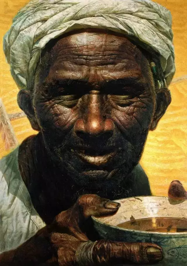 正式创作以前,罗中立回了一次大巴山,选了很多老人的照片,然后把这些综合出来构成一个老年农民的形象。