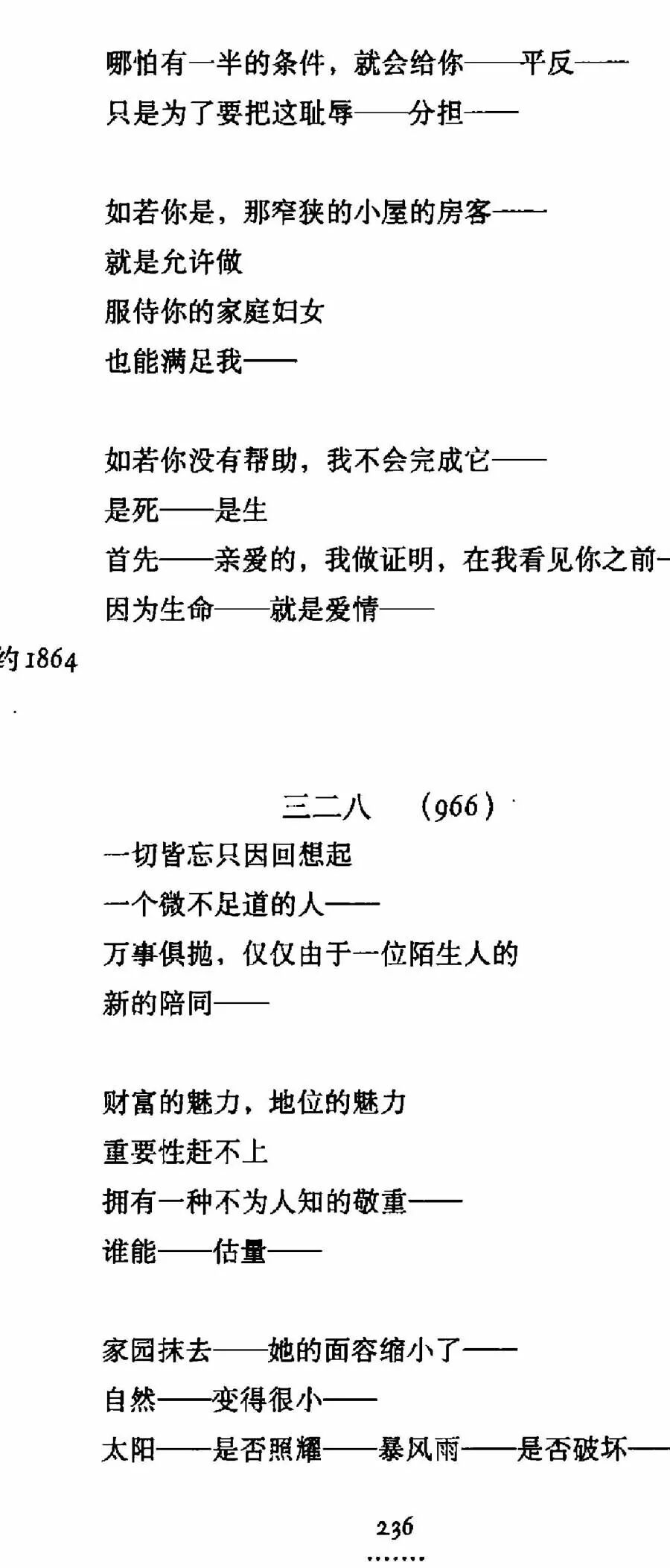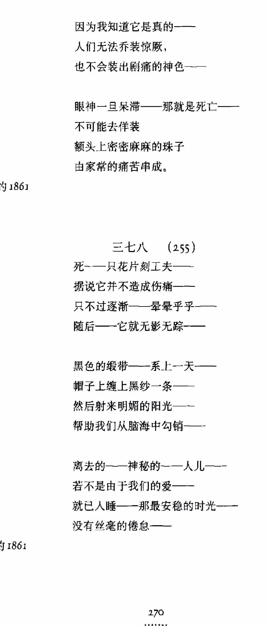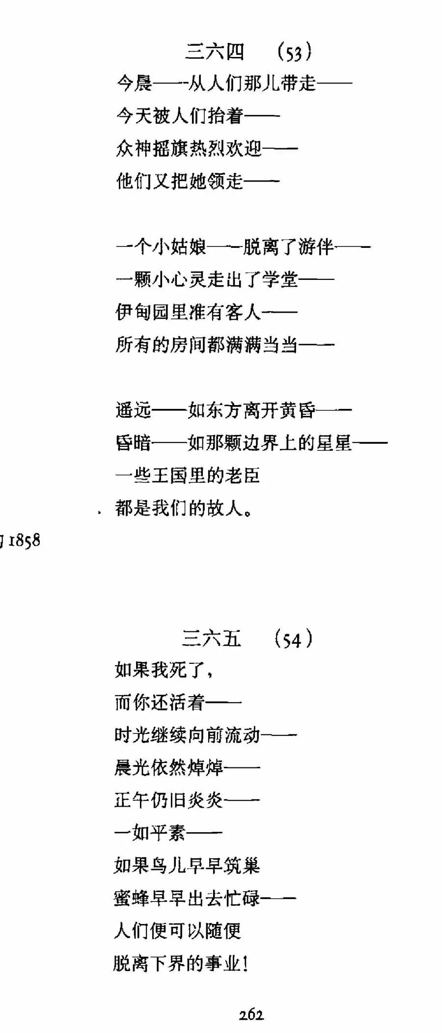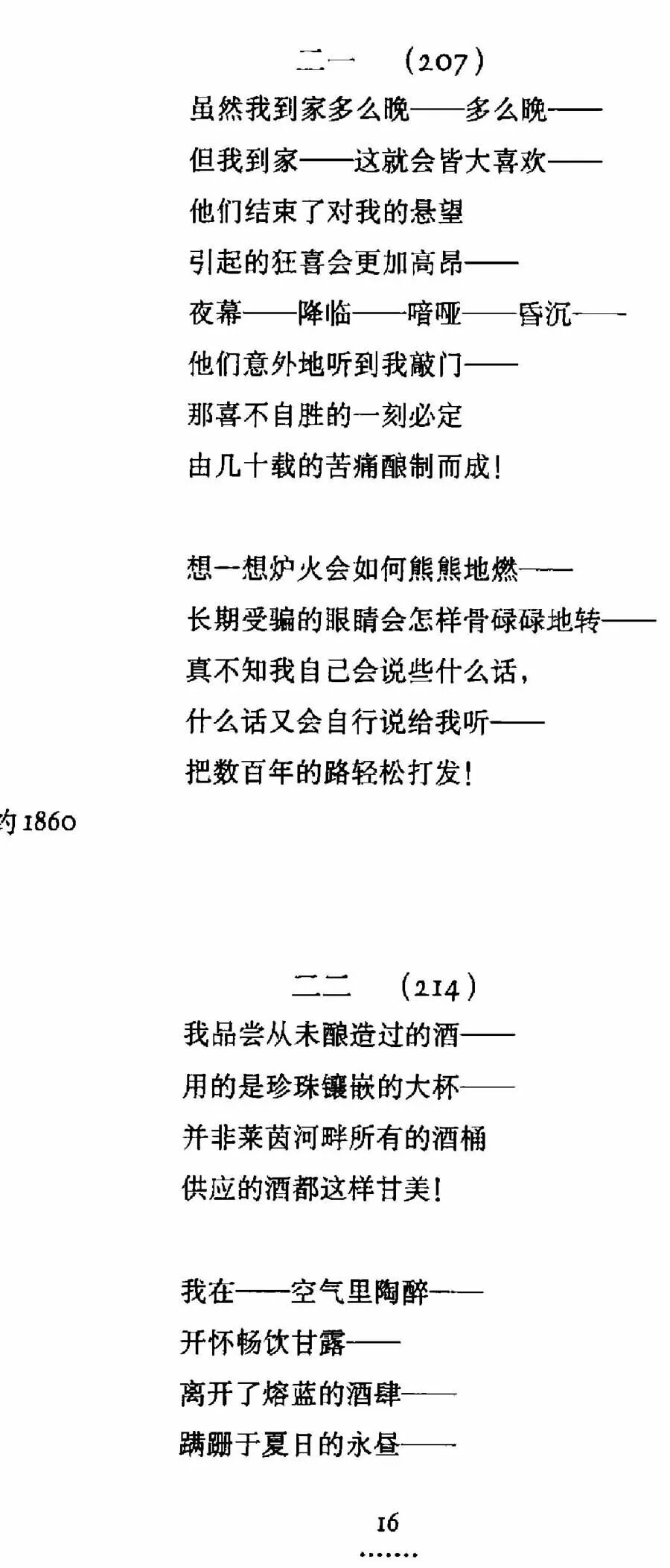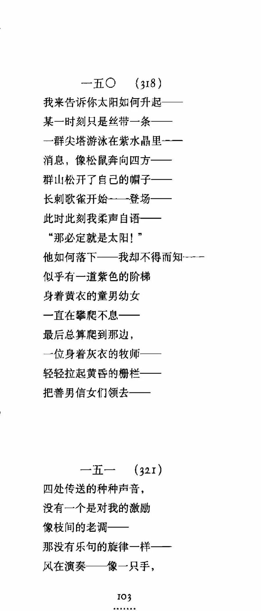 艾米莉·伊丽莎白·狄金森(英语:Emily Elizabeth Dickinson,又译艾弥莉‧狄瑾荪或埃米莉·狄更生,1830年12月10日-1886年5月15日),美国诗人。诗风凝炼,比喻尖新,常置格律以至语法于不顾。生前只发表过10首诗,默默无闻,死后近70年开始得到文学界的认真关注,被现代派诗人追认为先驱。与同时代的惠特曼,一同被奉为美国最伟大诗人,后世对她的诗艺、恋爱生活、性取向多有揣测。