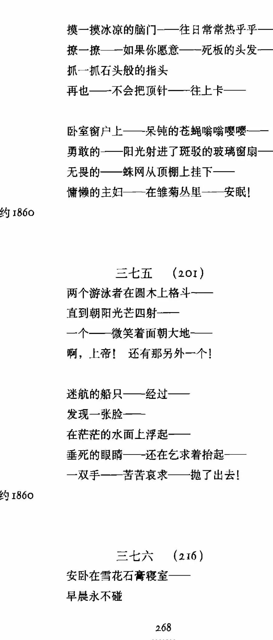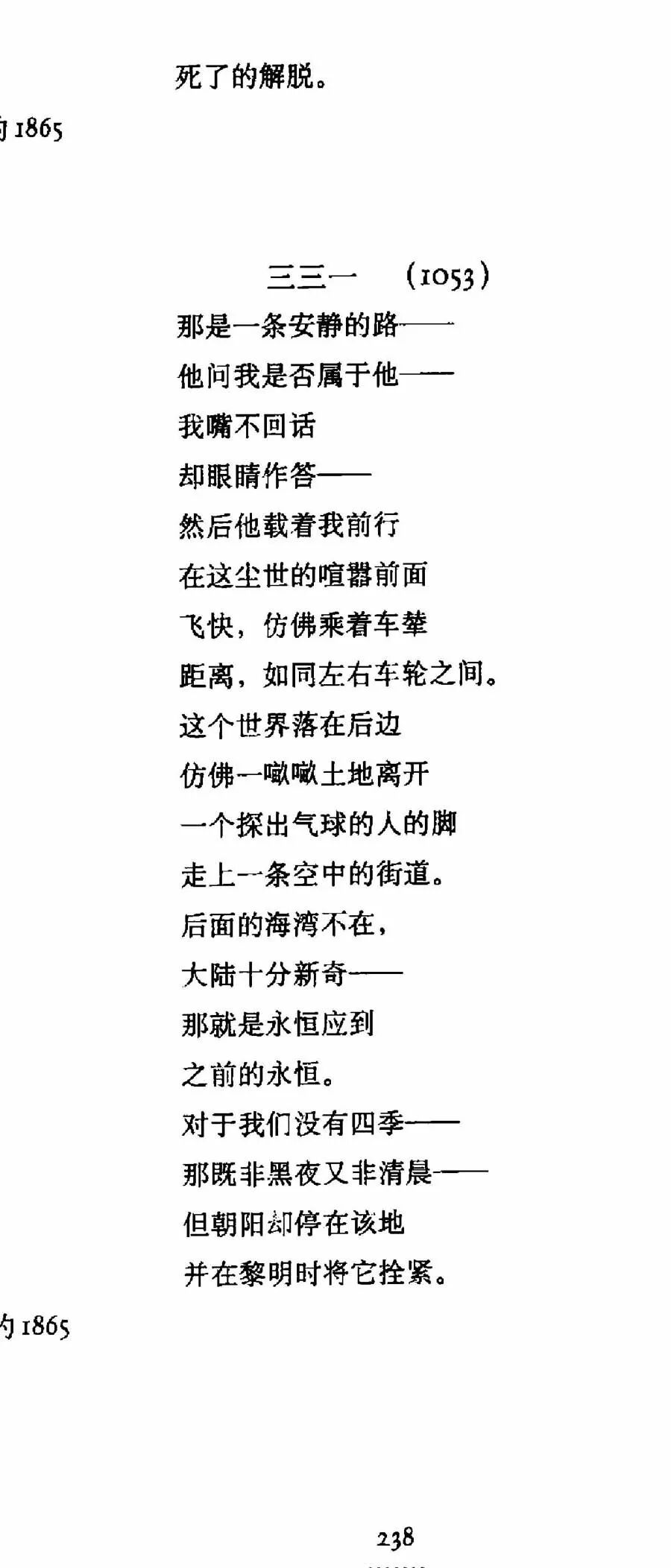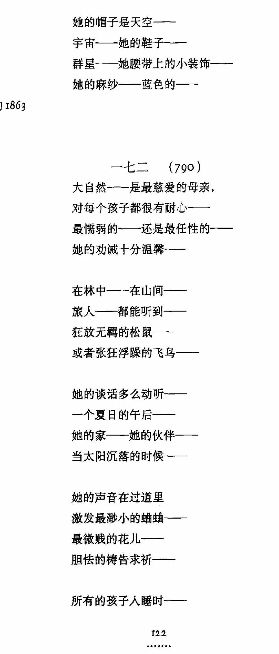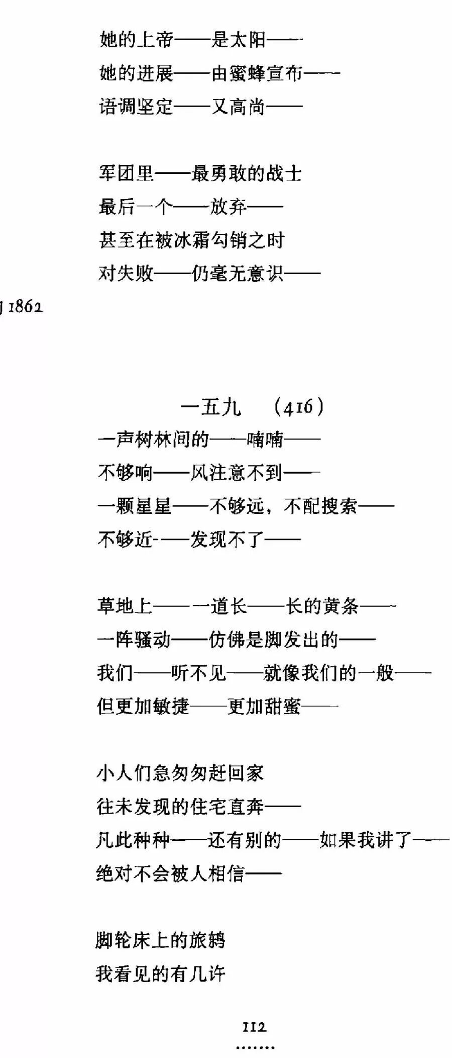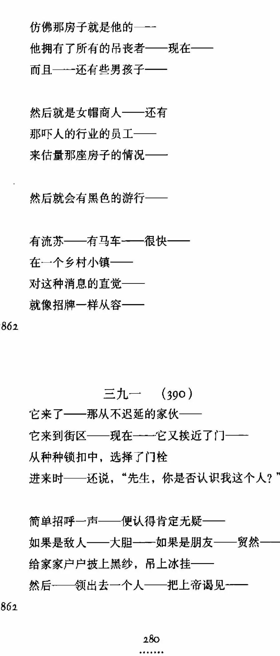 艾米莉·伊丽莎白·狄金森(英语:Emily Elizabeth Dickinson,又译艾弥莉‧狄瑾荪或埃米莉·狄更生,1830年12月10日-1886年5月15日),美国诗人。诗风凝炼,比喻尖新,常置格律以至语法于不顾。生前只发表过10首诗,默默无闻,死后近70年开始得到文学界的认真关注,被现代派诗人追认为先驱。与同时代的惠特曼,一同被奉为美国最伟大诗人,后世对她的诗艺、恋爱生活、性取向多有揣测。
