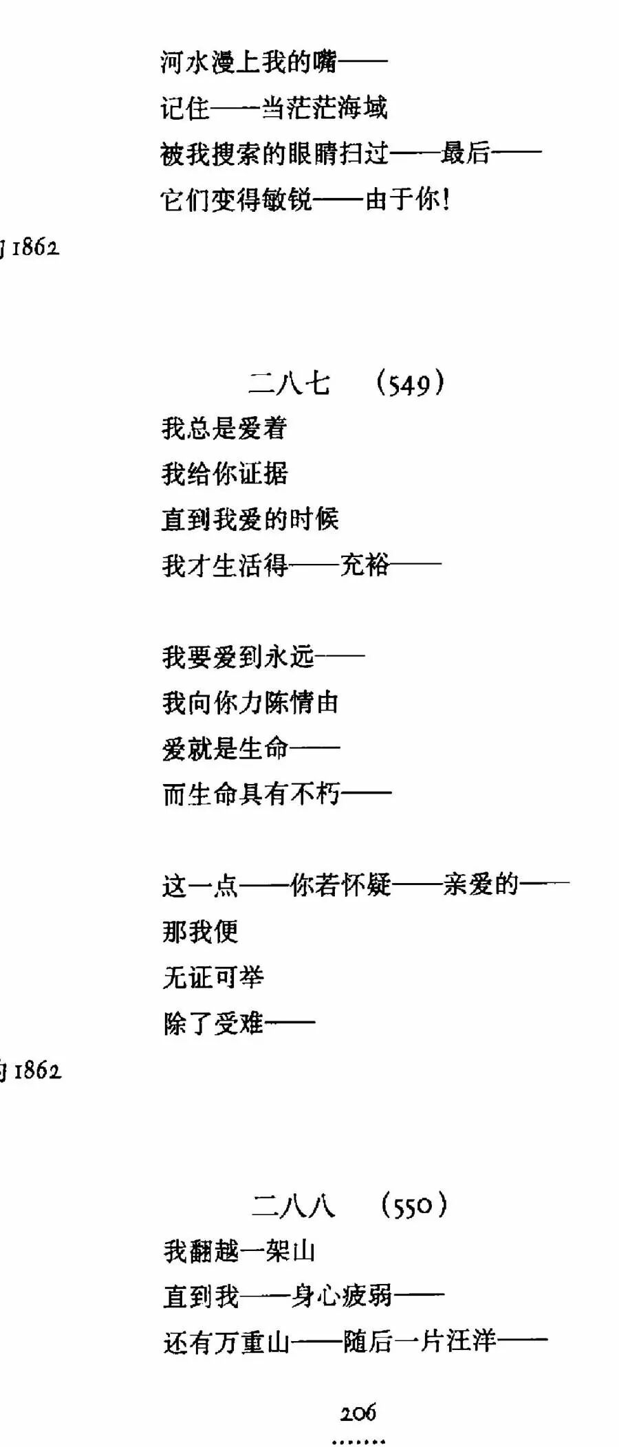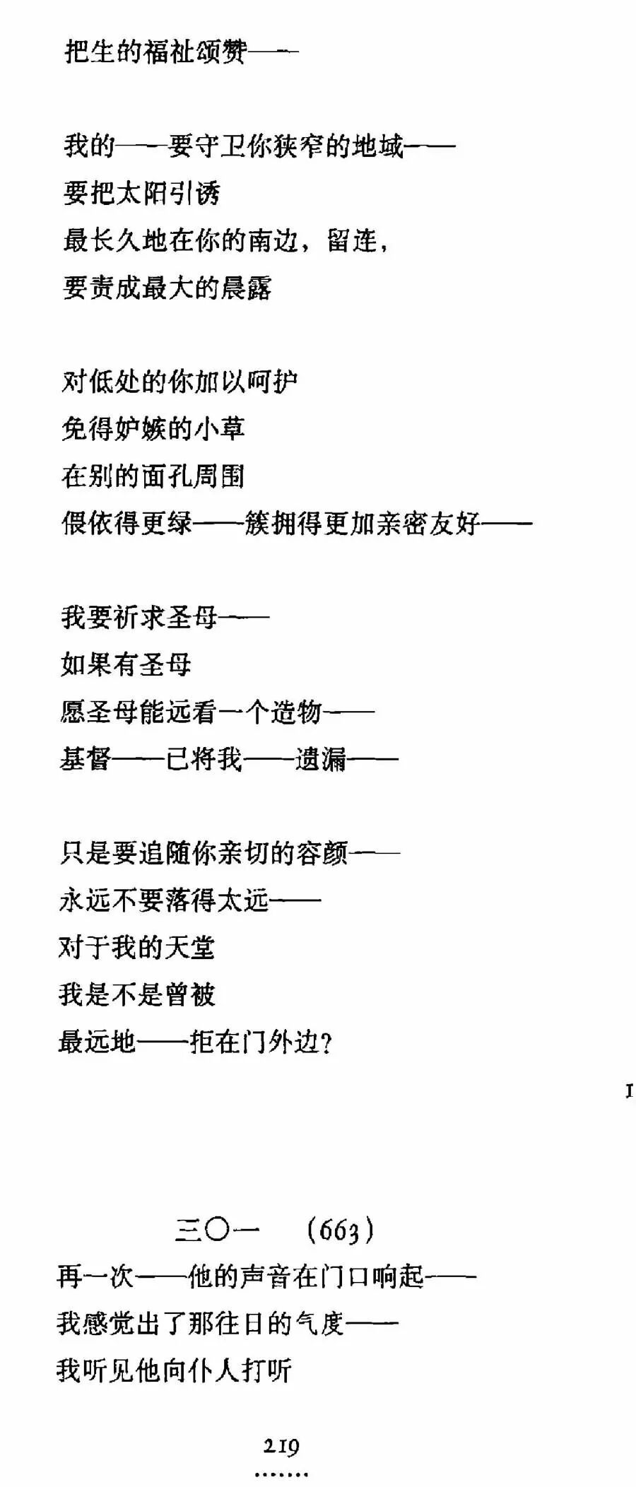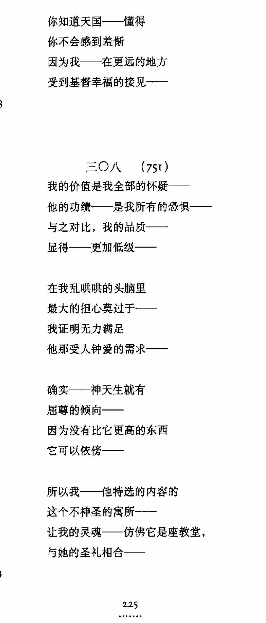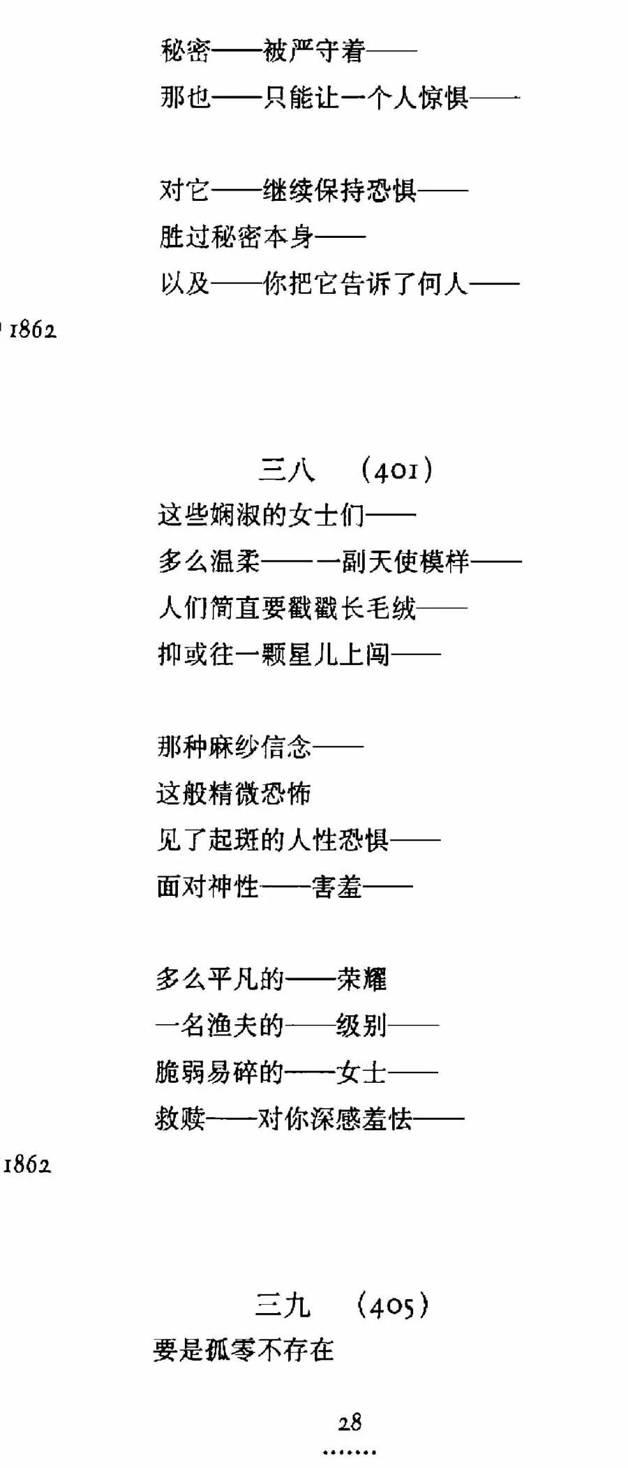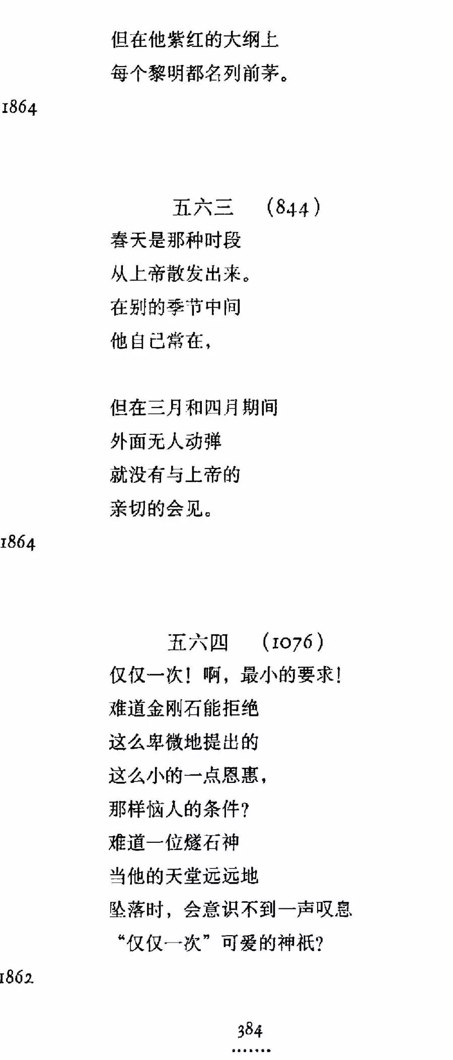 艾米莉·伊丽莎白·狄金森(英语:Emily Elizabeth Dickinson,又译艾弥莉‧狄瑾荪或埃米莉·狄更生,1830年12月10日-1886年5月15日),美国诗人。诗风凝炼,比喻尖新,常置格律以至语法于不顾。生前只发表过10首诗,默默无闻,死后近70年开始得到文学界的认真关注,被现代派诗人追认为先驱。与同时代的惠特曼,一同被奉为美国最伟大诗人,后世对她的诗艺、恋爱生活、性取向多有揣测。