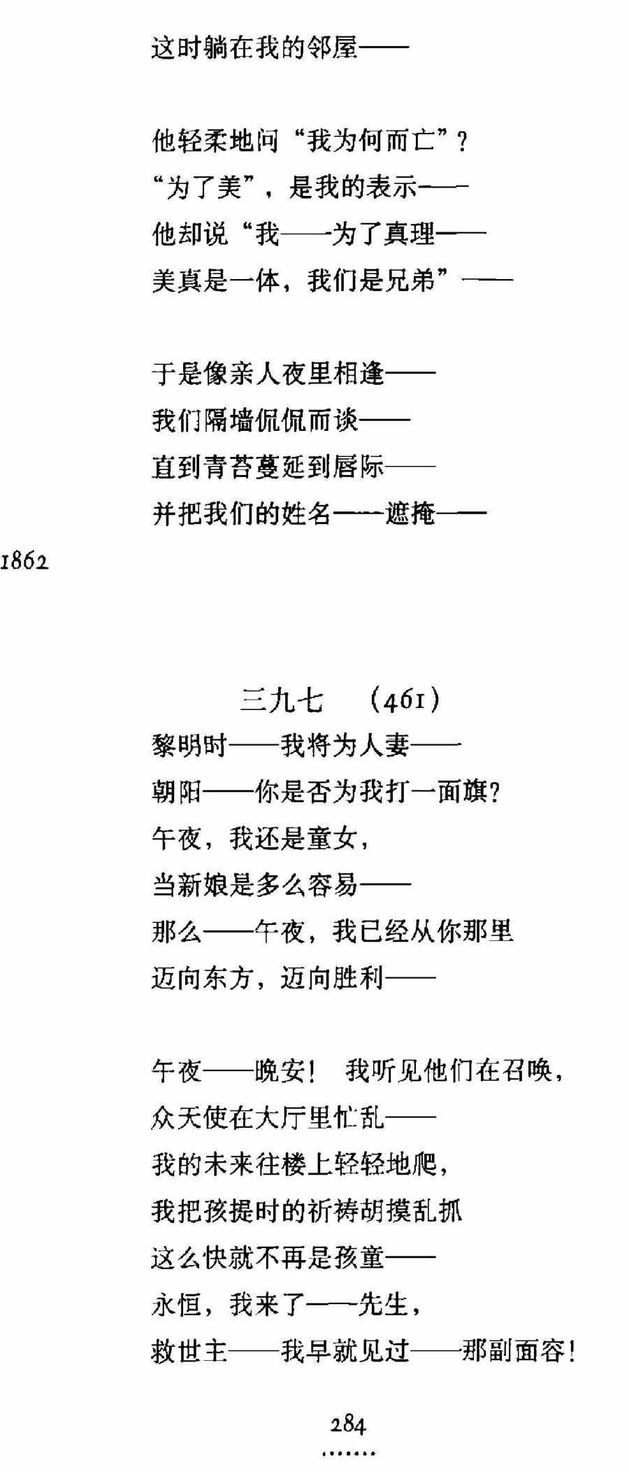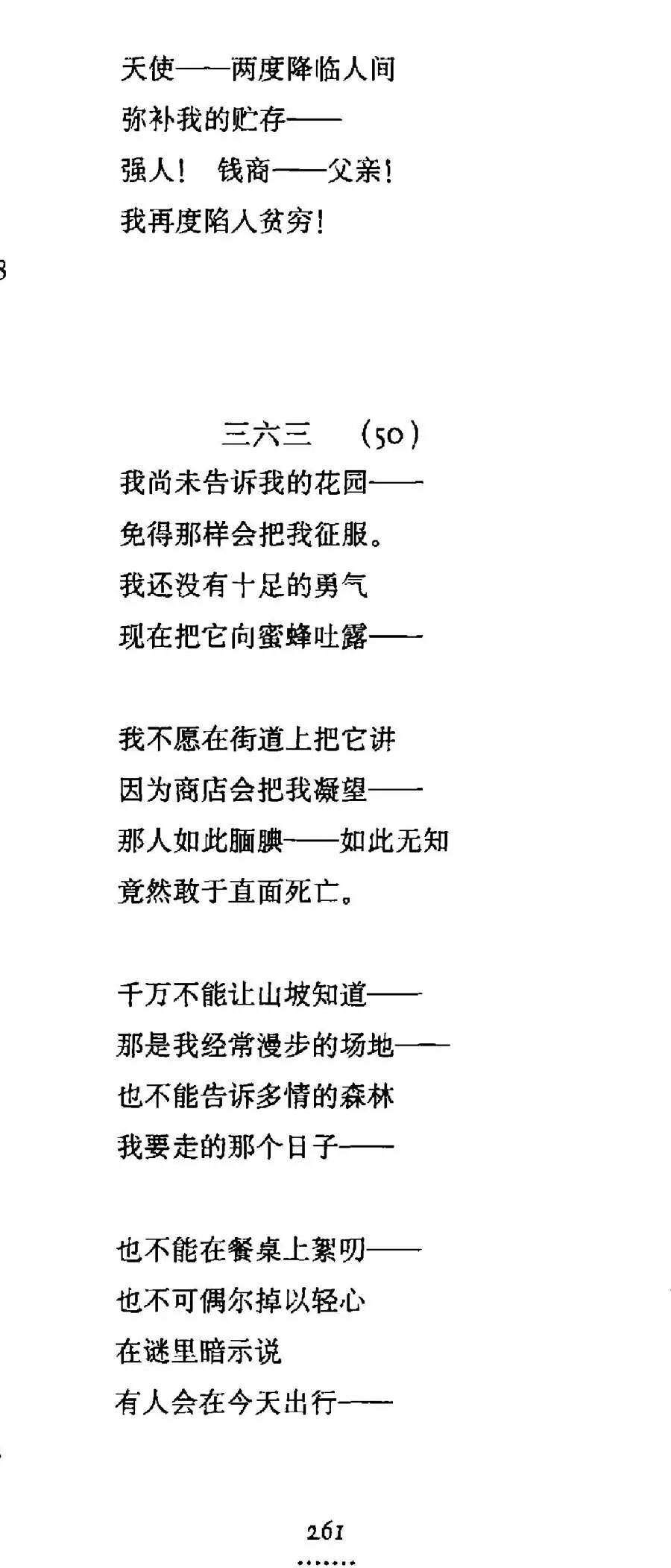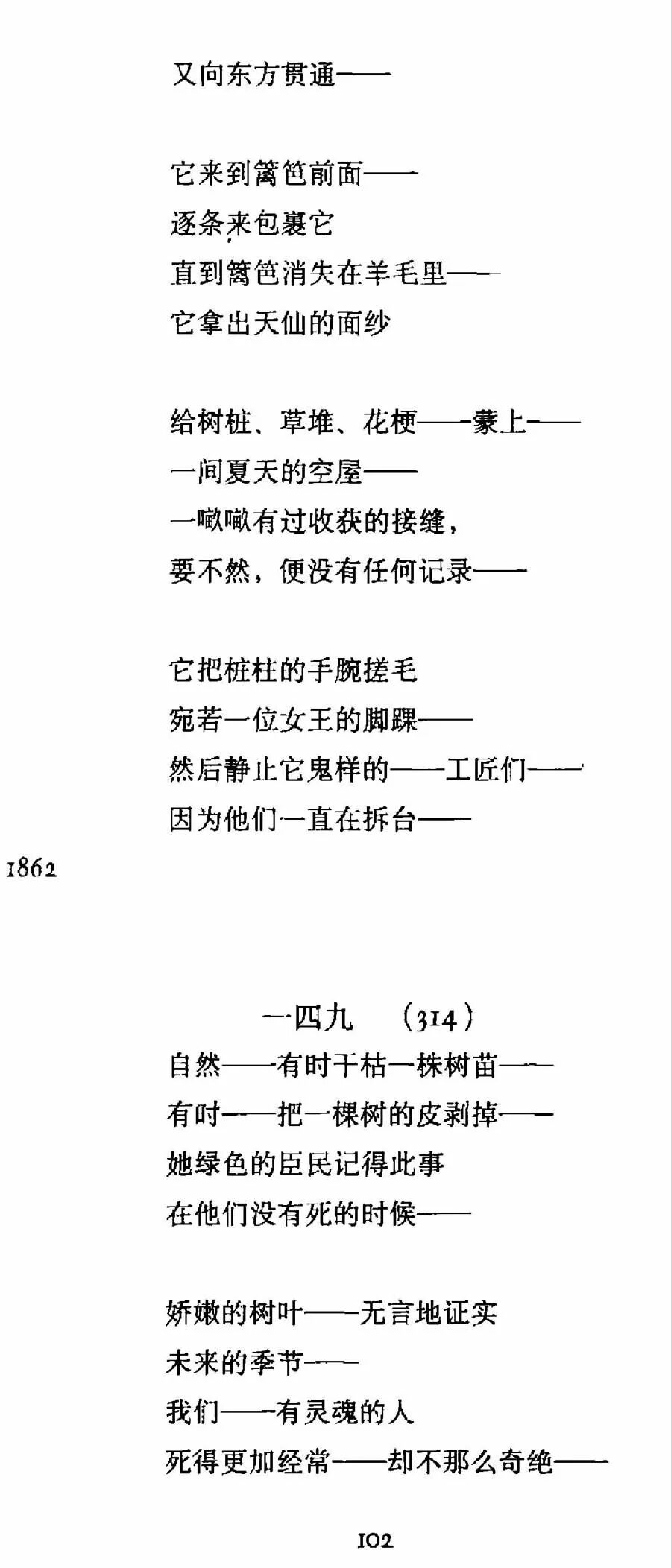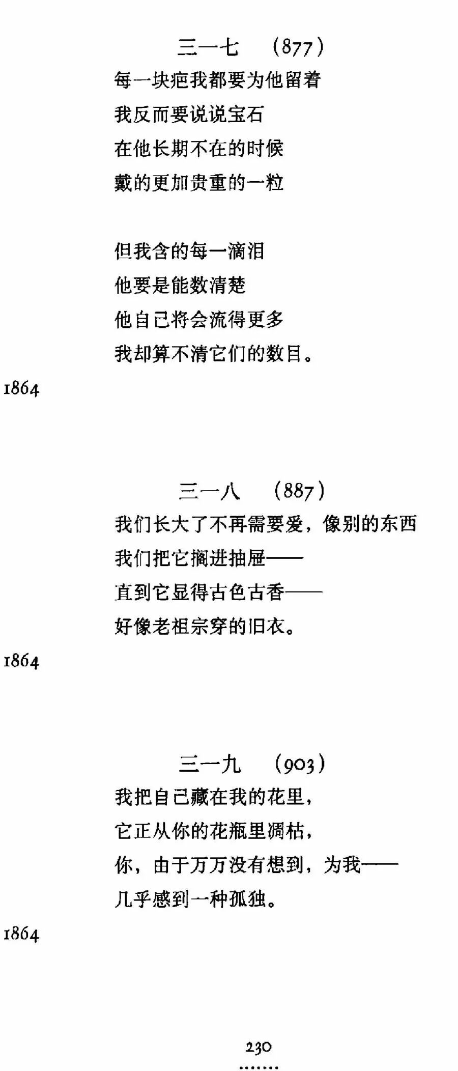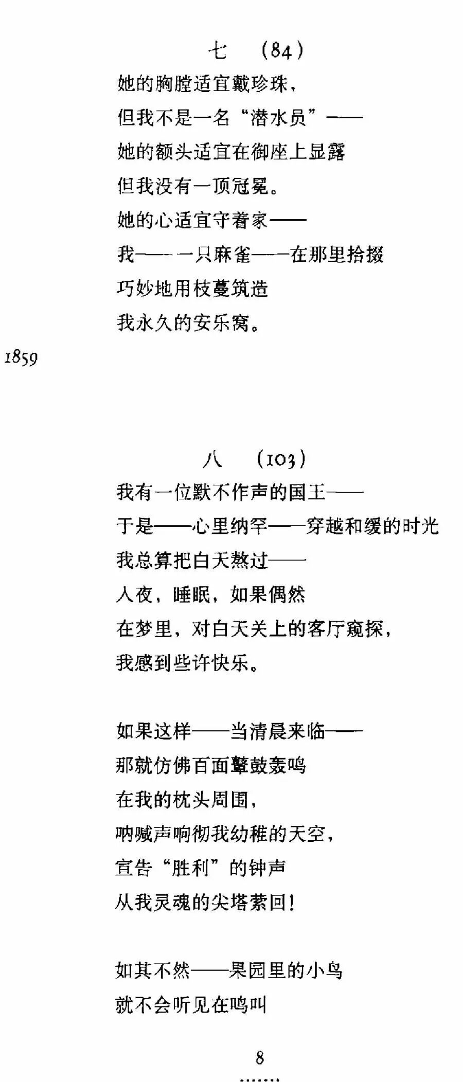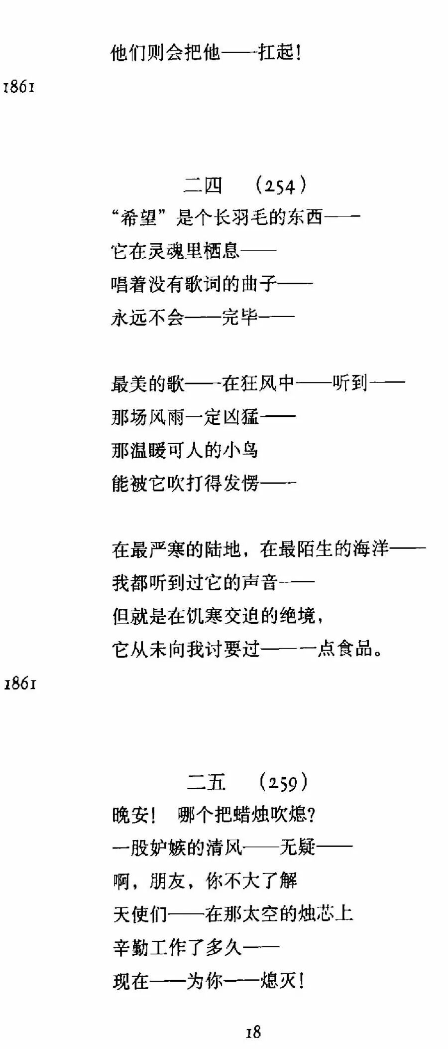 艾米莉·伊丽莎白·狄金森(英语:Emily Elizabeth Dickinson,又译艾弥莉‧狄瑾荪或埃米莉·狄更生,1830年12月10日-1886年5月15日),美国诗人。诗风凝炼,比喻尖新,常置格律以至语法于不顾。生前只发表过10首诗,默默无闻,死后近70年开始得到文学界的认真关注,被现代派诗人追认为先驱。与同时代的惠特曼,一同被奉为美国最伟大诗人,后世对她的诗艺、恋爱生活、性取向多有揣测。