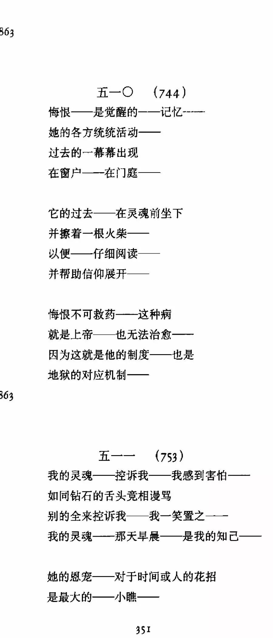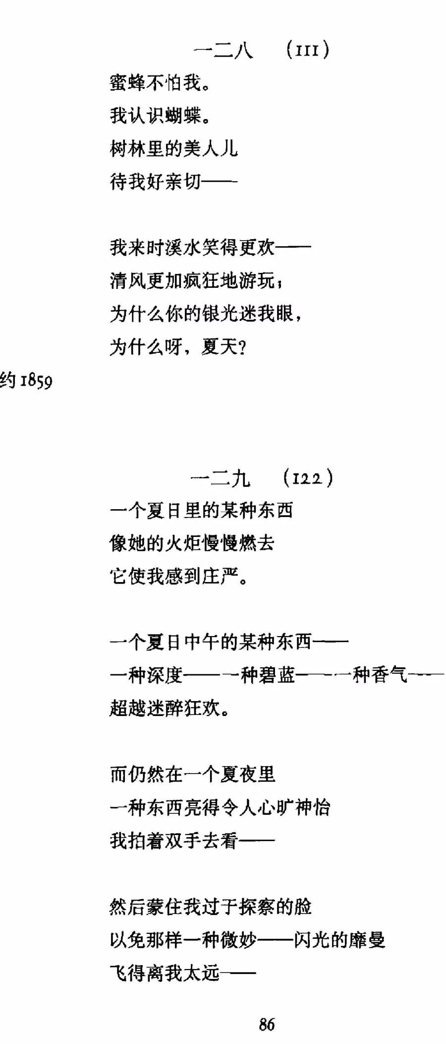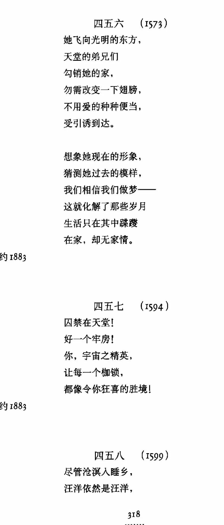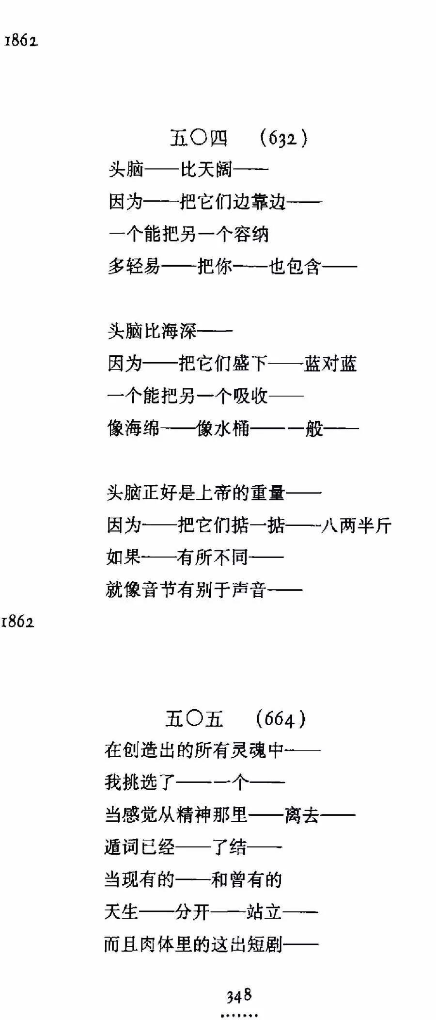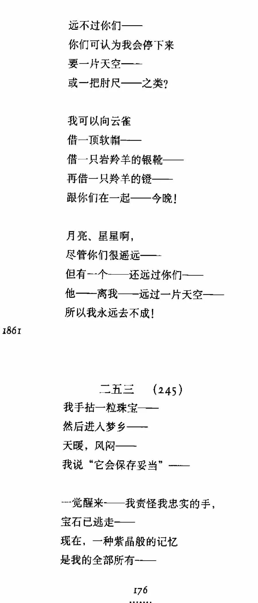 艾米莉·伊丽莎白·狄金森(英语:Emily Elizabeth Dickinson,又译艾弥莉‧狄瑾荪或埃米莉·狄更生,1830年12月10日-1886年5月15日),美国诗人。诗风凝炼,比喻尖新,常置格律以至语法于不顾。生前只发表过10首诗,默默无闻,死后近70年开始得到文学界的认真关注,被现代派诗人追认为先驱。与同时代的惠特曼,一同被奉为美国最伟大诗人,后世对她的诗艺、恋爱生活、性取向多有揣测。