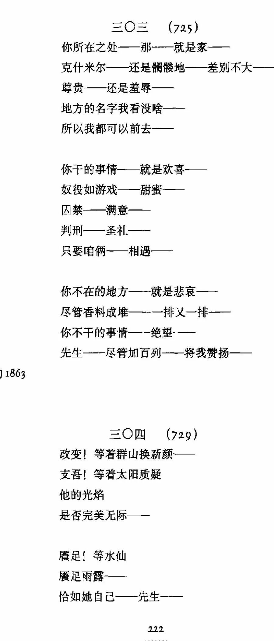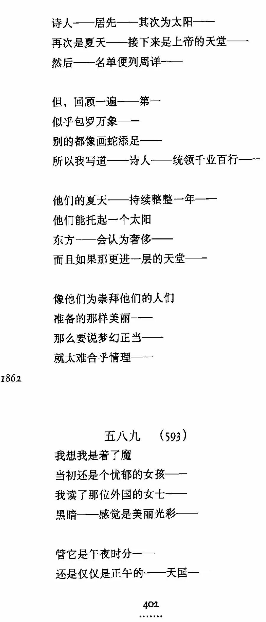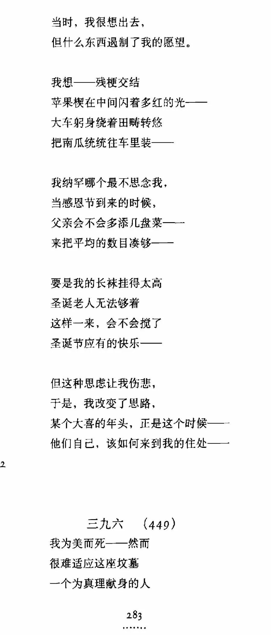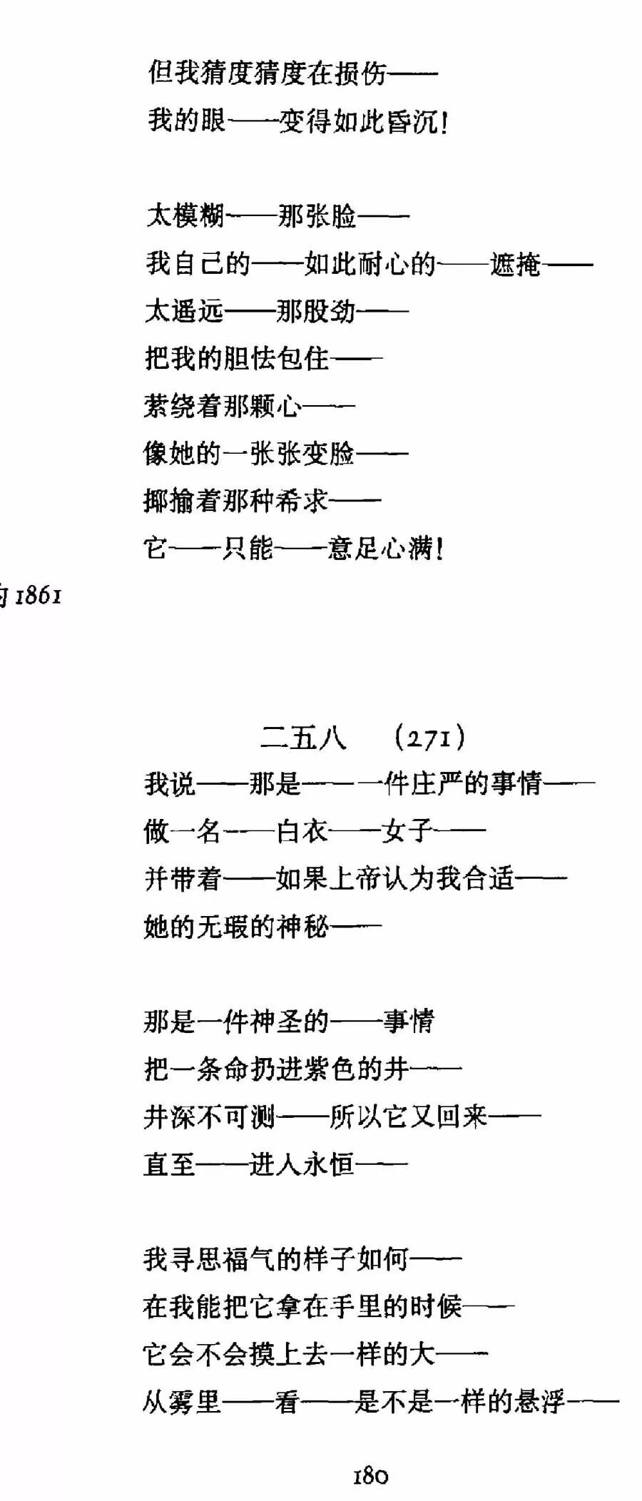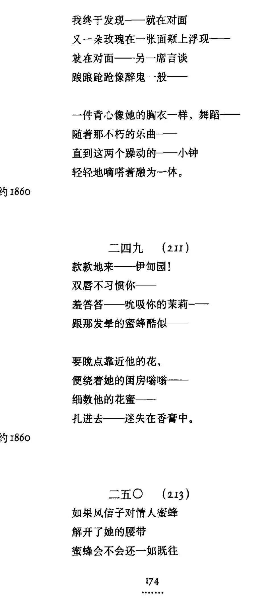 艾米莉·伊丽莎白·狄金森(英语:Emily Elizabeth Dickinson,又译艾弥莉‧狄瑾荪或埃米莉·狄更生,1830年12月10日-1886年5月15日),美国诗人。诗风凝炼,比喻尖新,常置格律以至语法于不顾。生前只发表过10首诗,默默无闻,死后近70年开始得到文学界的认真关注,被现代派诗人追认为先驱。与同时代的惠特曼,一同被奉为美国最伟大诗人,后世对她的诗艺、恋爱生活、性取向多有揣测。