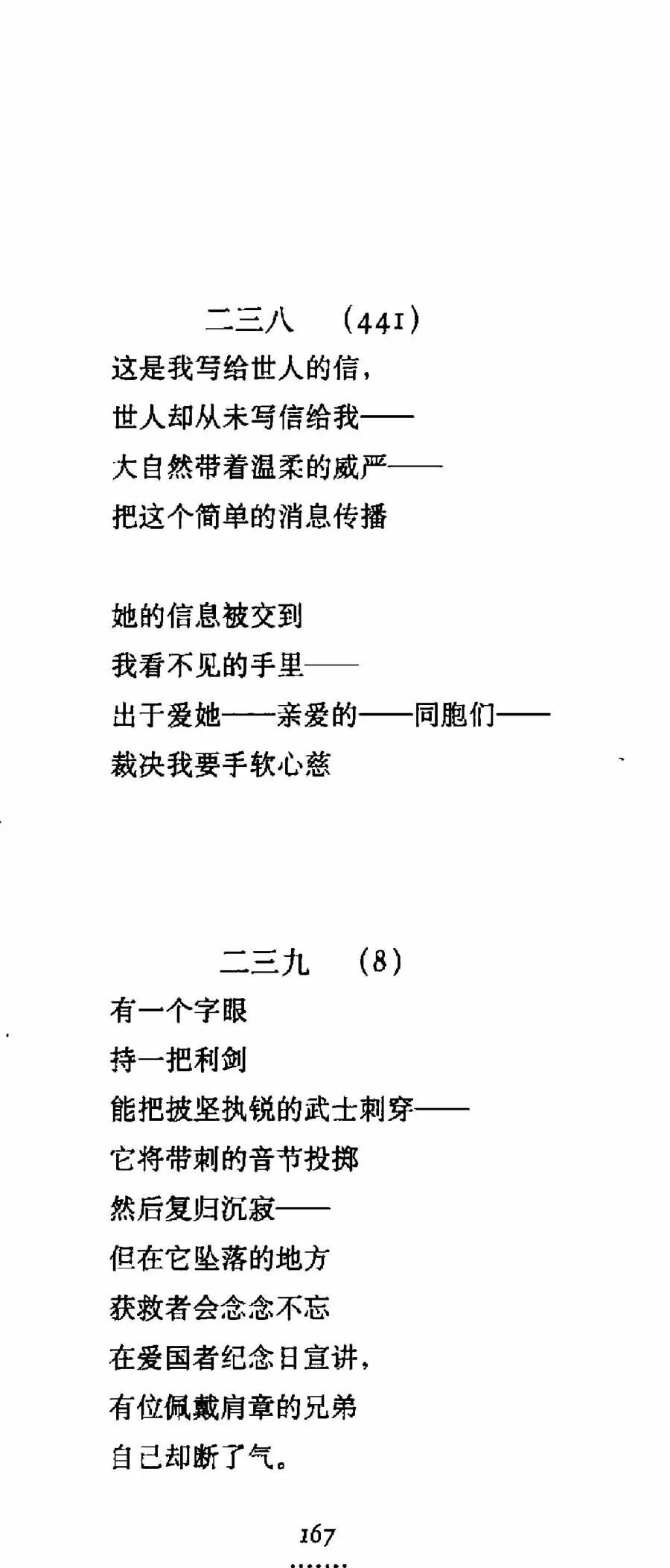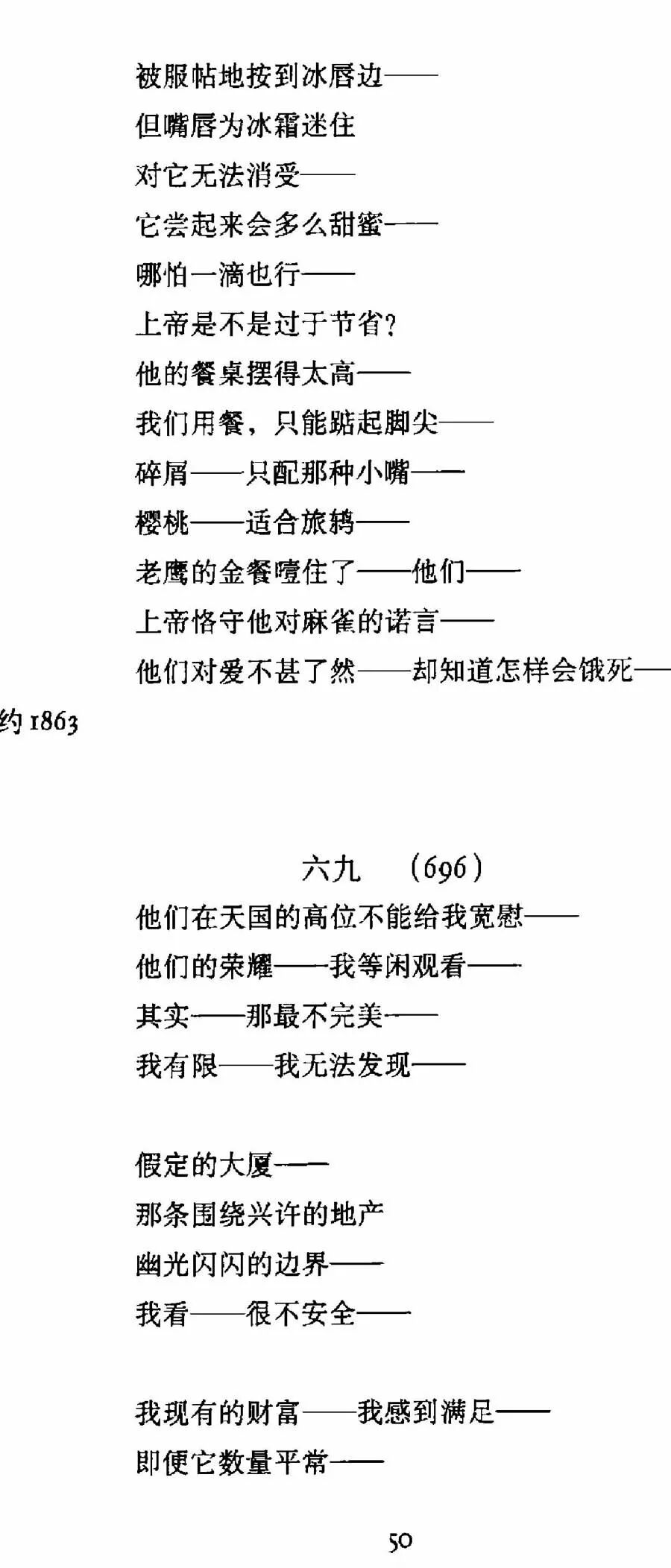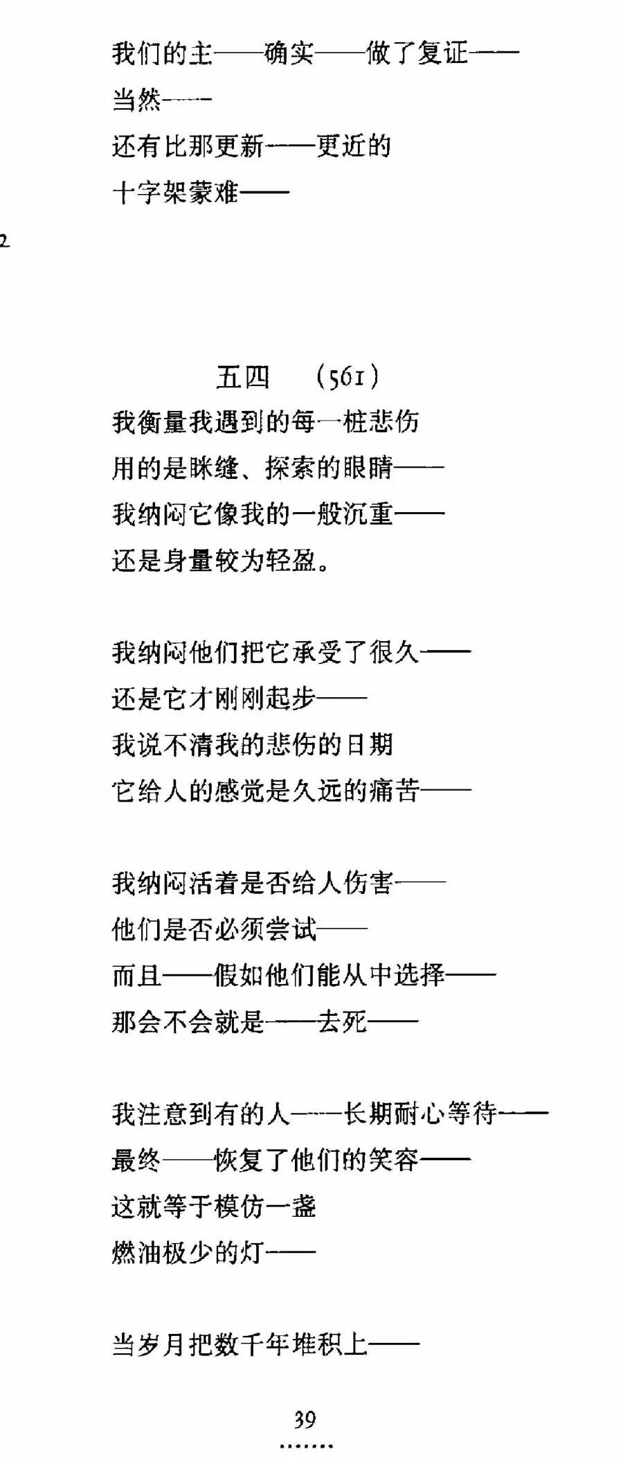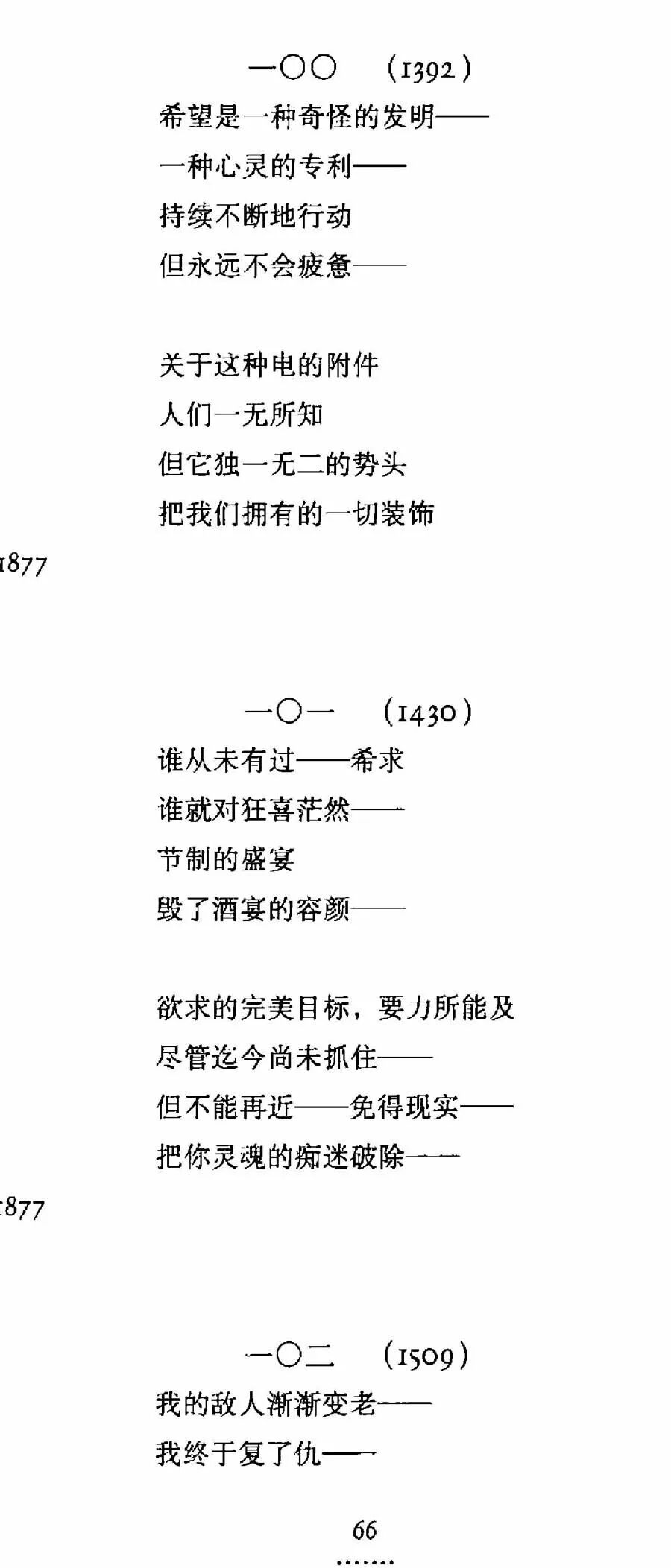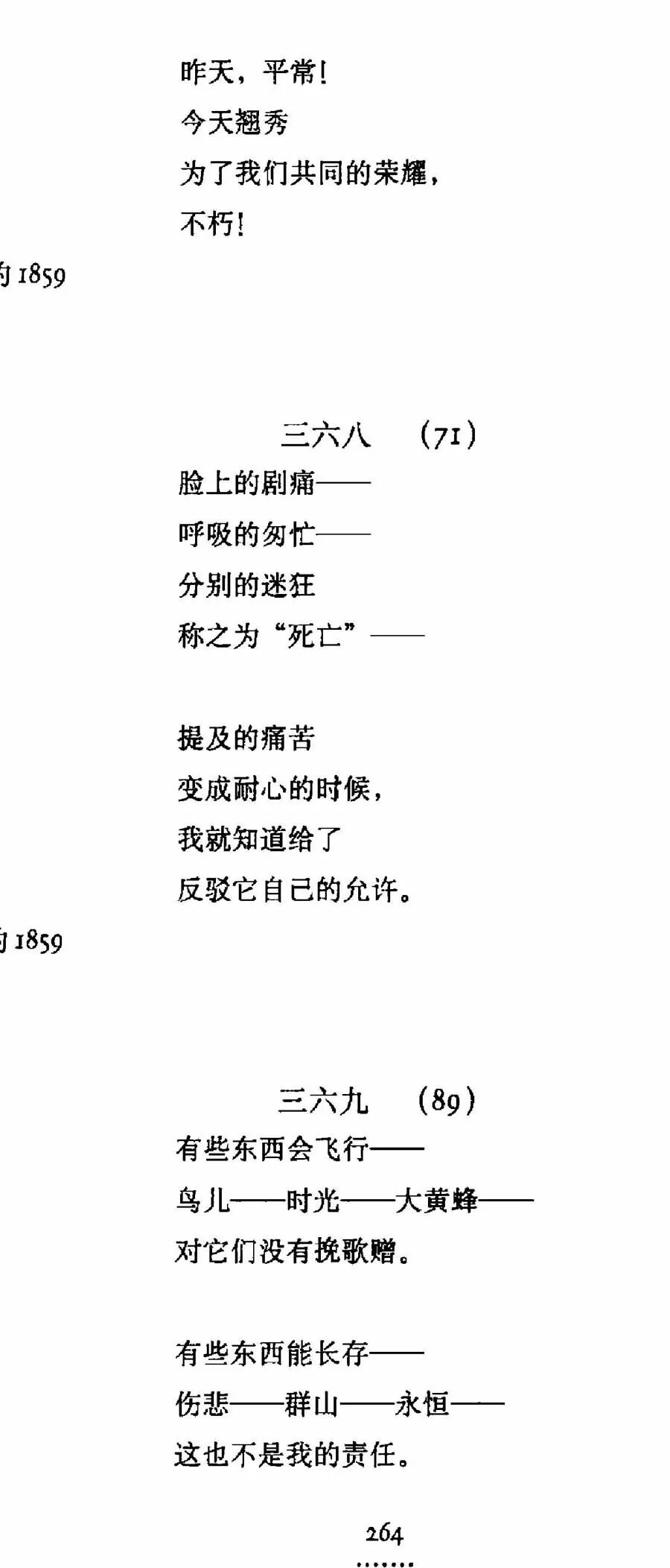 艾米莉·伊丽莎白·狄金森(英语:Emily Elizabeth Dickinson,又译艾弥莉‧狄瑾荪或埃米莉·狄更生,1830年12月10日-1886年5月15日),美国诗人。诗风凝炼,比喻尖新,常置格律以至语法于不顾。生前只发表过10首诗,默默无闻,死后近70年开始得到文学界的认真关注,被现代派诗人追认为先驱。与同时代的惠特曼,一同被奉为美国最伟大诗人,后世对她的诗艺、恋爱生活、性取向多有揣测。
