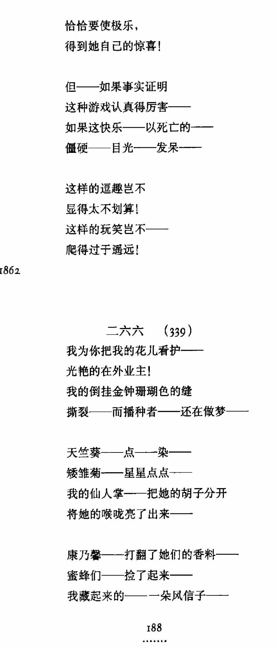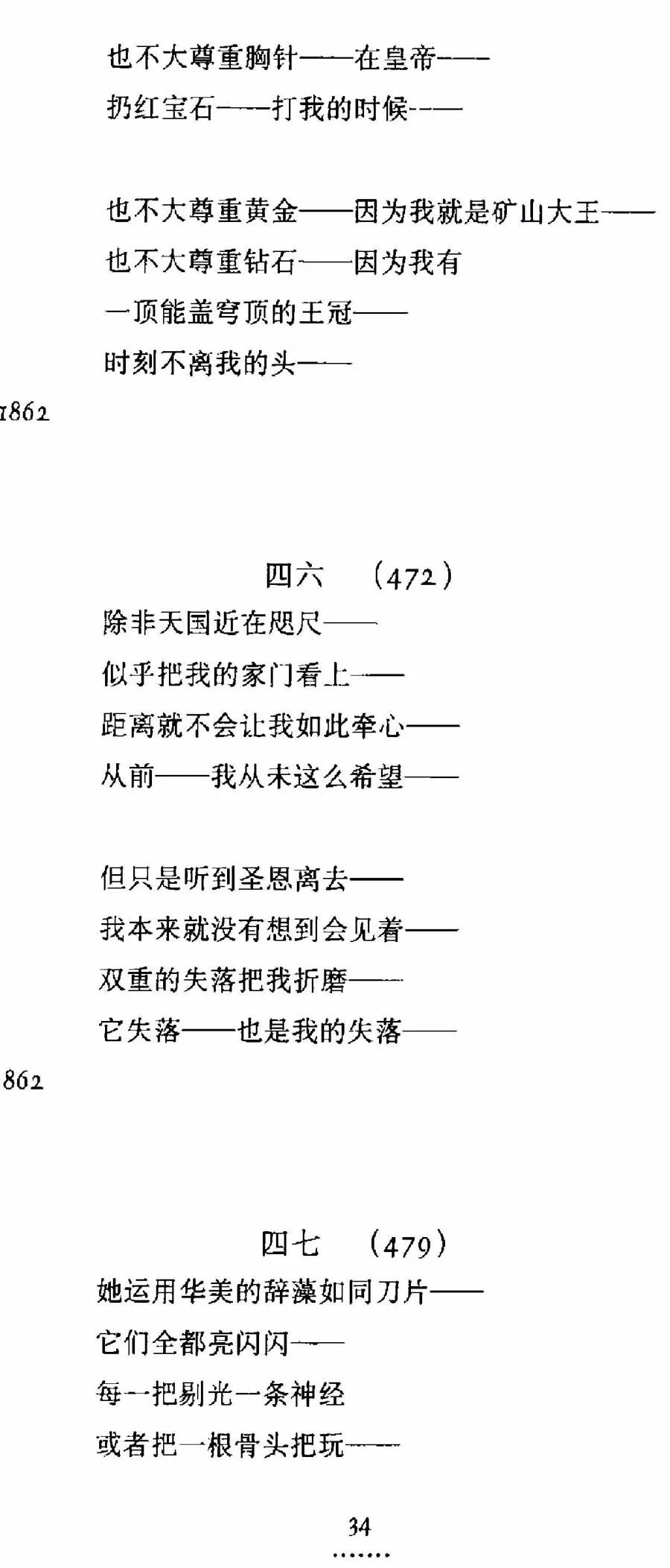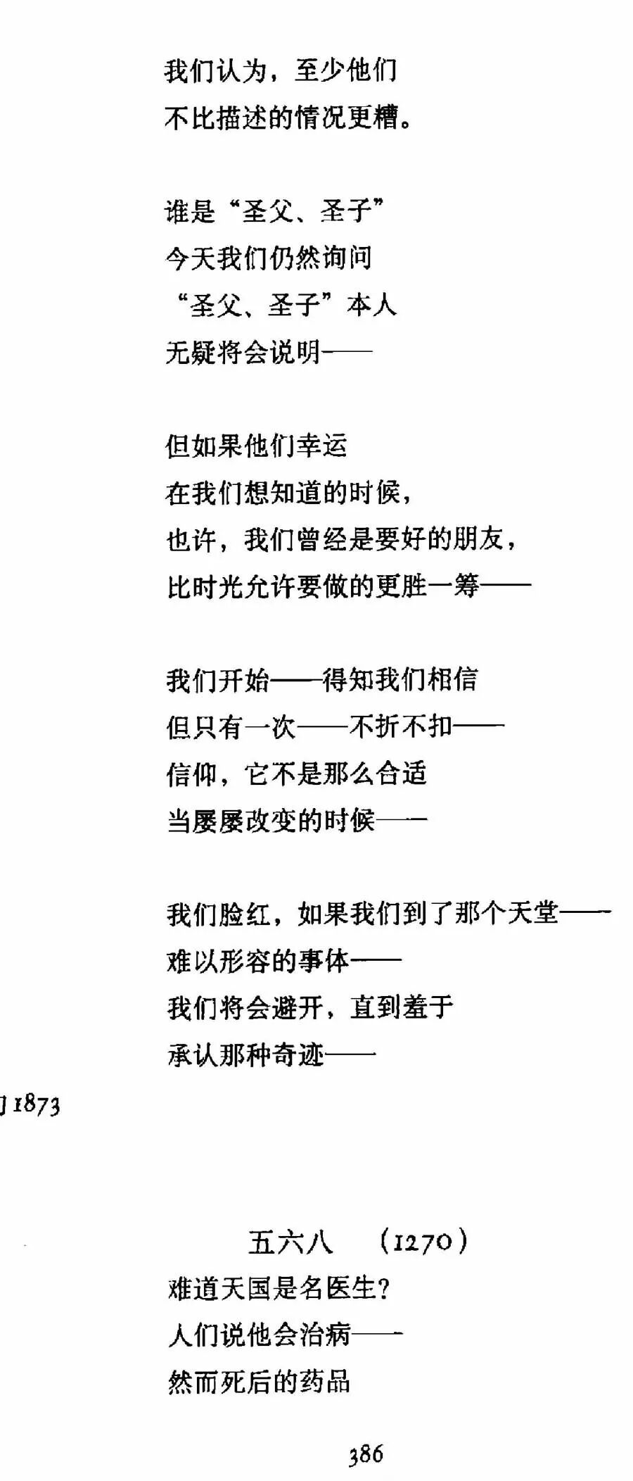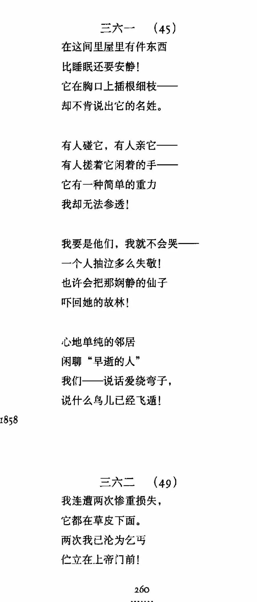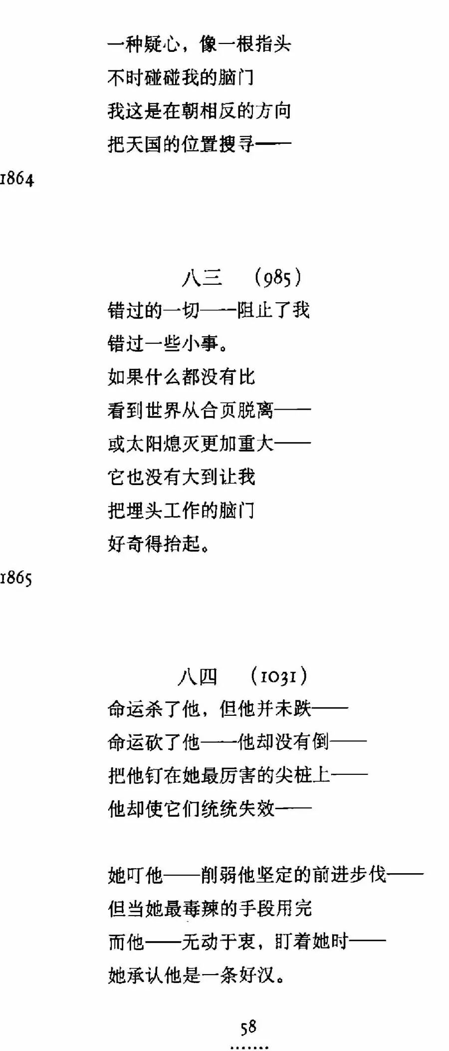 艾米莉·伊丽莎白·狄金森(英语:Emily Elizabeth Dickinson,又译艾弥莉‧狄瑾荪或埃米莉·狄更生,1830年12月10日-1886年5月15日),美国诗人。诗风凝炼,比喻尖新,常置格律以至语法于不顾。生前只发表过10首诗,默默无闻,死后近70年开始得到文学界的认真关注,被现代派诗人追认为先驱。与同时代的惠特曼,一同被奉为美国最伟大诗人,后世对她的诗艺、恋爱生活、性取向多有揣测。