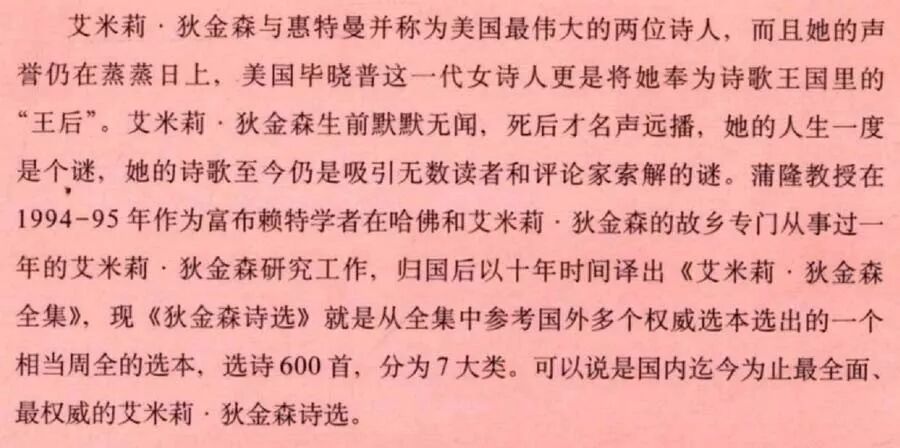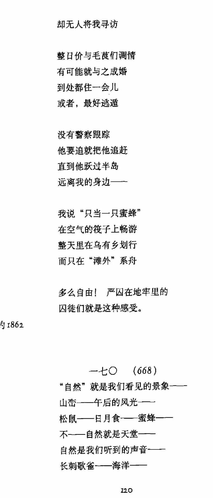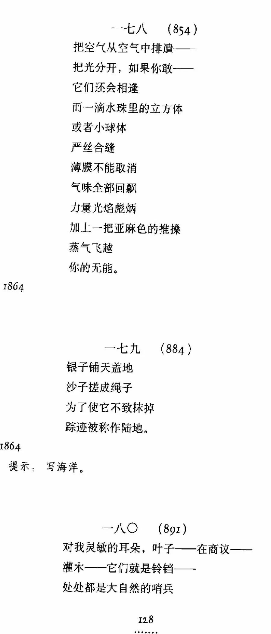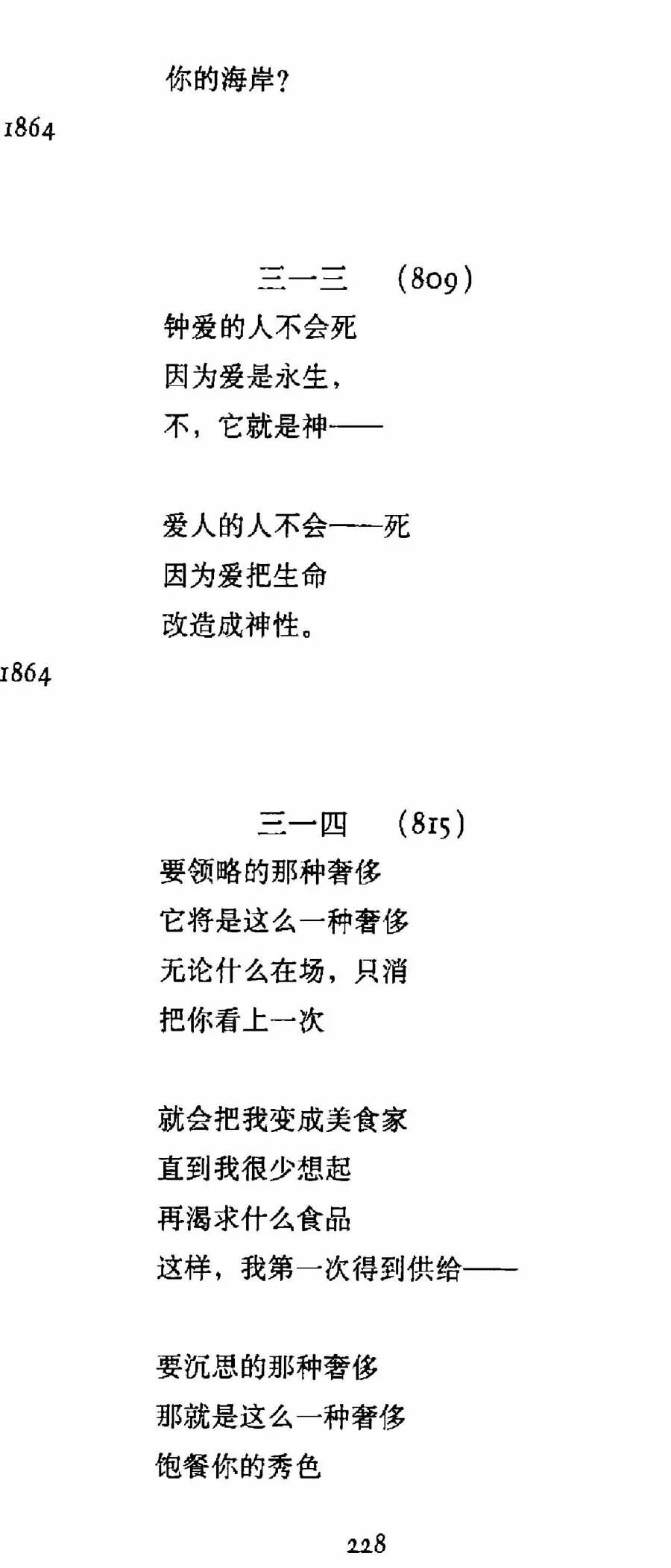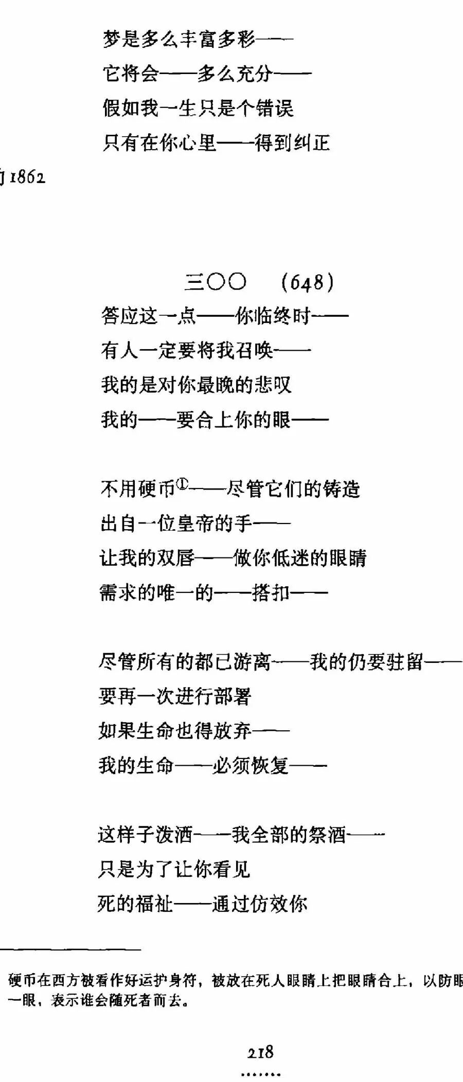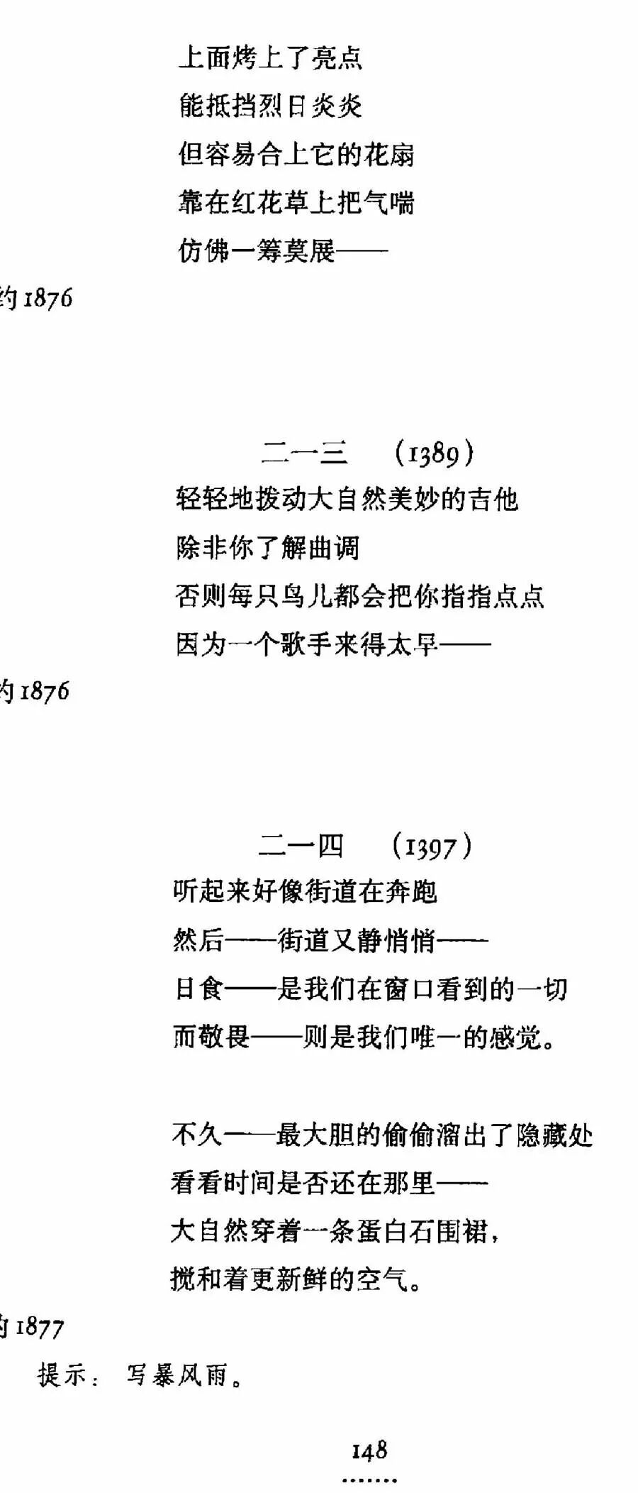 艾米莉·伊丽莎白·狄金森(英语:Emily Elizabeth Dickinson,又译艾弥莉‧狄瑾荪或埃米莉·狄更生,1830年12月10日-1886年5月15日),美国诗人。诗风凝炼,比喻尖新,常置格律以至语法于不顾。生前只发表过10首诗,默默无闻,死后近70年开始得到文学界的认真关注,被现代派诗人追认为先驱。与同时代的惠特曼,一同被奉为美国最伟大诗人,后世对她的诗艺、恋爱生活、性取向多有揣测。