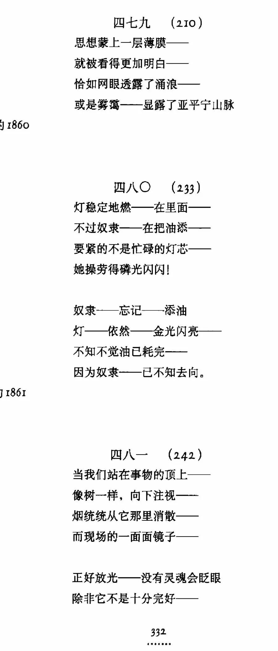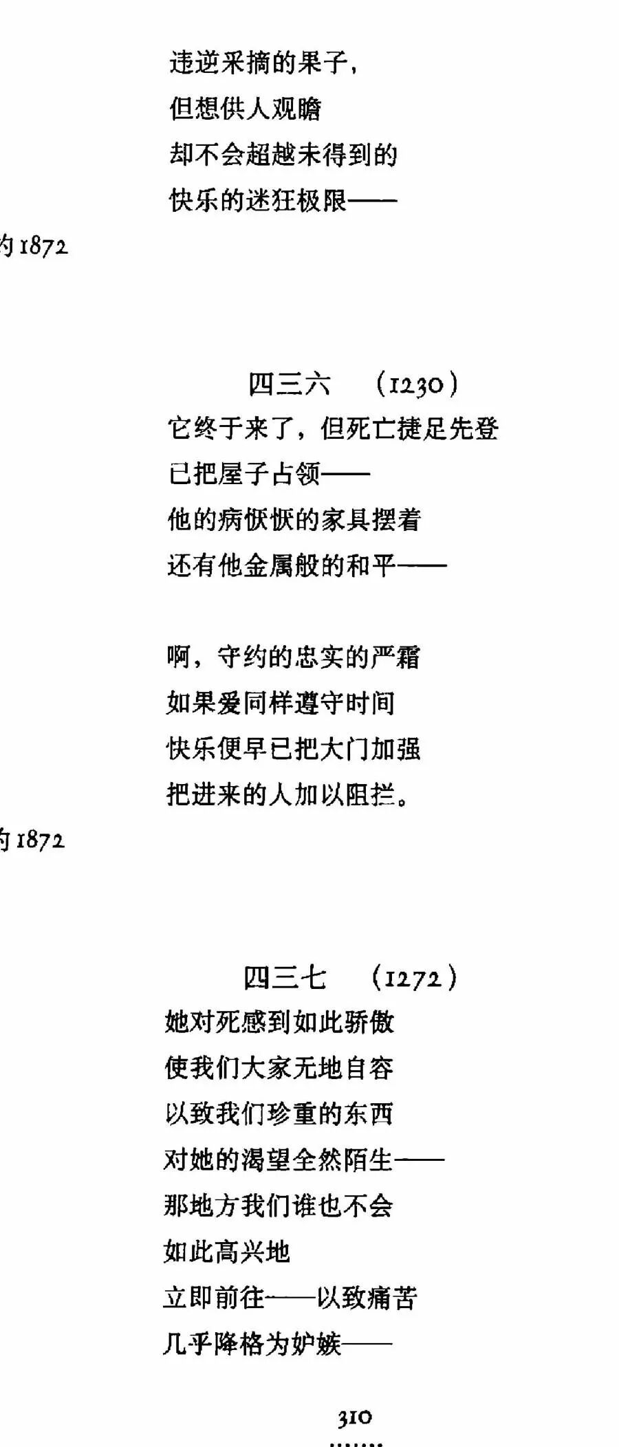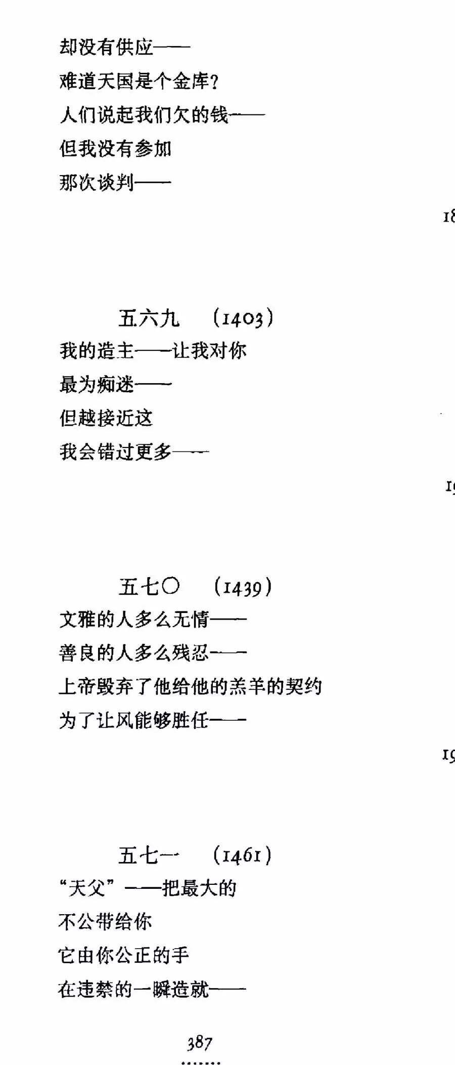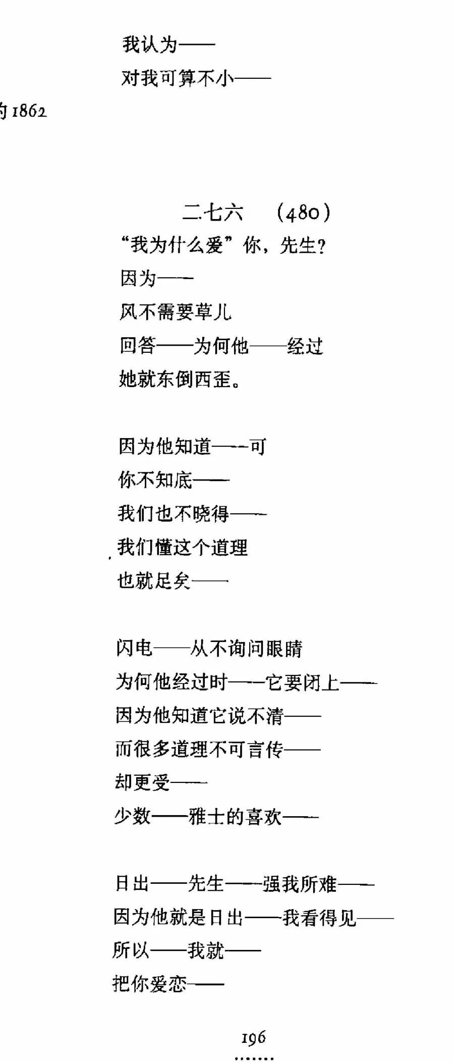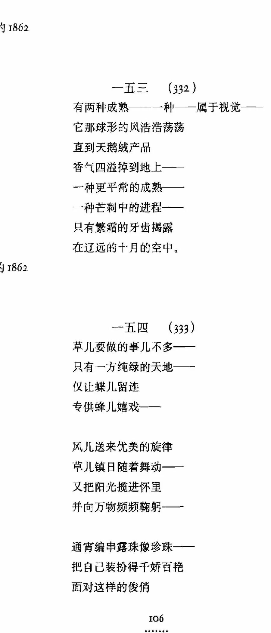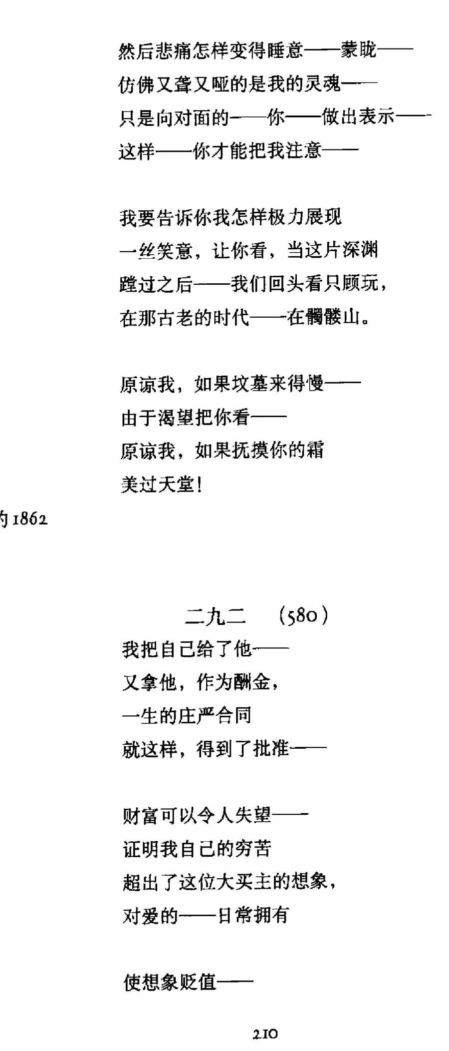 艾米莉·伊丽莎白·狄金森(英语:Emily Elizabeth Dickinson,又译艾弥莉‧狄瑾荪或埃米莉·狄更生,1830年12月10日-1886年5月15日),美国诗人。诗风凝炼,比喻尖新,常置格律以至语法于不顾。生前只发表过10首诗,默默无闻,死后近70年开始得到文学界的认真关注,被现代派诗人追认为先驱。与同时代的惠特曼,一同被奉为美国最伟大诗人,后世对她的诗艺、恋爱生活、性取向多有揣测。