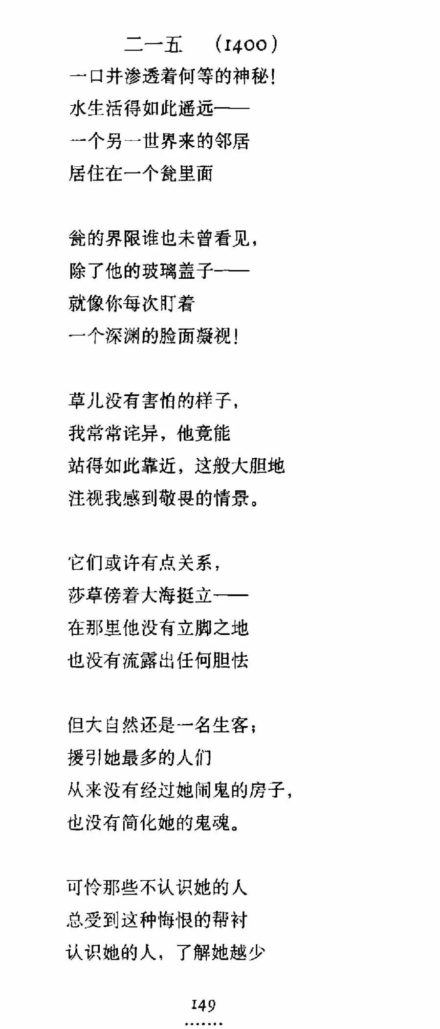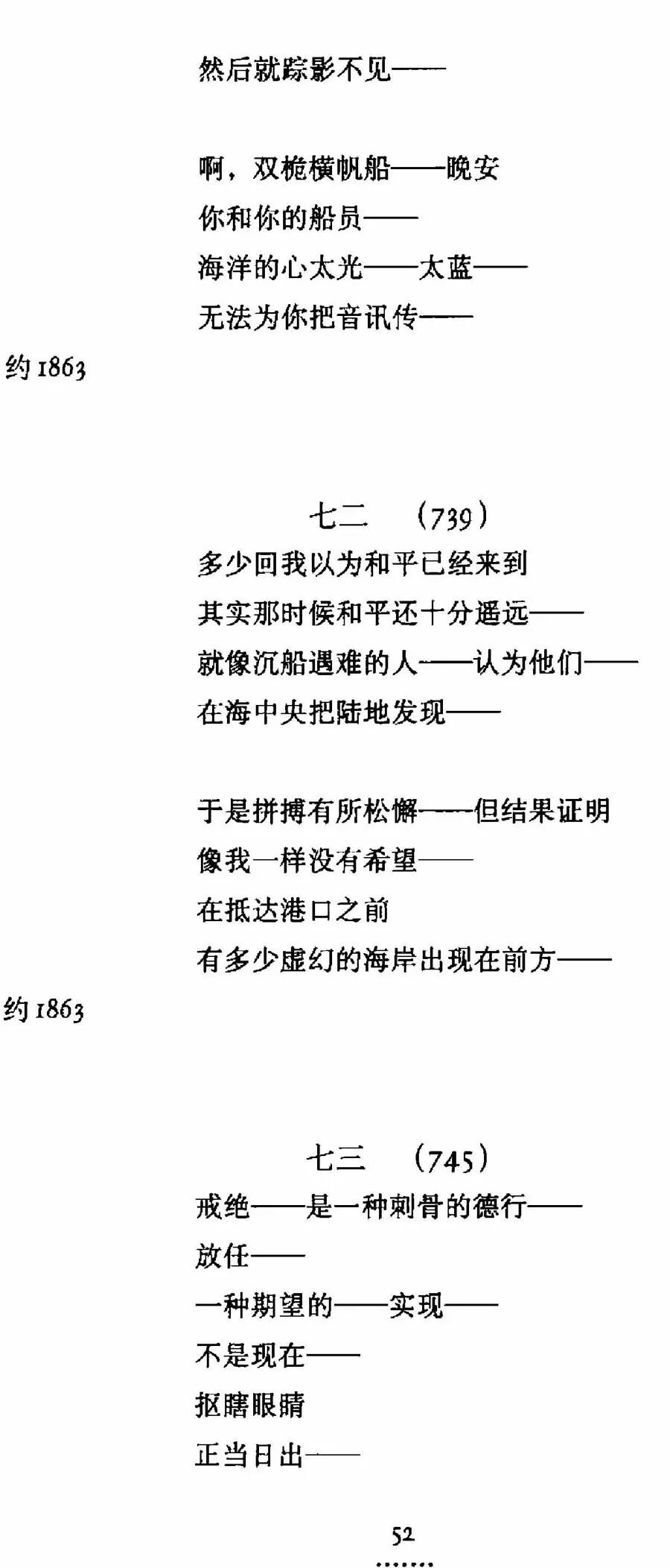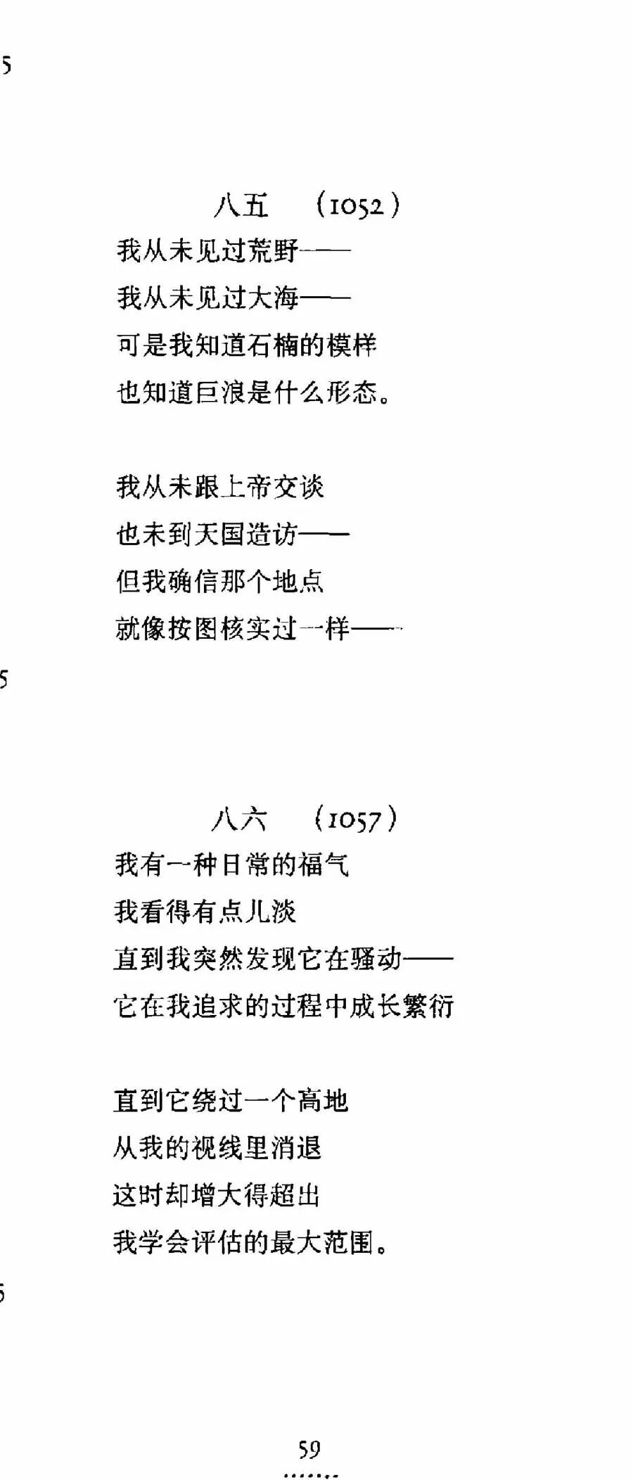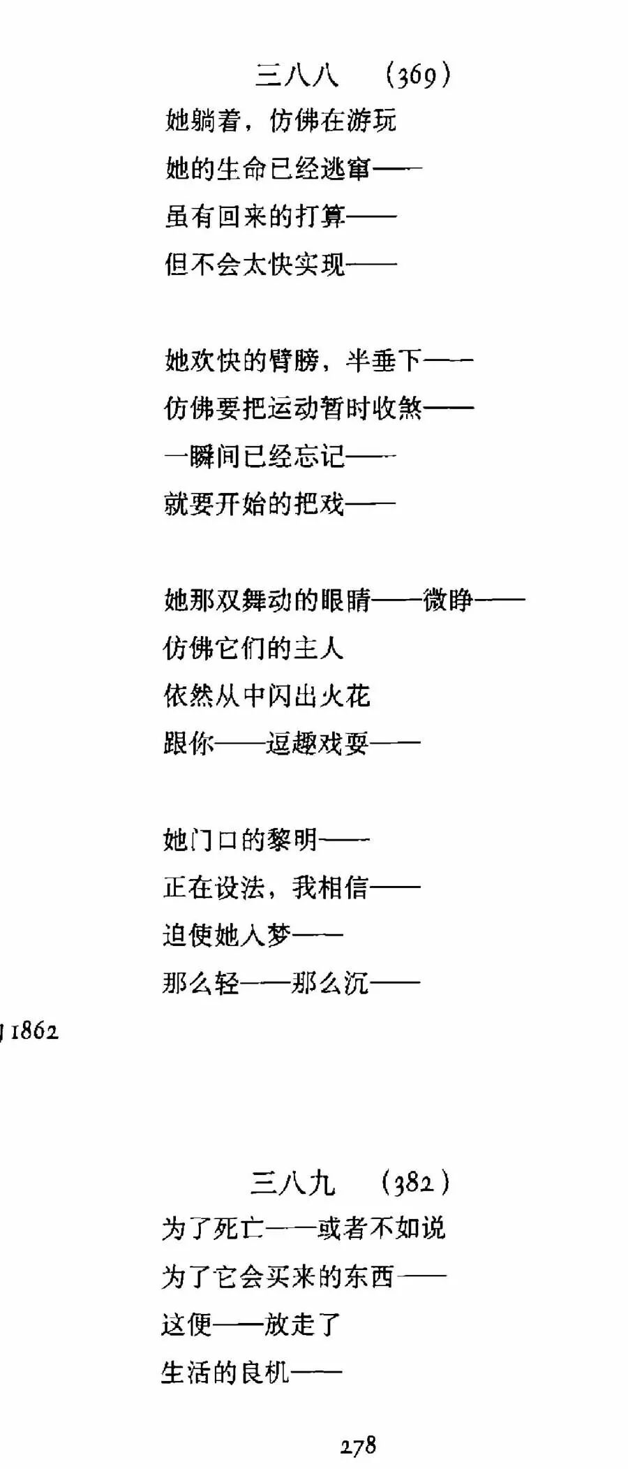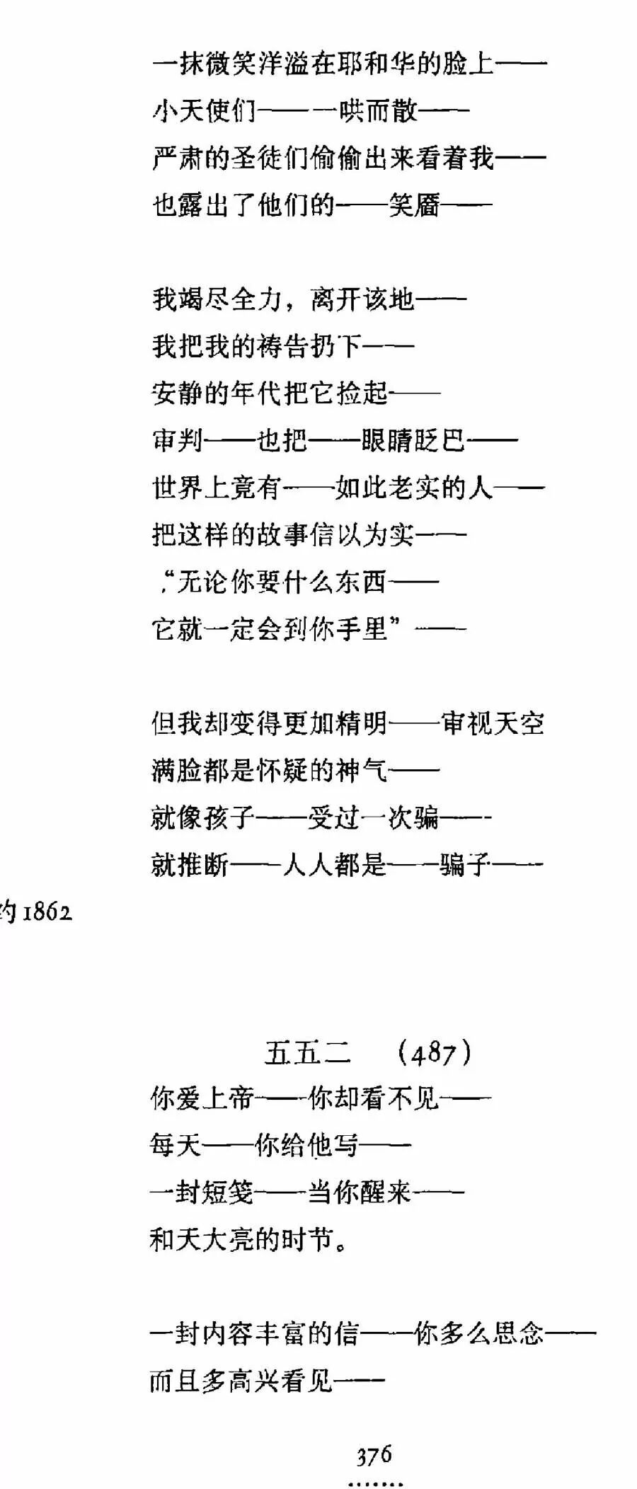 艾米莉·伊丽莎白·狄金森(英语:Emily Elizabeth Dickinson,又译艾弥莉‧狄瑾荪或埃米莉·狄更生,1830年12月10日-1886年5月15日),美国诗人。诗风凝炼,比喻尖新,常置格律以至语法于不顾。生前只发表过10首诗,默默无闻,死后近70年开始得到文学界的认真关注,被现代派诗人追认为先驱。与同时代的惠特曼,一同被奉为美国最伟大诗人,后世对她的诗艺、恋爱生活、性取向多有揣测。