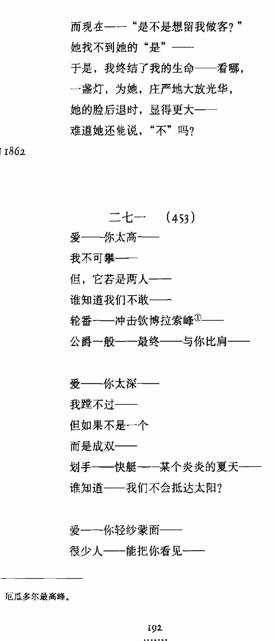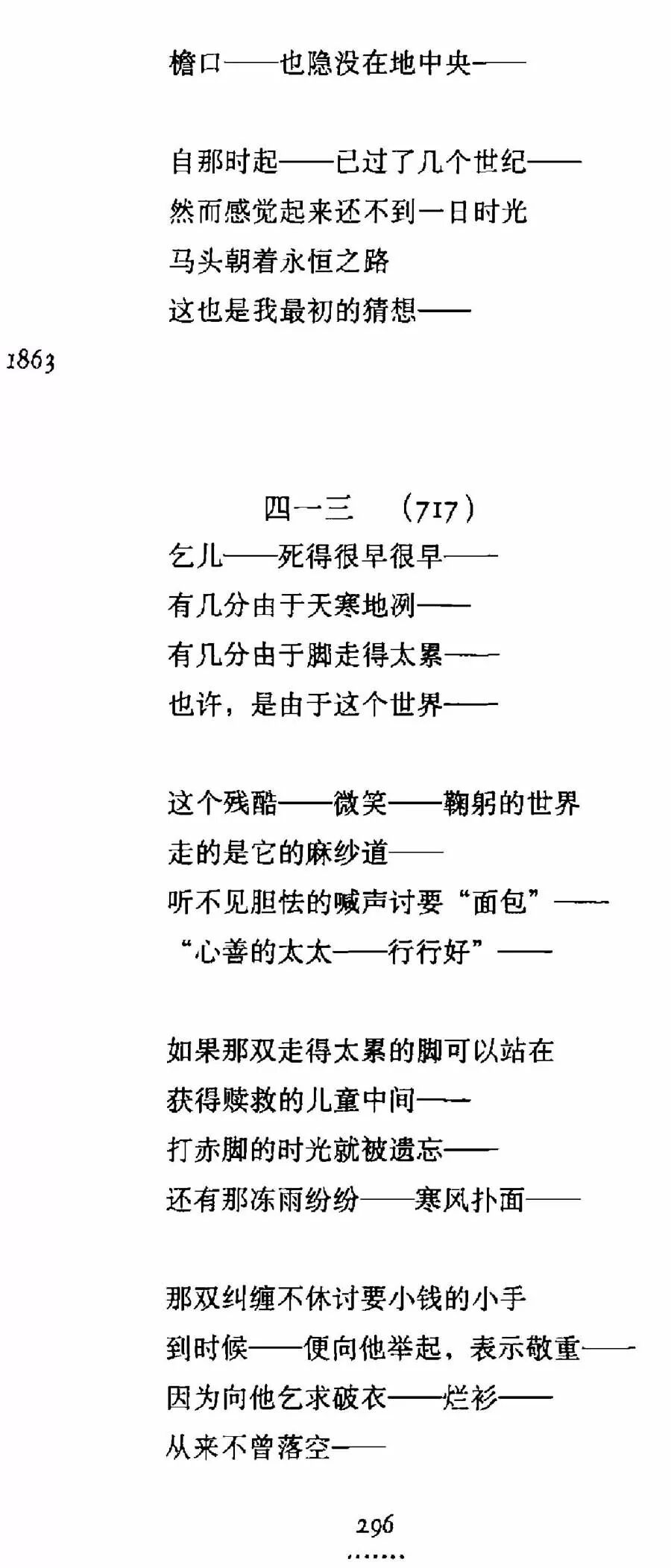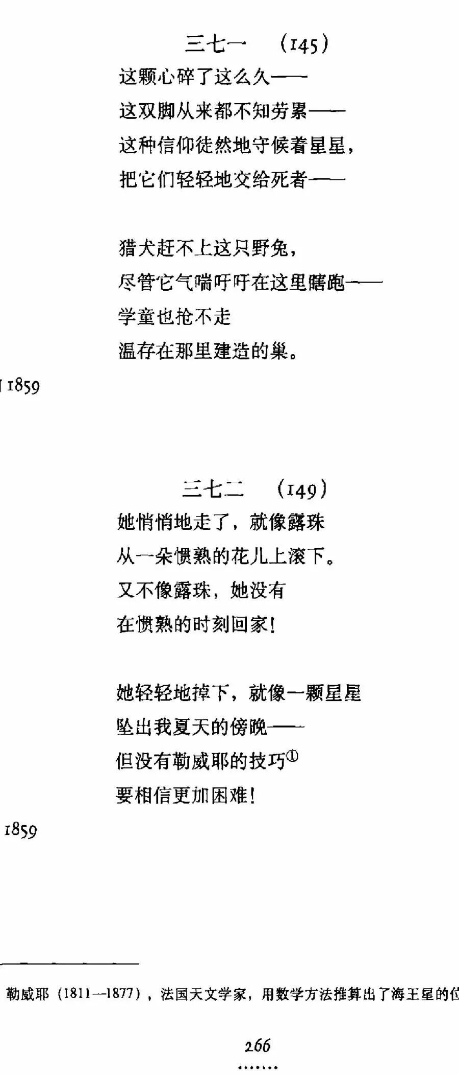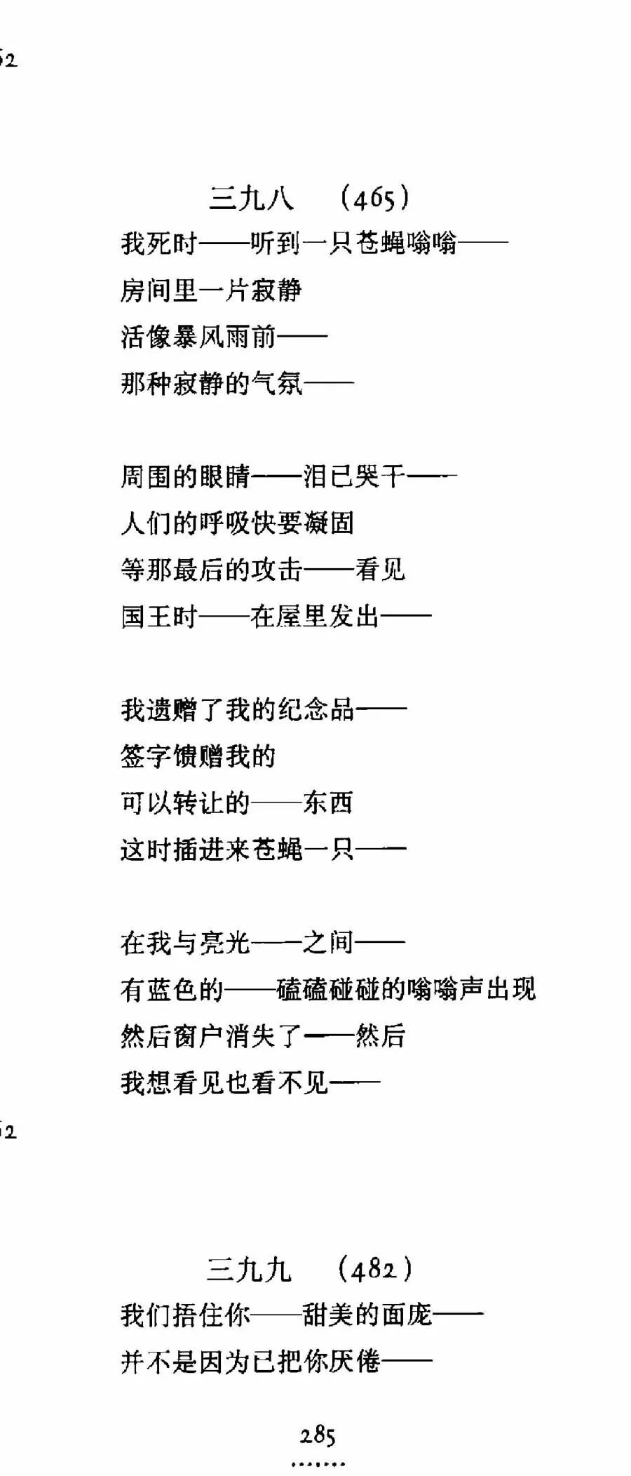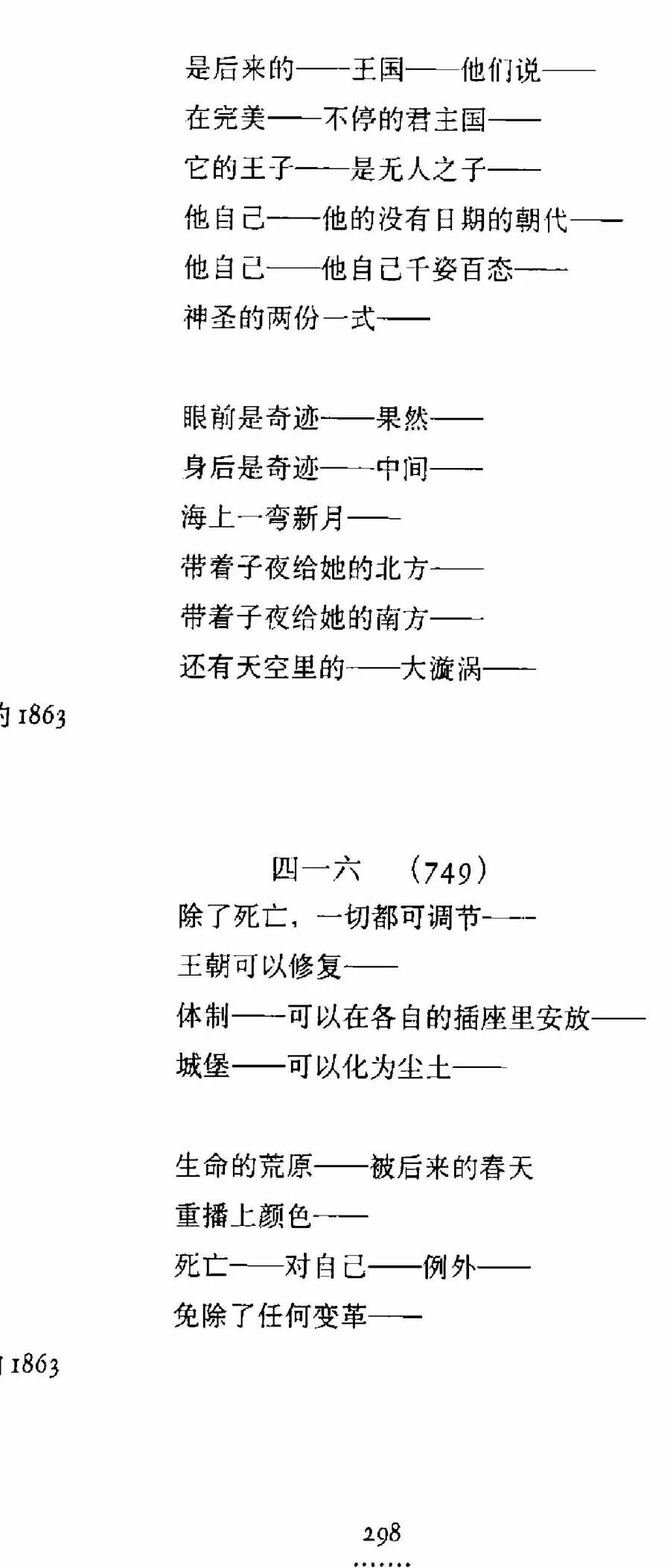 艾米莉·伊丽莎白·狄金森(英语:Emily Elizabeth Dickinson,又译艾弥莉‧狄瑾荪或埃米莉·狄更生,1830年12月10日-1886年5月15日),美国诗人。诗风凝炼,比喻尖新,常置格律以至语法于不顾。生前只发表过10首诗,默默无闻,死后近70年开始得到文学界的认真关注,被现代派诗人追认为先驱。与同时代的惠特曼,一同被奉为美国最伟大诗人,后世对她的诗艺、恋爱生活、性取向多有揣测。
