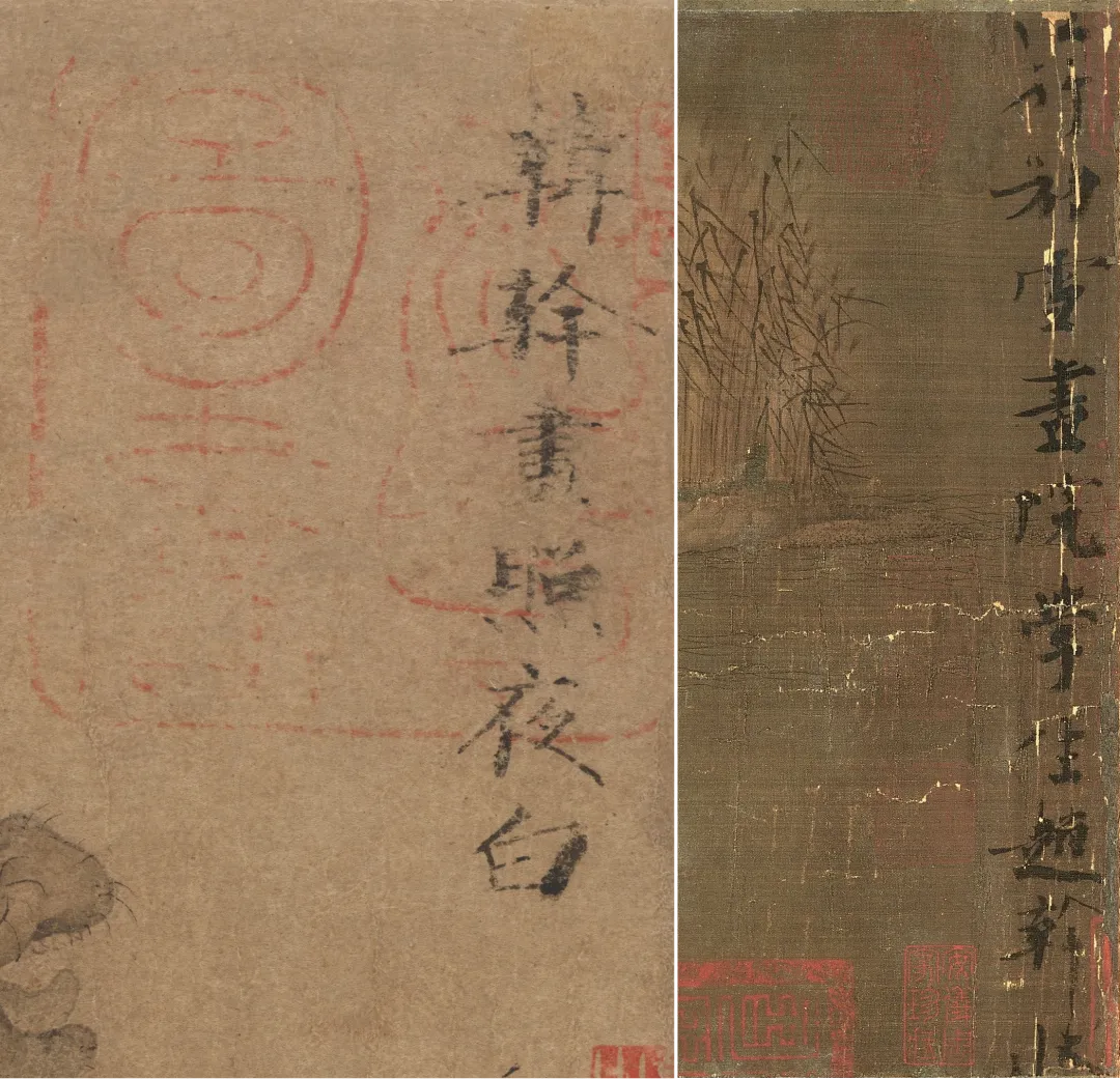 左:唐 韩幹 照夜白局部 大都会博物馆藏右:南唐 赵幹 江行初雪图局部 台北故宫博物院藏两件画作曾收藏于南唐内府,题签部分疑为李煜亲笔