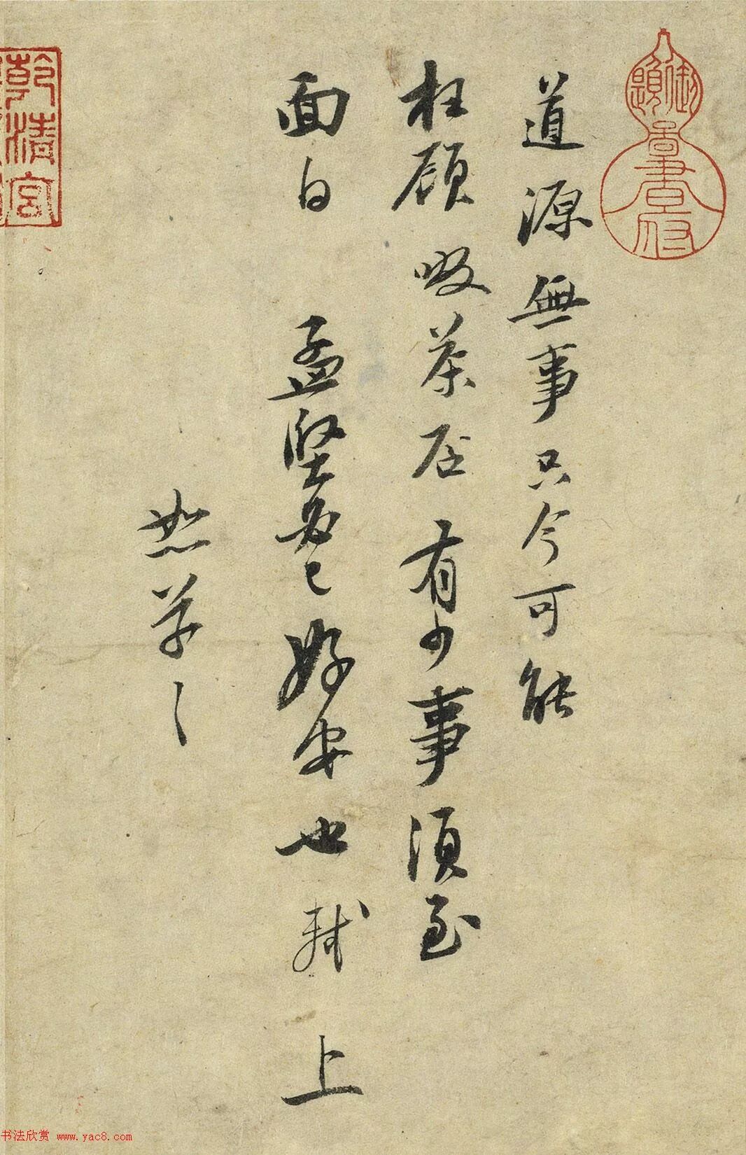 释文:道源无事 只今可能枉顾啜茶否 有少事须至面白 孟坚必已好安也 轼上 恕草草