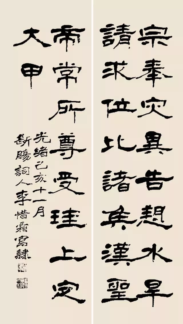 隶书,学杨岘,方圆兼用,方笔棱峭,圆笔轻细。