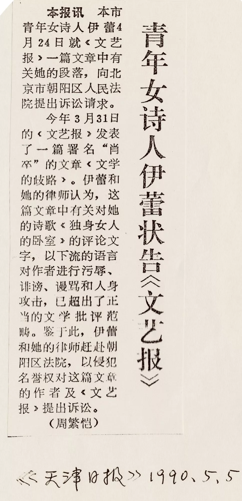 你以为我出了北京就完了吗?不行,我回到天津立即跟冯景元通话,商量。他说《天津日报》记者周繁凯,是个资深记者、作家,不怕事。于是我把新闻稿交给了他。5月4日晚上,他值夜班,告诉排版的人说有一个文章要发,让他在“电视预告栏”旁留个位置。5月5日早晨,《天津日报》第三版刊出本报讯:“青年女诗人伊蕾状告《文艺报》”。主编看到大为恼火,问,这是谁干的?答,周繁凯。
