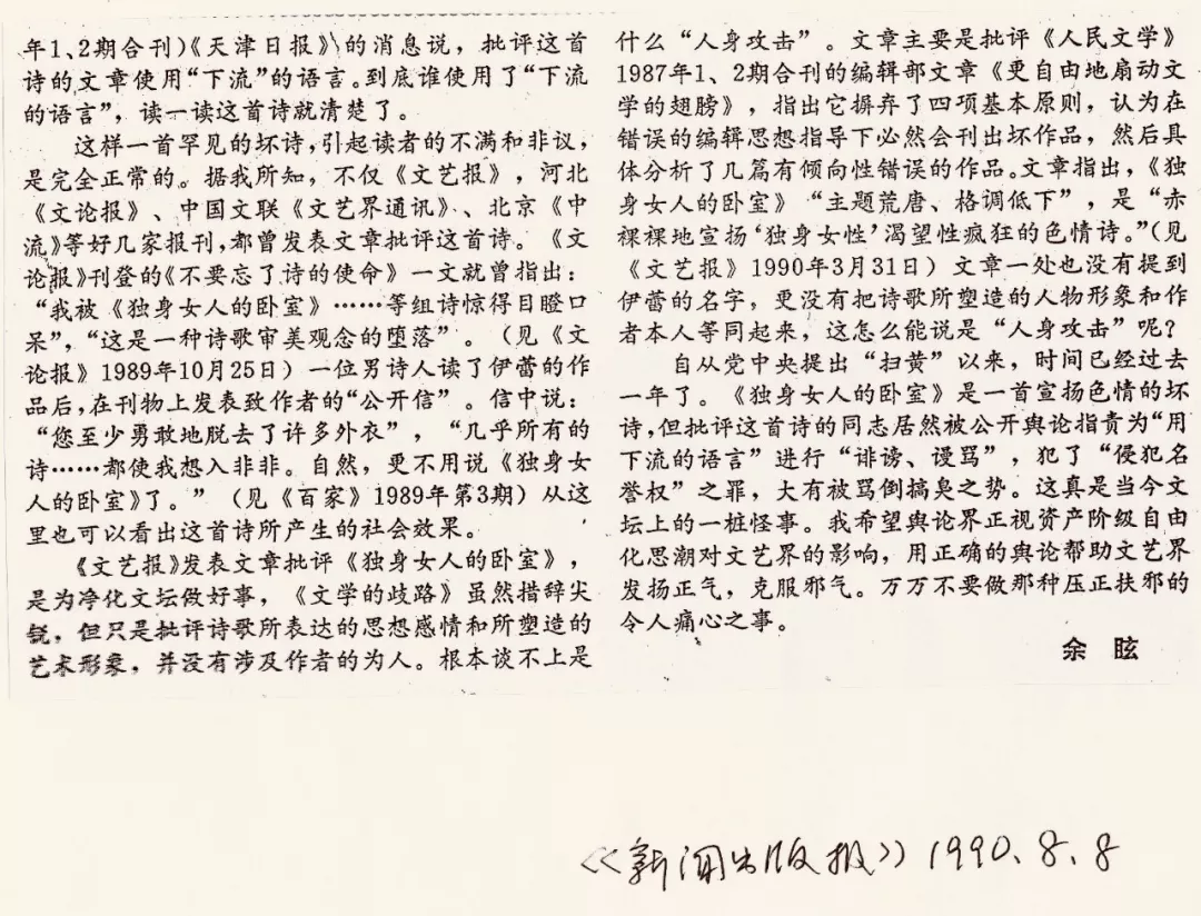 又过了一个月,8月8日,《新闻出版报》反转态度,刊登了余眩的文章,题目是《来函照登》,说:“这样一首罕见的坏诗,引起读者的不满和非议,是完全正常的……希望舆论界……万万不要做这种压正扶邪的令人痛心之事。”