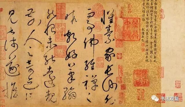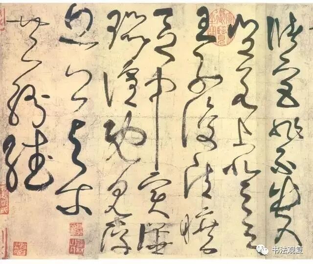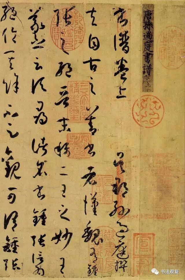 张旭的书法,始化于张芝、二王一路,以草书成就最高。史称“草圣”。他自己以继承“二王”传统为自豪,字字有法,另一方面又效法张芝草书之艺,创造出潇洒磊落,变幻莫测的狂草来,其状惊世骇俗。相传他见公主与担夫争道,又闻鼓吹而得笔法之意;在河南邺县时爱看公孙大娘舞西河剑器,并因此而得草书之神。颜真卿曾两度辞官向他请教笔法。张旭是一位纯粹的艺术家,他把满腔情感倾注在点画之间,旁若无人,如醉如痴,如癫如狂。