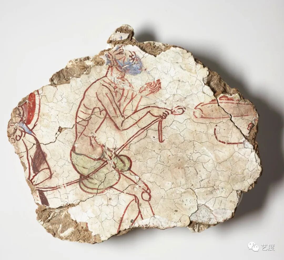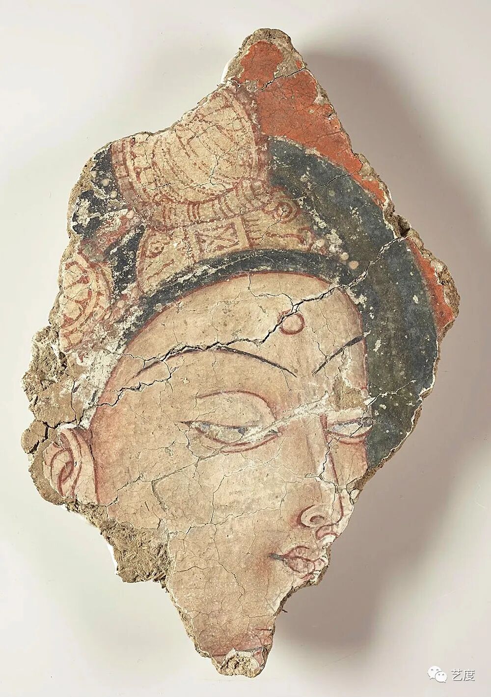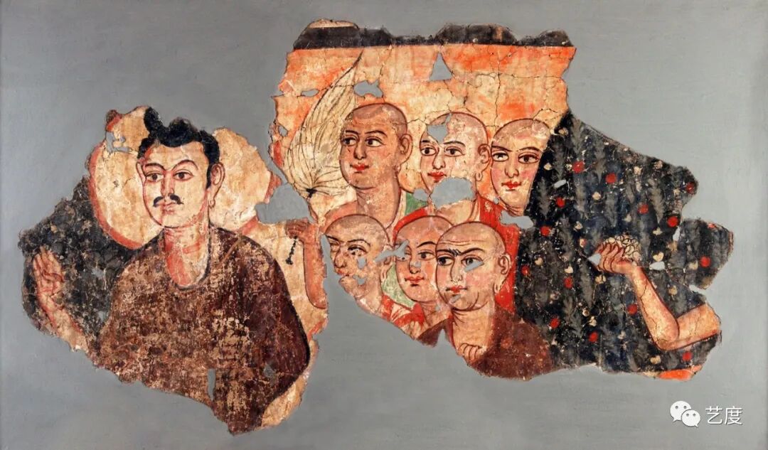 1906-1907年,斯坦因先后两次对米兰遗址进行发掘,盗掘走了大量珍贵的文物,尤以“有翼天使”壁画最为著名。下面这件佛弟子壁画与“有翼天使”出土于同一个地方,现藏印度国家博物馆,由于当时英属印度政府有资助斯坦因的探险活动,作为回报,发掘的部分文物赠与印度。