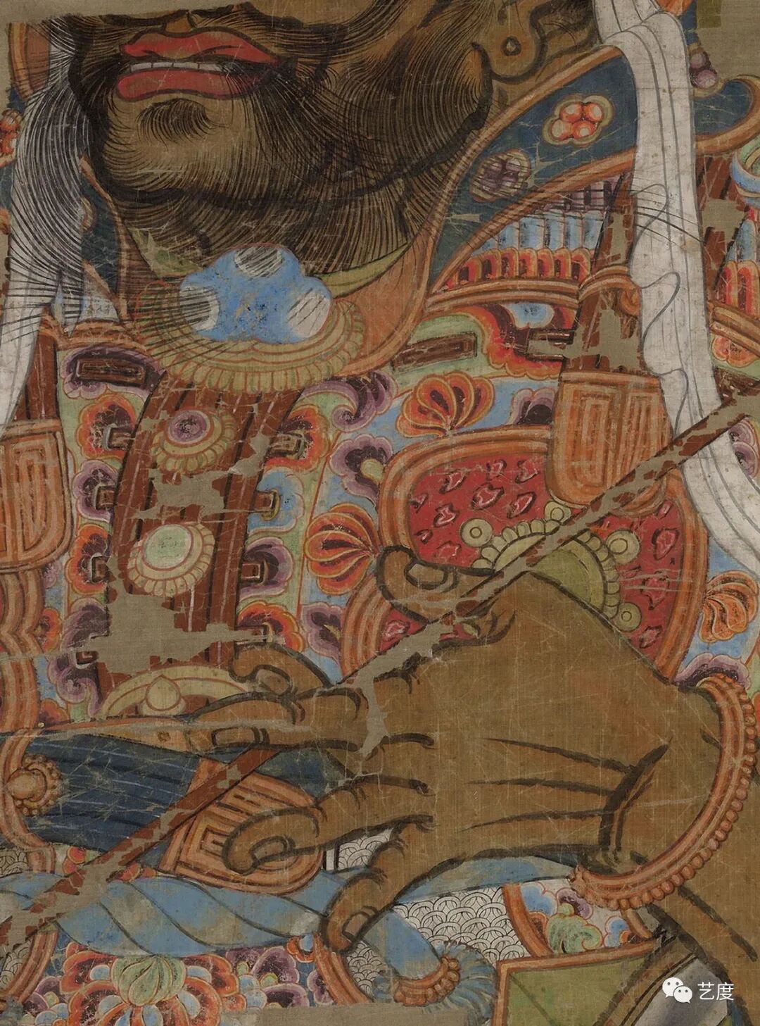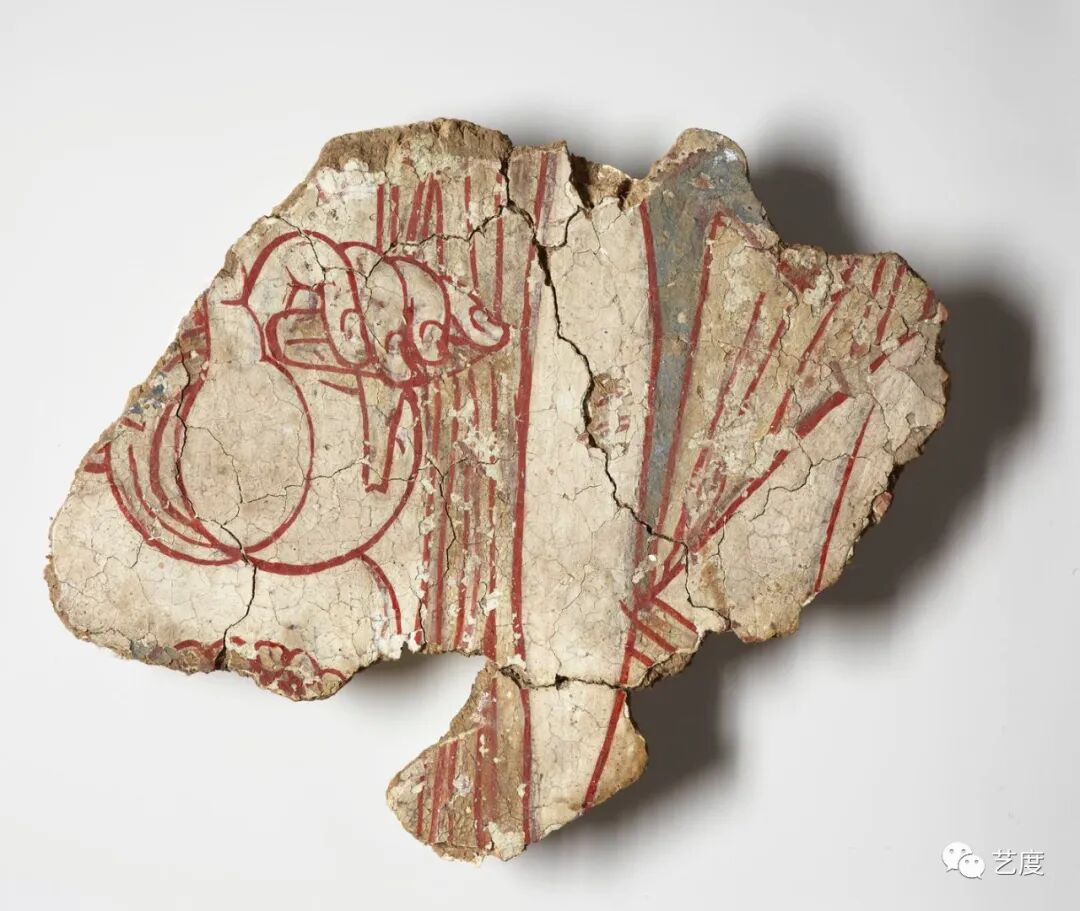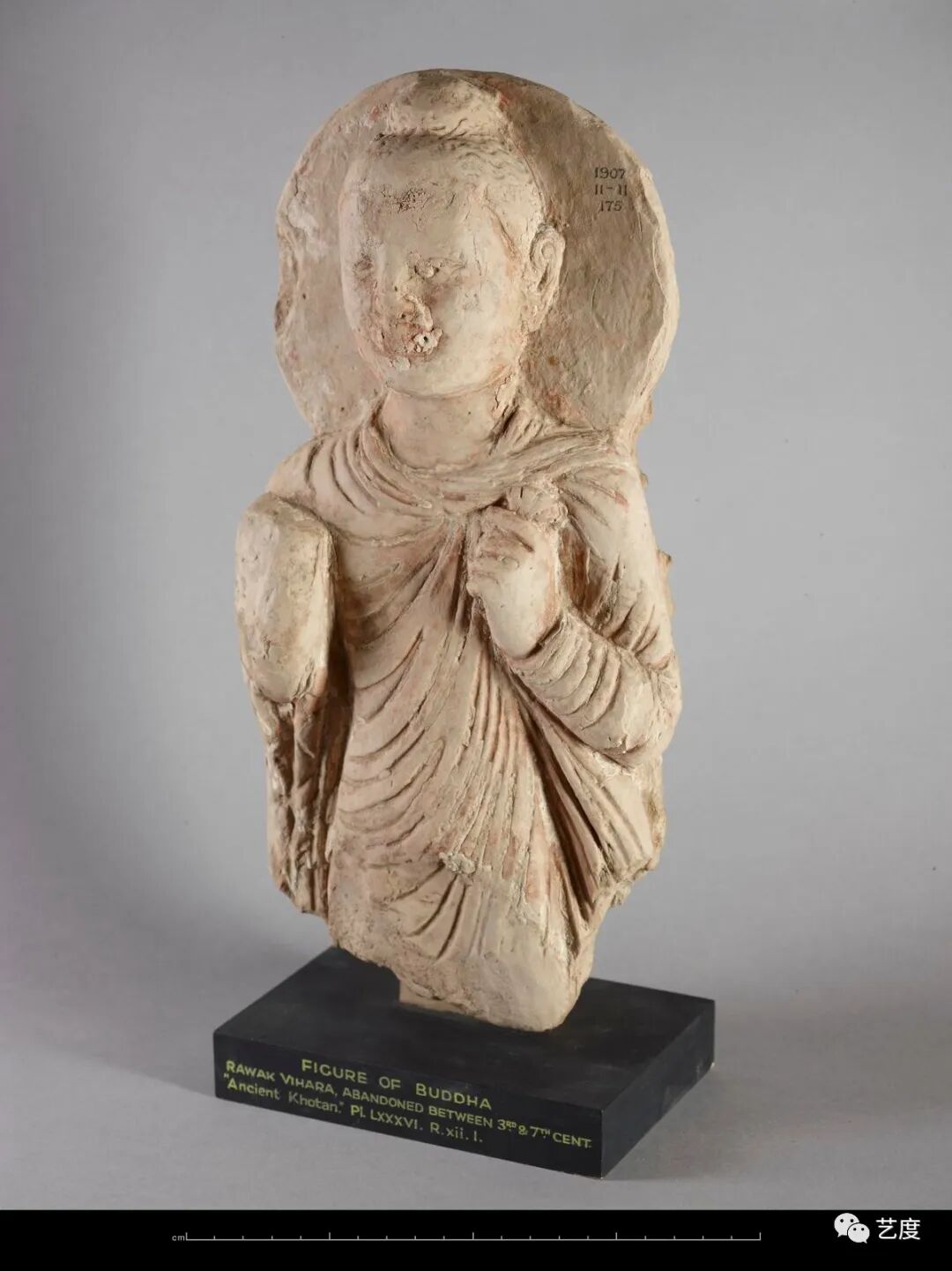 1906-1907年,斯坦因先后两次对米兰遗址进行发掘,盗掘走了大量珍贵的文物,尤以“有翼天使”壁画最为著名。下面这件佛弟子壁画与“有翼天使”出土于同一个地方,现藏印度国家博物馆,由于当时英属印度政府有资助斯坦因的探险活动,作为回报,发掘的部分文物赠与印度。