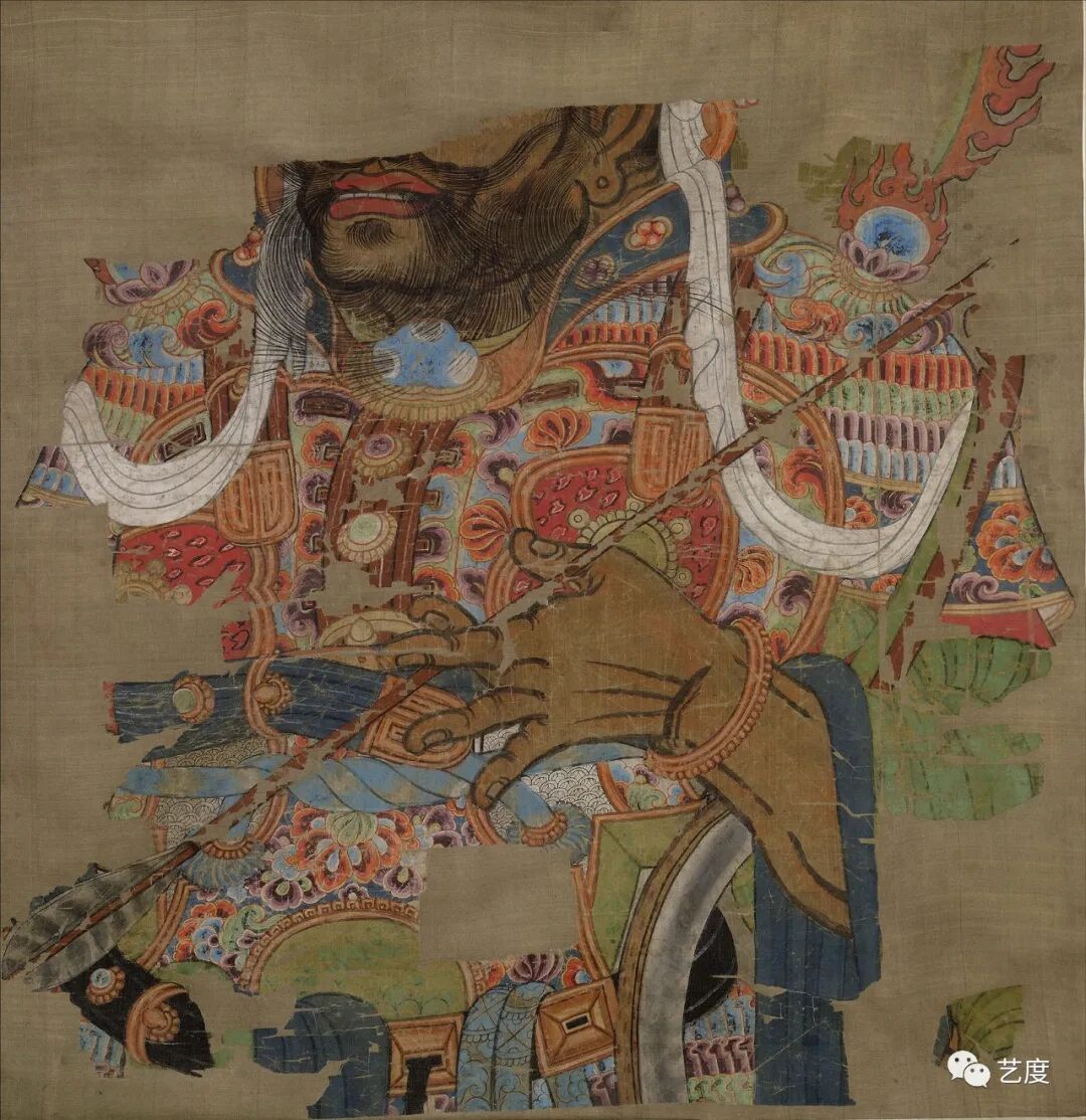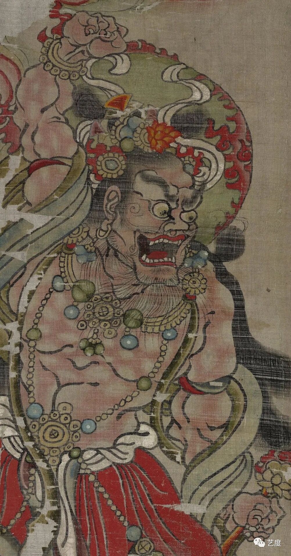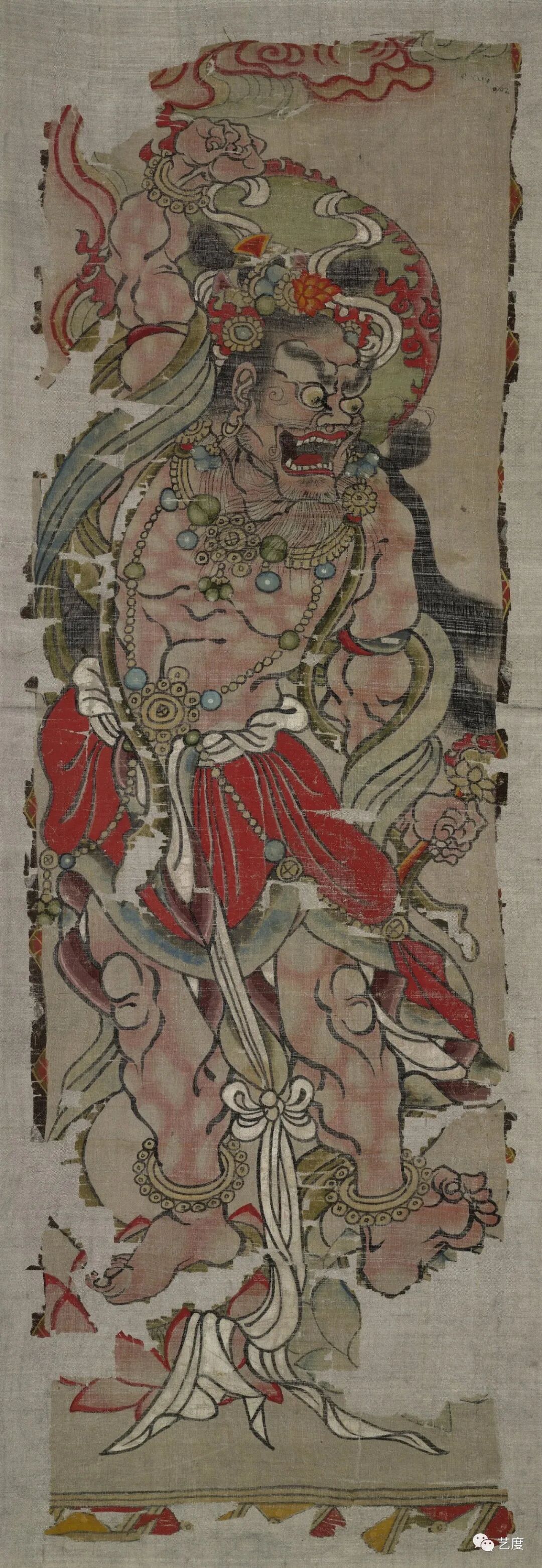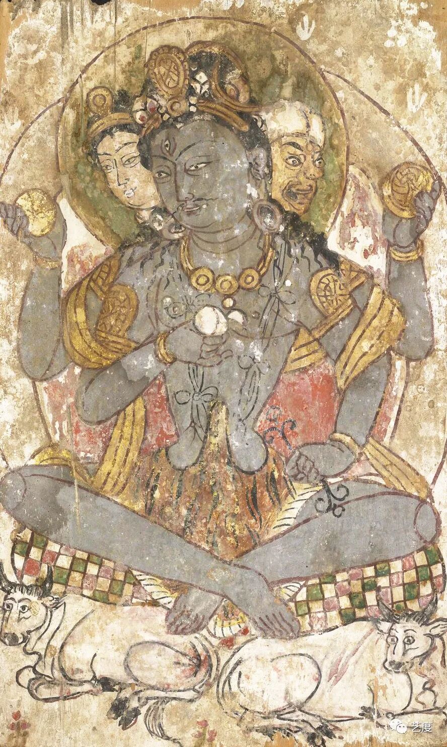 《波斯菩萨》画板,是斯坦因在丹丹乌里克一座佛寺的小方屋里发现的,双面绘制,正面有一尊坐姿神像;背后“绘的是印度式三头魔王”,三面四臂,手持日月和金刚杵等,中间额头有第三只眼。