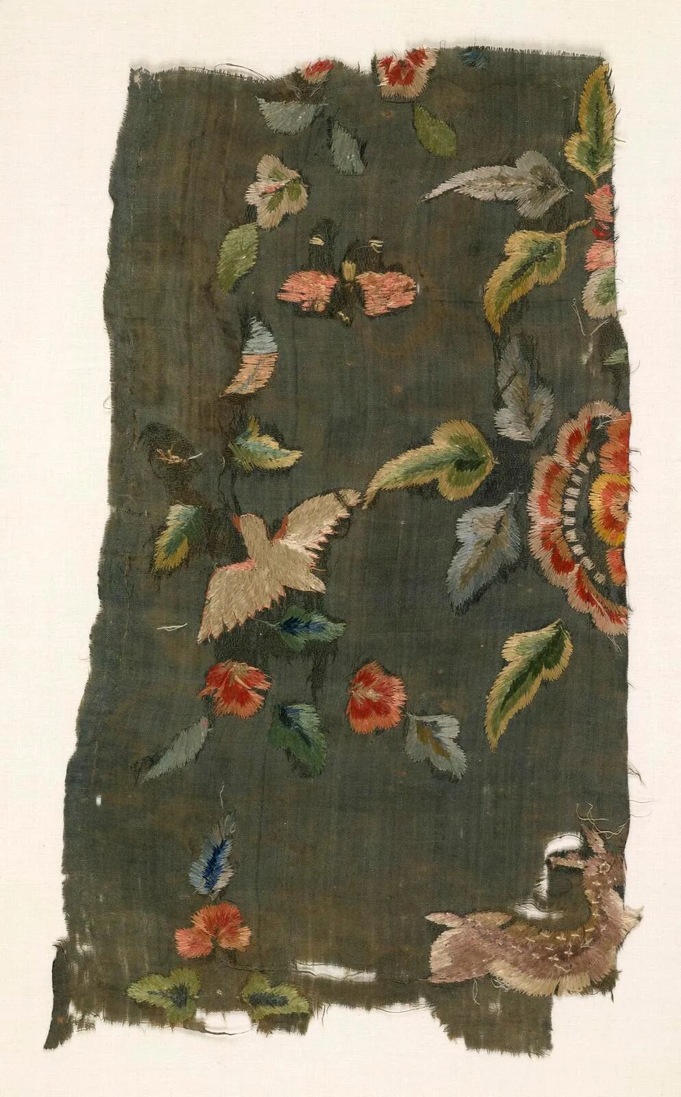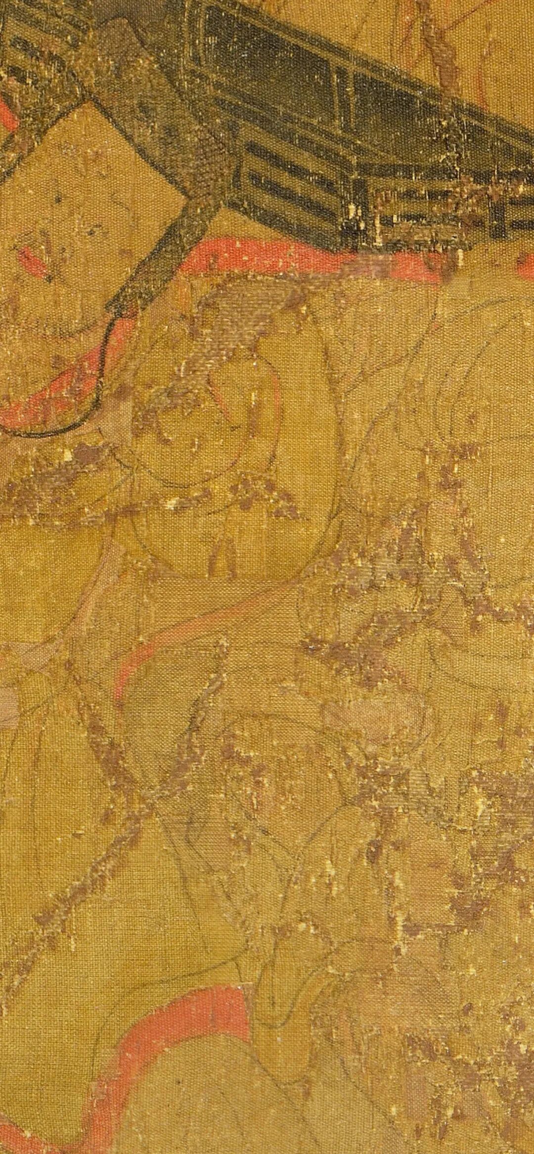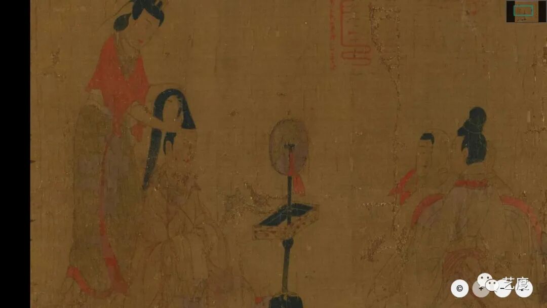 比如大英博物馆中国藏品中最著名的一件就是传为顾恺之的《洛神赋》图卷,我选取了一个对镜梳妆的局部,绢上的破损在官网上也能看的一清二楚。