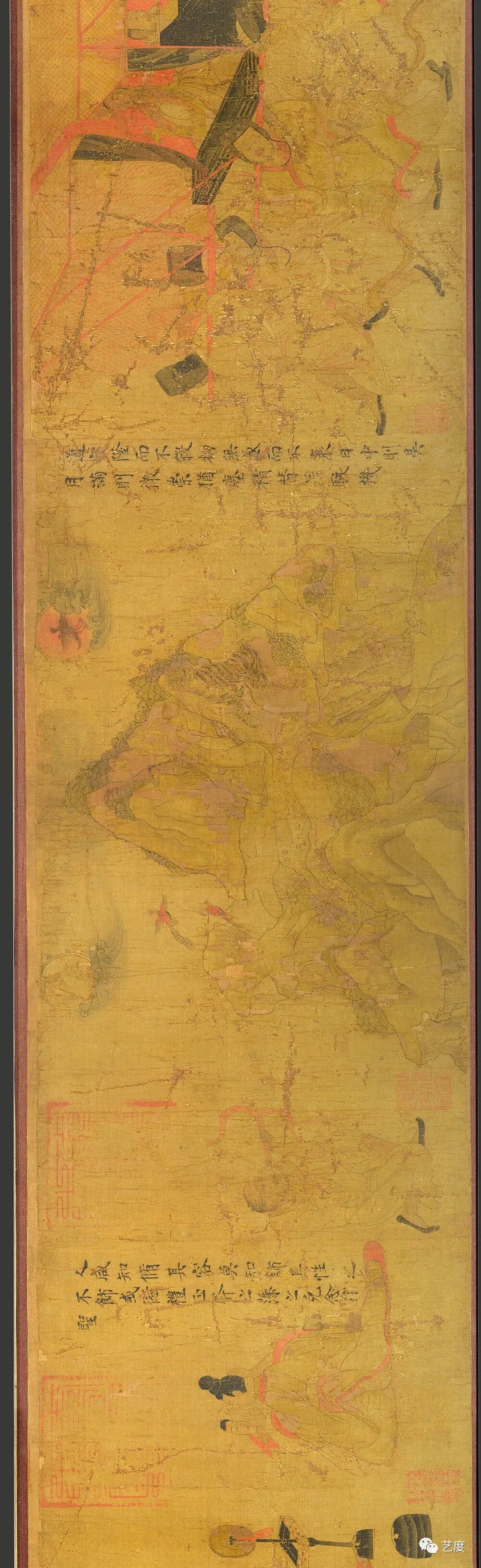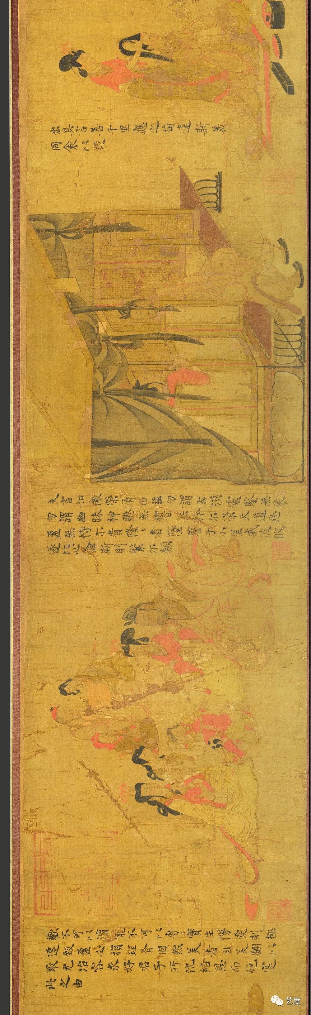 它最早见于记录是宋徽宗时期,传世几百年留下了大量藏家的印章,最后成为了乾隆皇帝的收藏。这幅画卷并不完整,十二幅场景中的前三幅场景已经丢失。