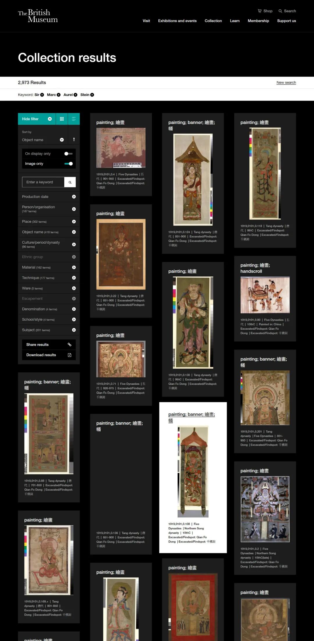 如今在大英博物馆官网上检索斯坦因(“Sir Marc Aurel Stein”)关键词,会发现2973件文物的图像可供下载。