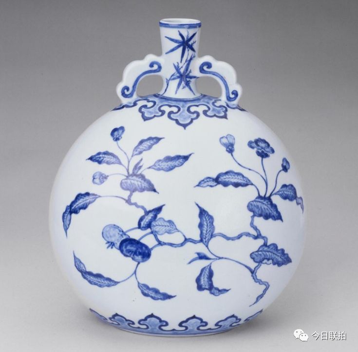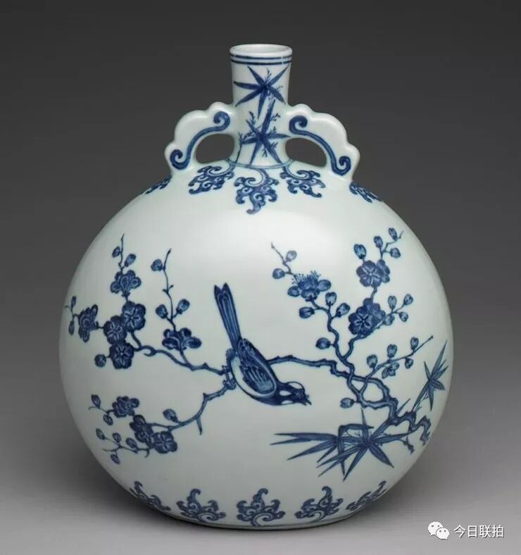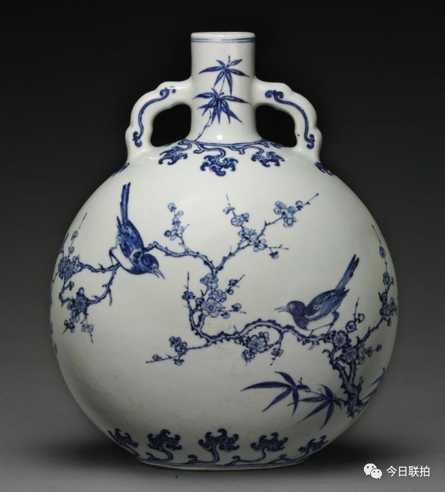 本器为清雍正仿明永宣青花瓷,造型源自阿拉伯铜器。壶小圆口,直颈,扁圆形腹,椭圆形底无足,平砂底无釉,肩部饰对称的如意形双耳,许之衡称为「口际飘双带」,使作品于整体视觉效果上达到均衡虚实之美。通体以青花装饰,颈部绘青花翠竹,肩部及胫部绘变形花卉,腹部两面绘折枝花鸟图,分别绘白头翁伫立于梅枝、桃茎之上,姿态各异,青花淡雅略有晕散。底部亦饰云肩纹,笔法简洁洗练,细腻流畅。通体釉质莹洁温润,色泽沉稳高雅。无论在器形、纹饰风格上均为仿明永乐式样,是雍正仿永乐青花瓷器的佳作。