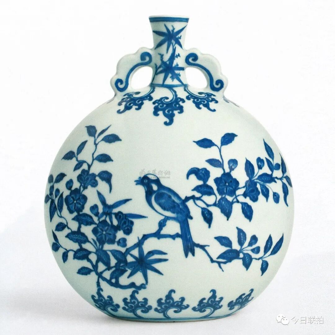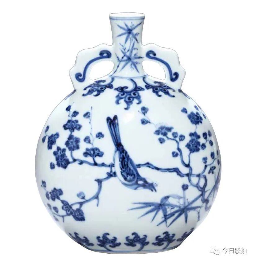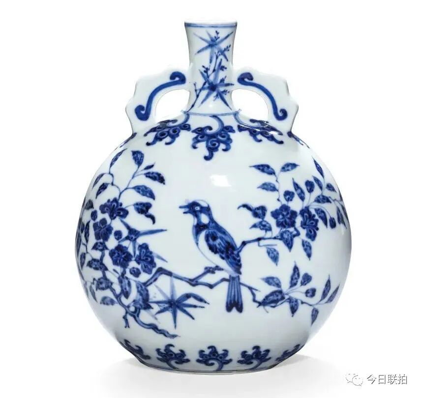 清雍正 仿明式青花「花鸟」纹双耳扁壶香港苏富比2011秋拍