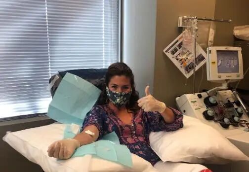 在索菲捐献血浆的社交媒体照片中,索菲戴着口罩和手套,接受医护人员抽血,并向人们竖起大拇指。