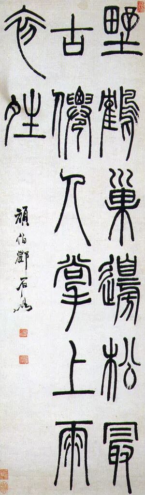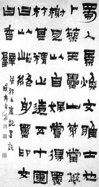 清代书法的复古可以说是一个猛回头,由于金石出土日多,士大夫热衷于金石考据,碑学便是借鉴钟鼎、秦篆、汉隶和六朝石刻的书风。著名的书家如金农、邓石如、吴昌硕、康有为等。