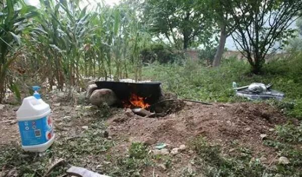 厨房不够用,在教室外面的玉米地旁,还有一口大锅。当天中午的羊肉萝卜就是在这里炖出来的,毕竟100来号人吃饭呀,小碗小盆搞不定。