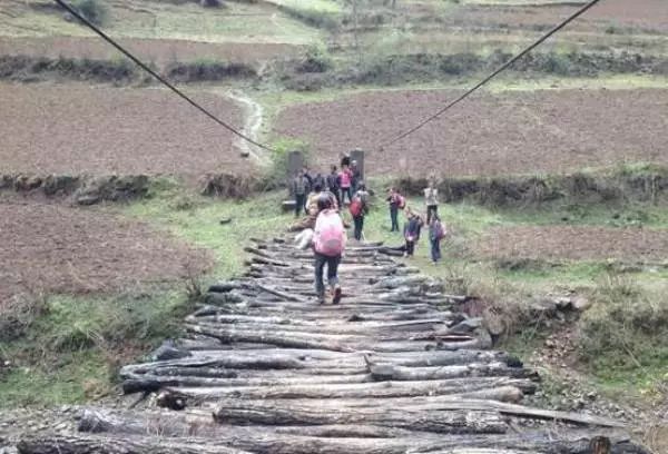 每次看到他们路上走,我都在心里替他们捏一把汗。木桥看上去已经有很多年历史,不知道承载了多少代的学生。